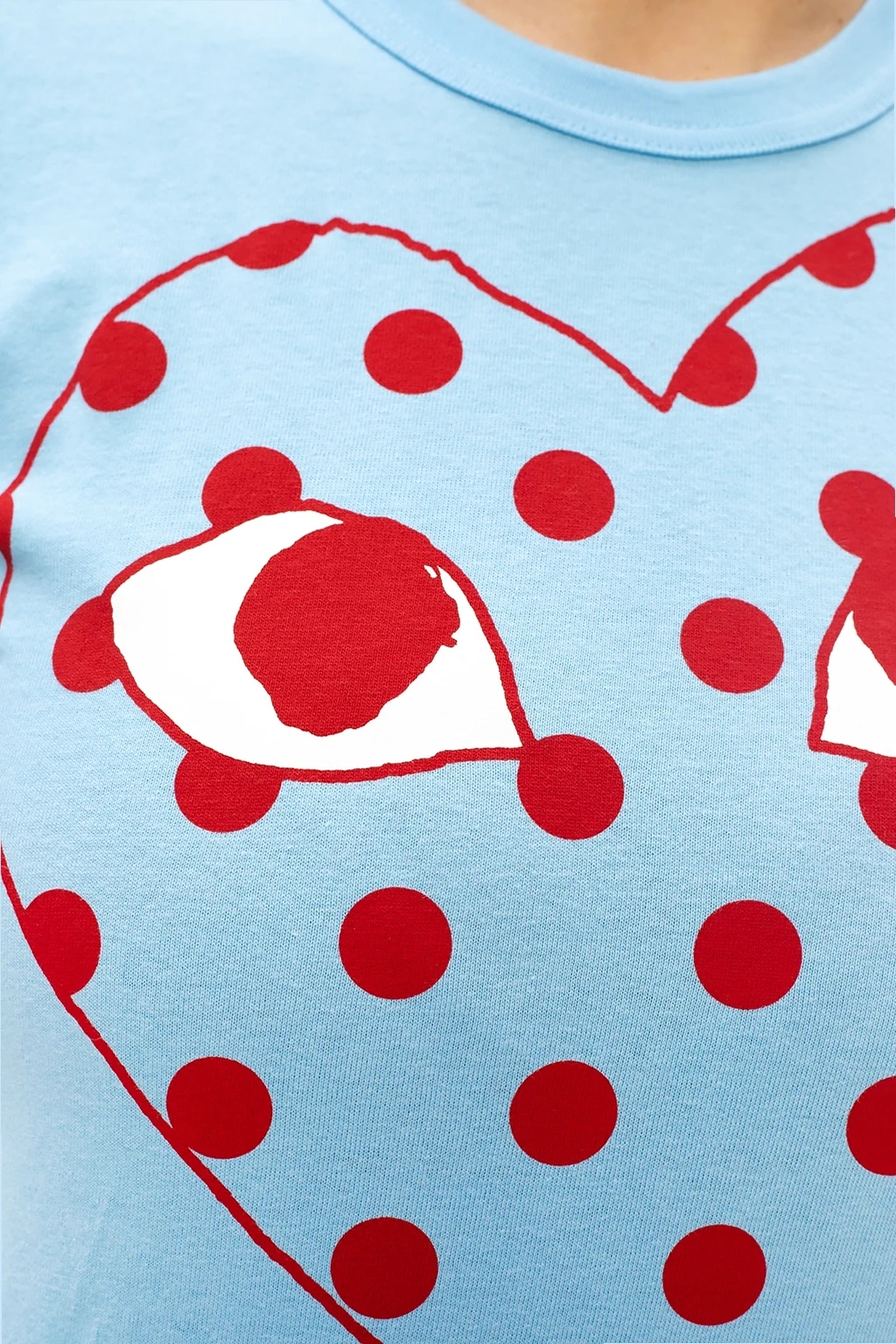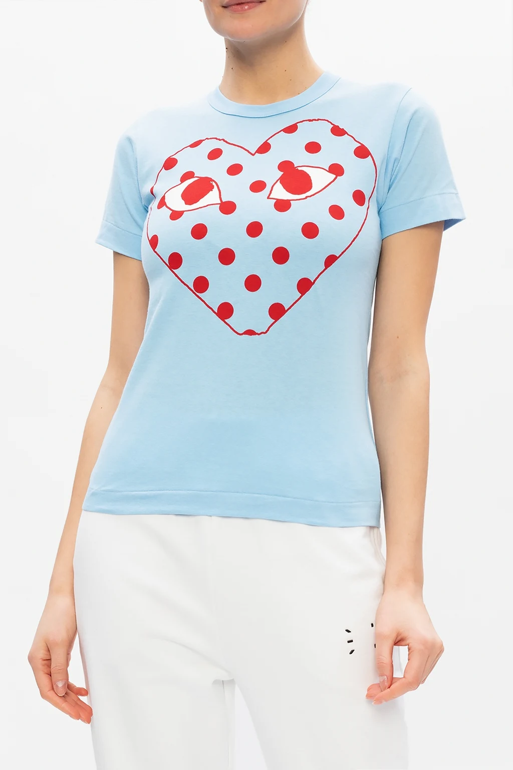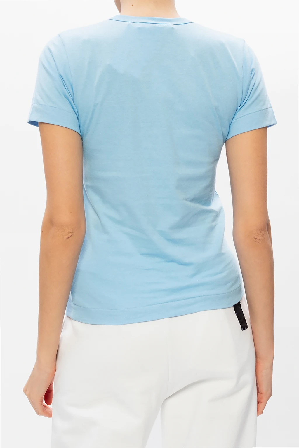 Blue crewneck T-shirt from Comme des Garçons Play. Enriched with a red and white graphic print with the brand's logo, this cotton-crafted style is complete with an elasticated collar.