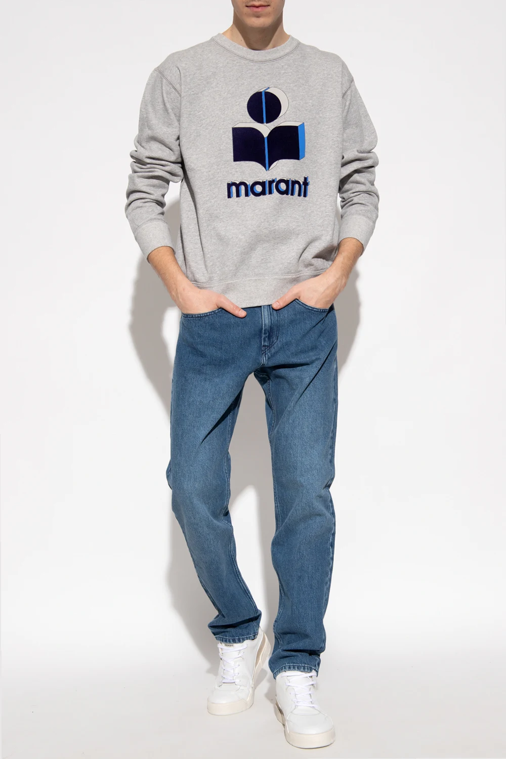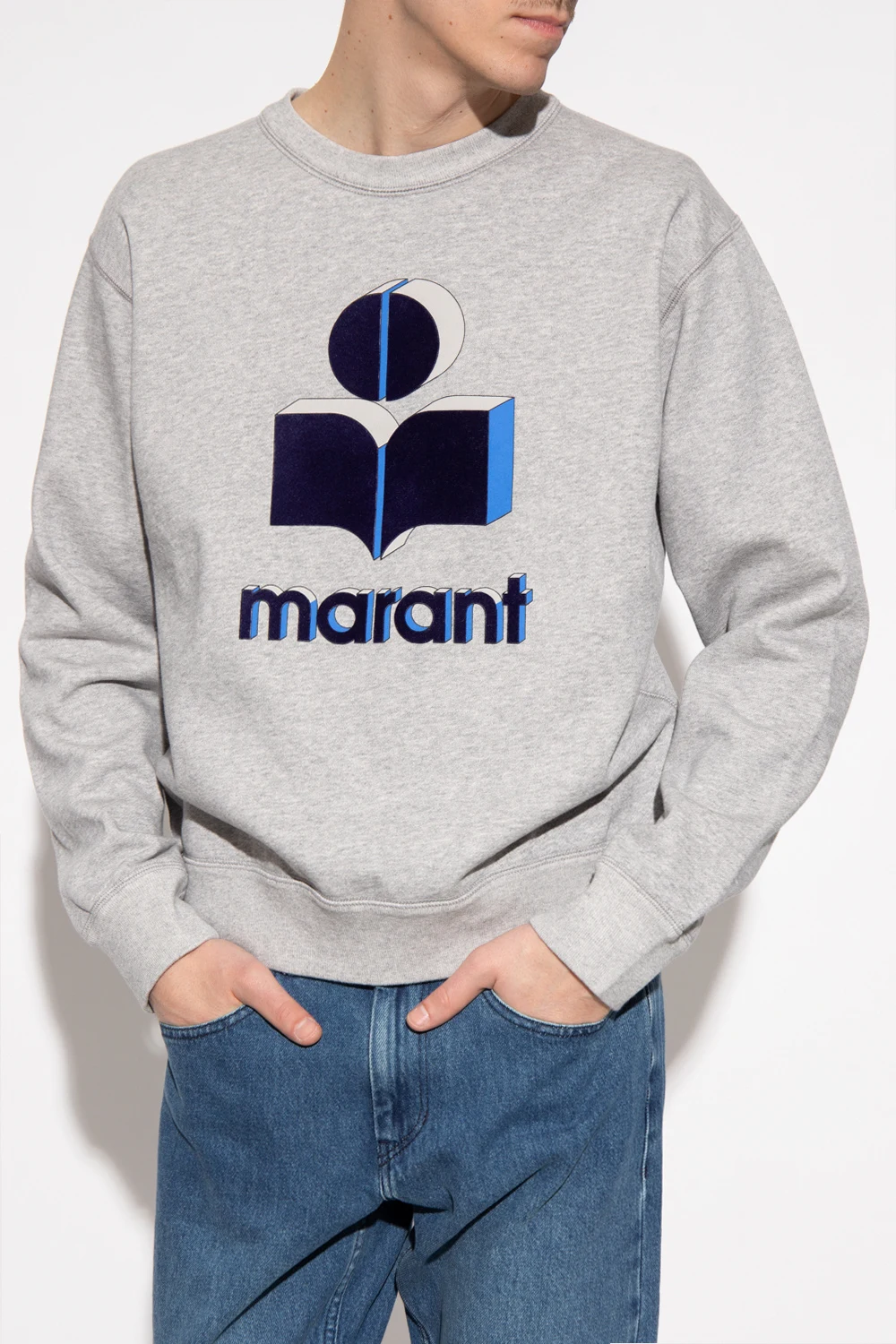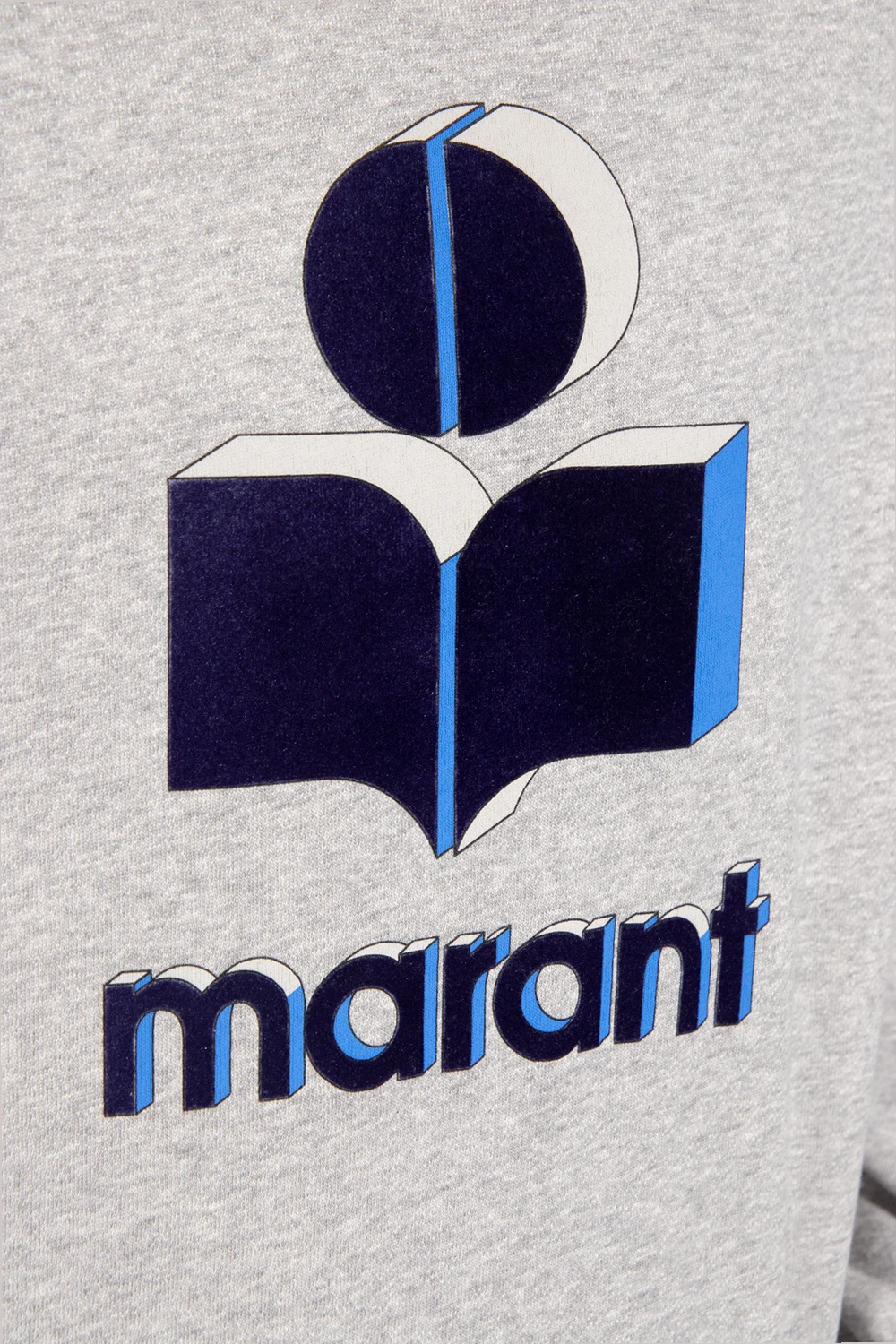 Grey ‘Miko’ sweatshirt from Isabel Marant. Made of cotton, this garment features a blue, navy and grey logo pattern with a velvet finish and ribbed trims at the neck, hem and cuffs.