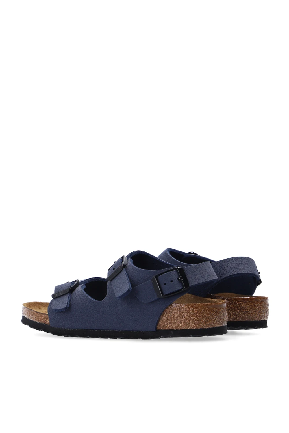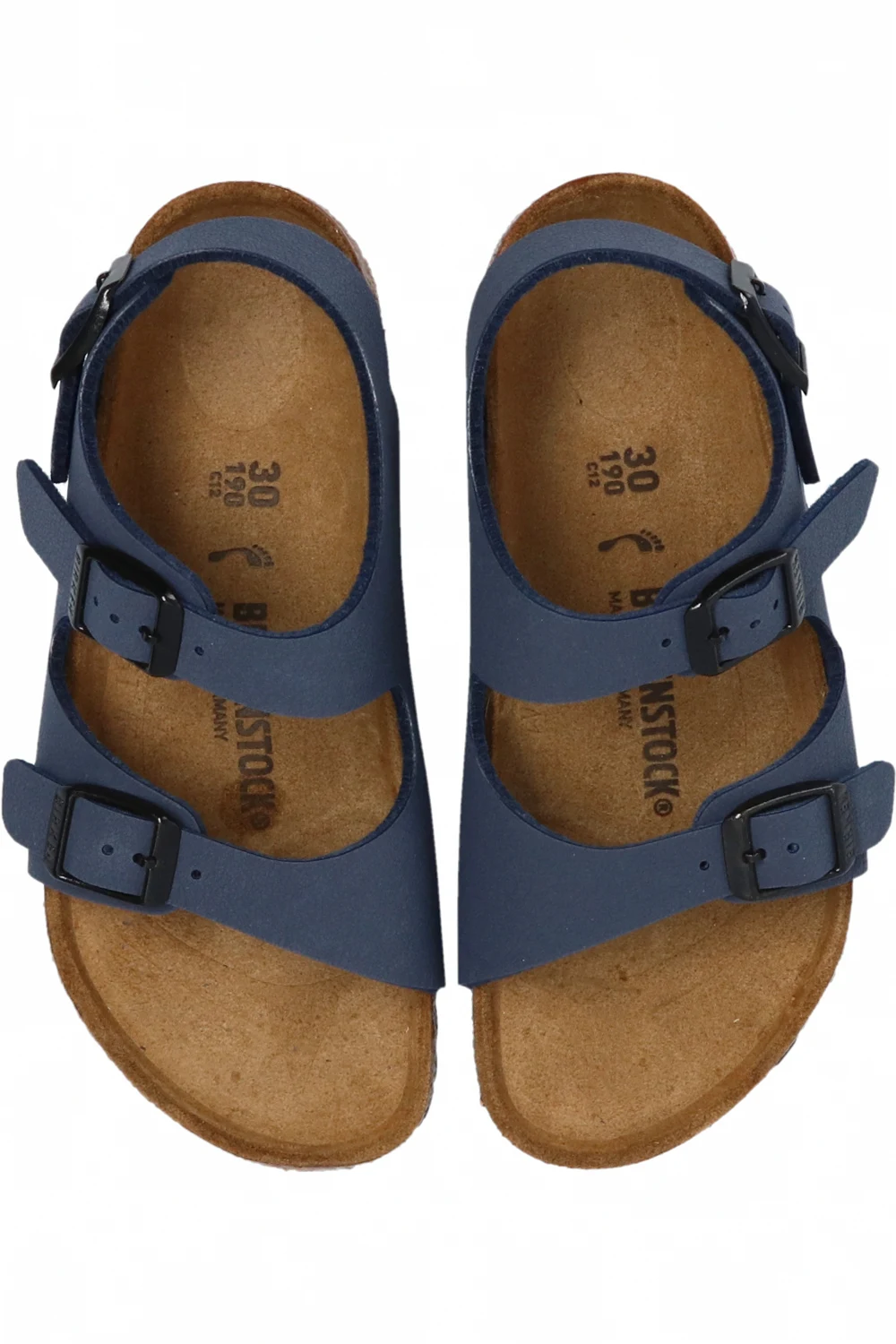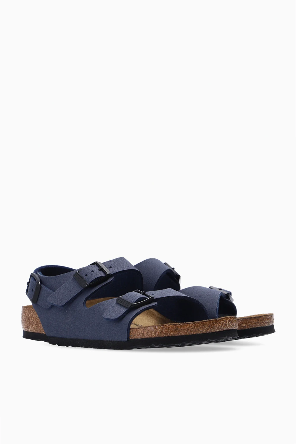 Navy ‘Roma’ sandals from Birkenstock Kids. Crafted from Birko-Flor, this pair features straps with a logo-embossed buckle and a sole in brown and black made of cork and EVA foam.