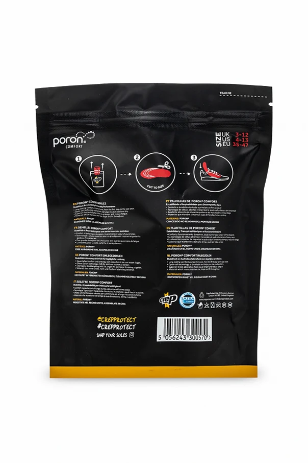 Pair of red ‘Comfort’ insoles from Crep Protect. Crafted from a breathable PORON material using open-cell technology, these insoles maintain size, shape and fit, stay dry and provide superior shock-absorption.