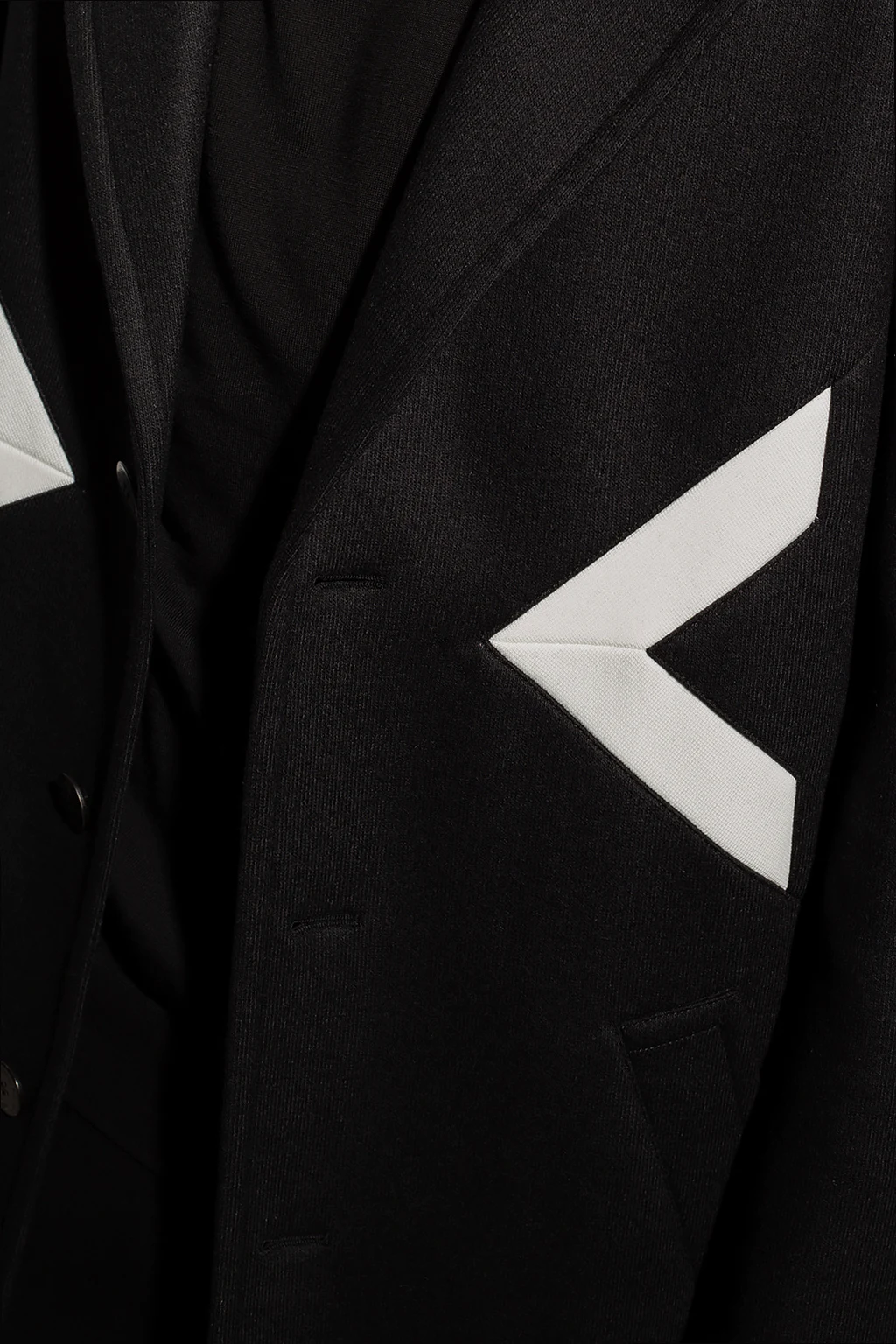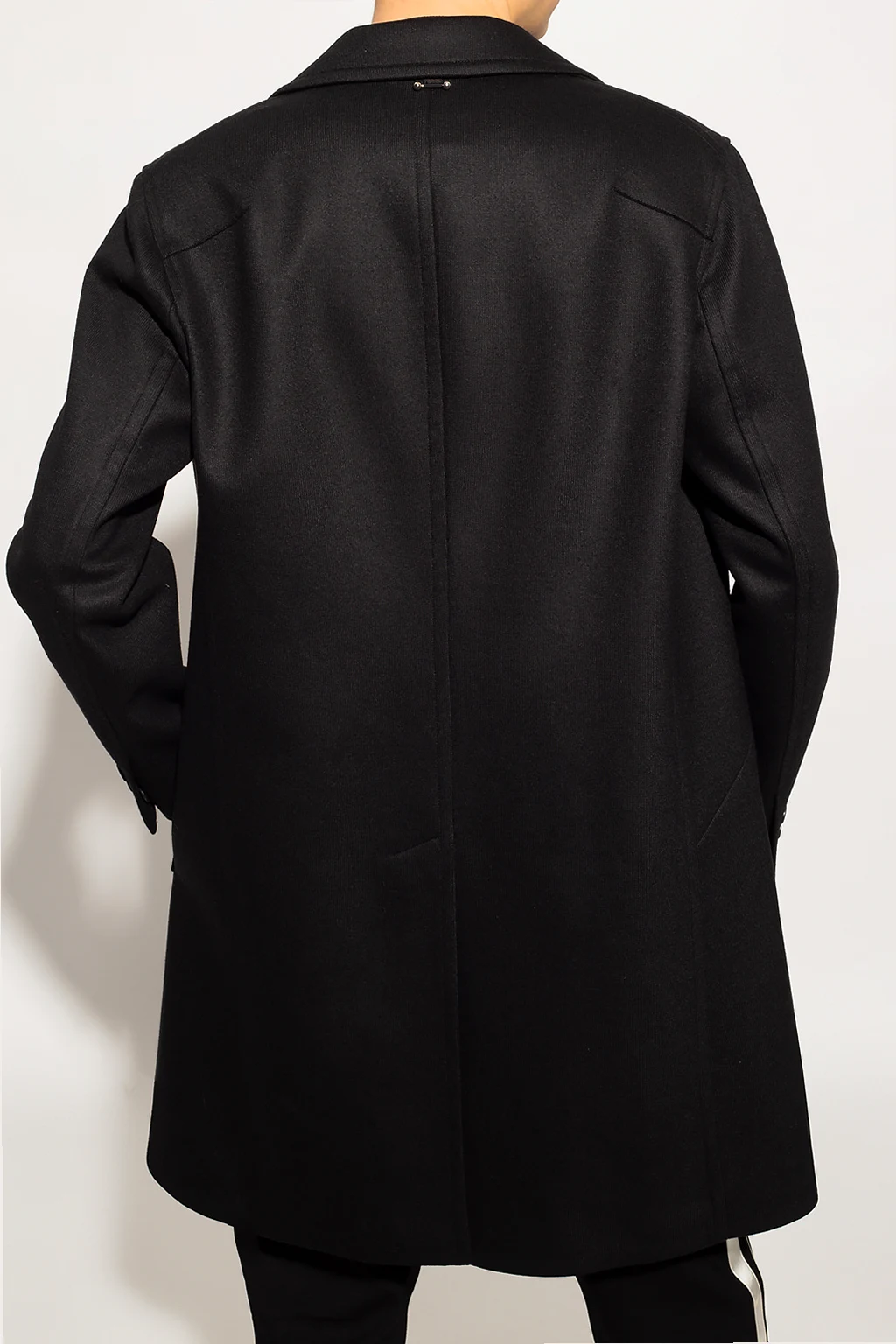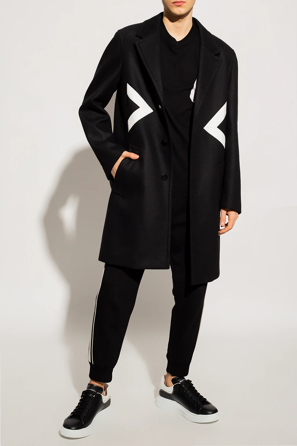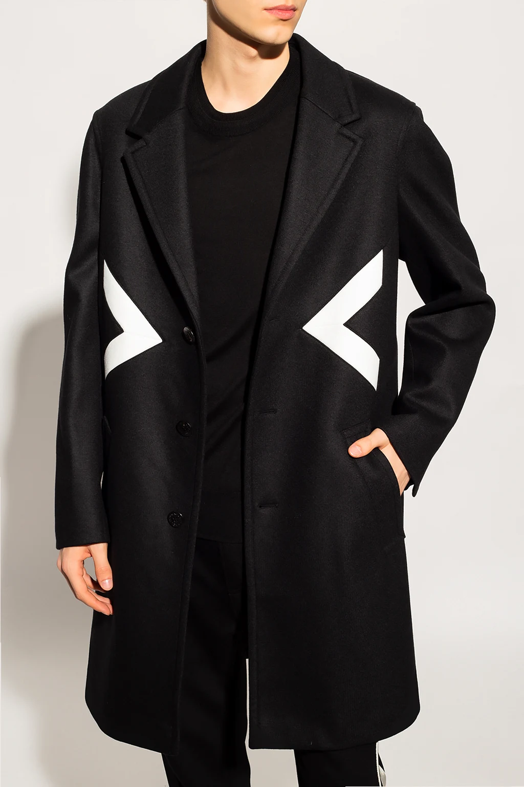 Black coat from Neil Barrett. Crafted from a wool and cotton blend, this style features button fastenings, notch lapels, two slip pockets and a white graphic pattern on the front, button cuffs and a single back vent.