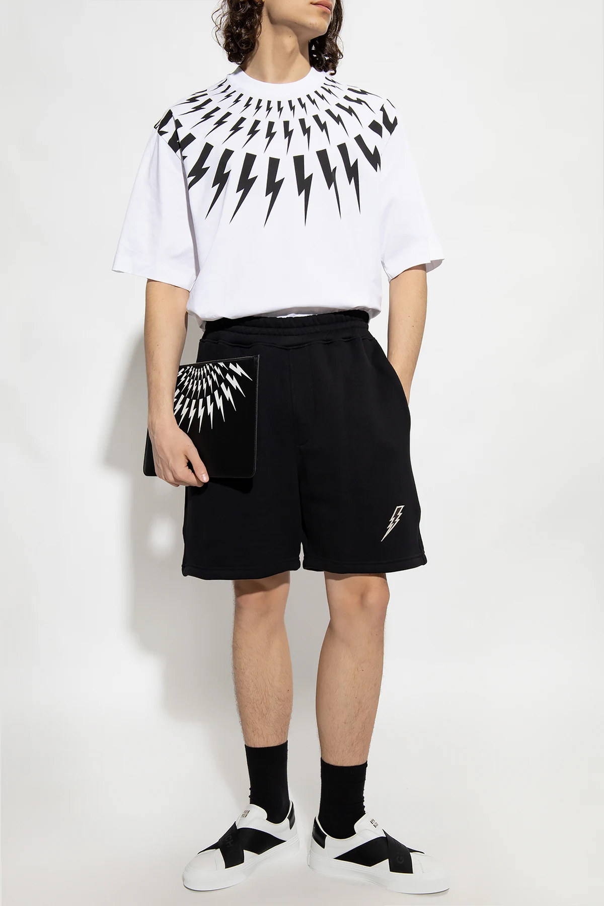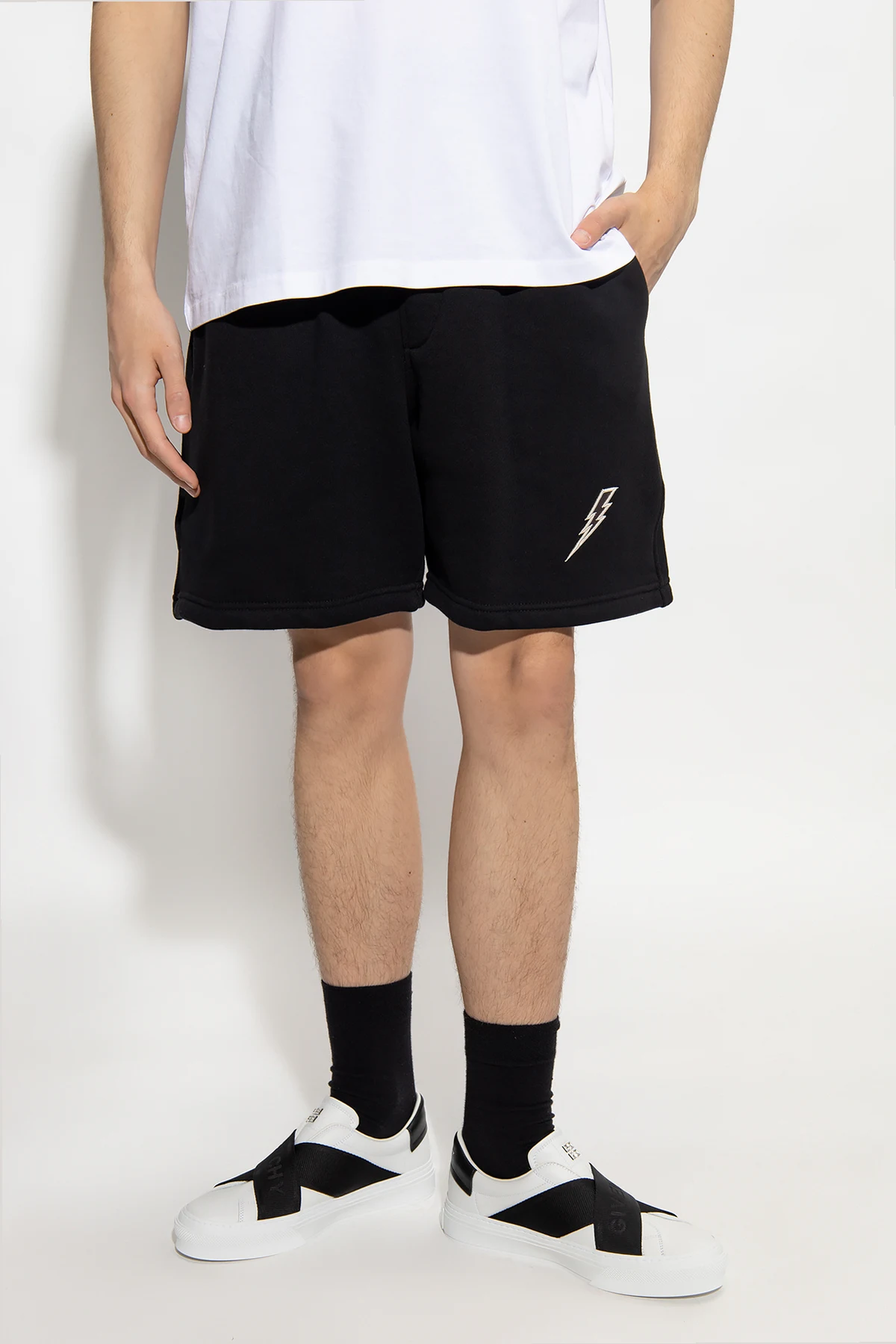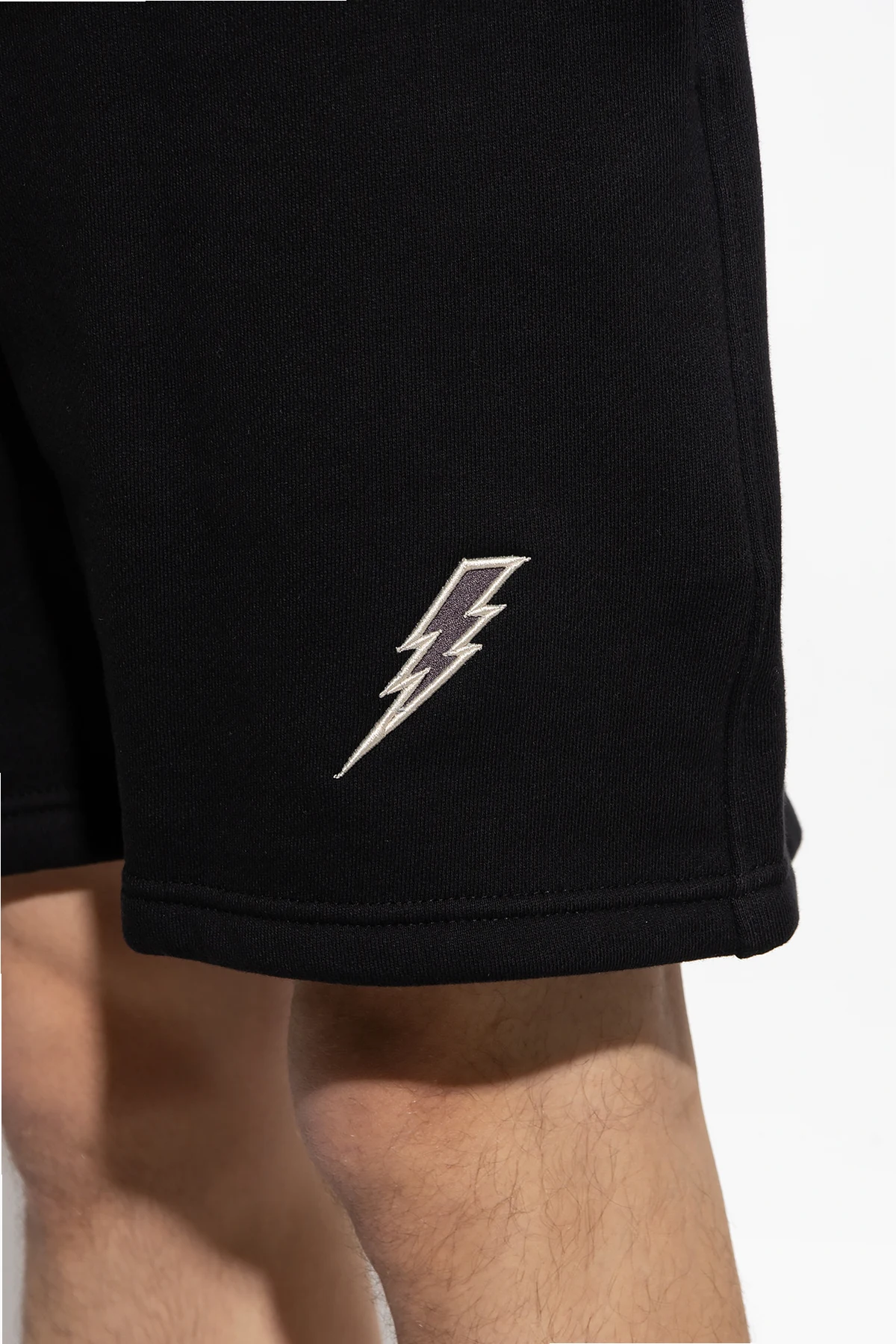 Black shorts from Neil Barrett. Made of cotton, this pair features an elasticated waistband and a patch showcasing the designer's signature thunderbolt.