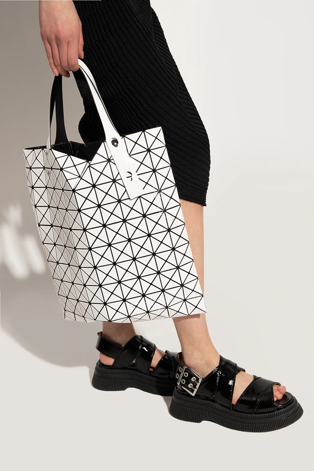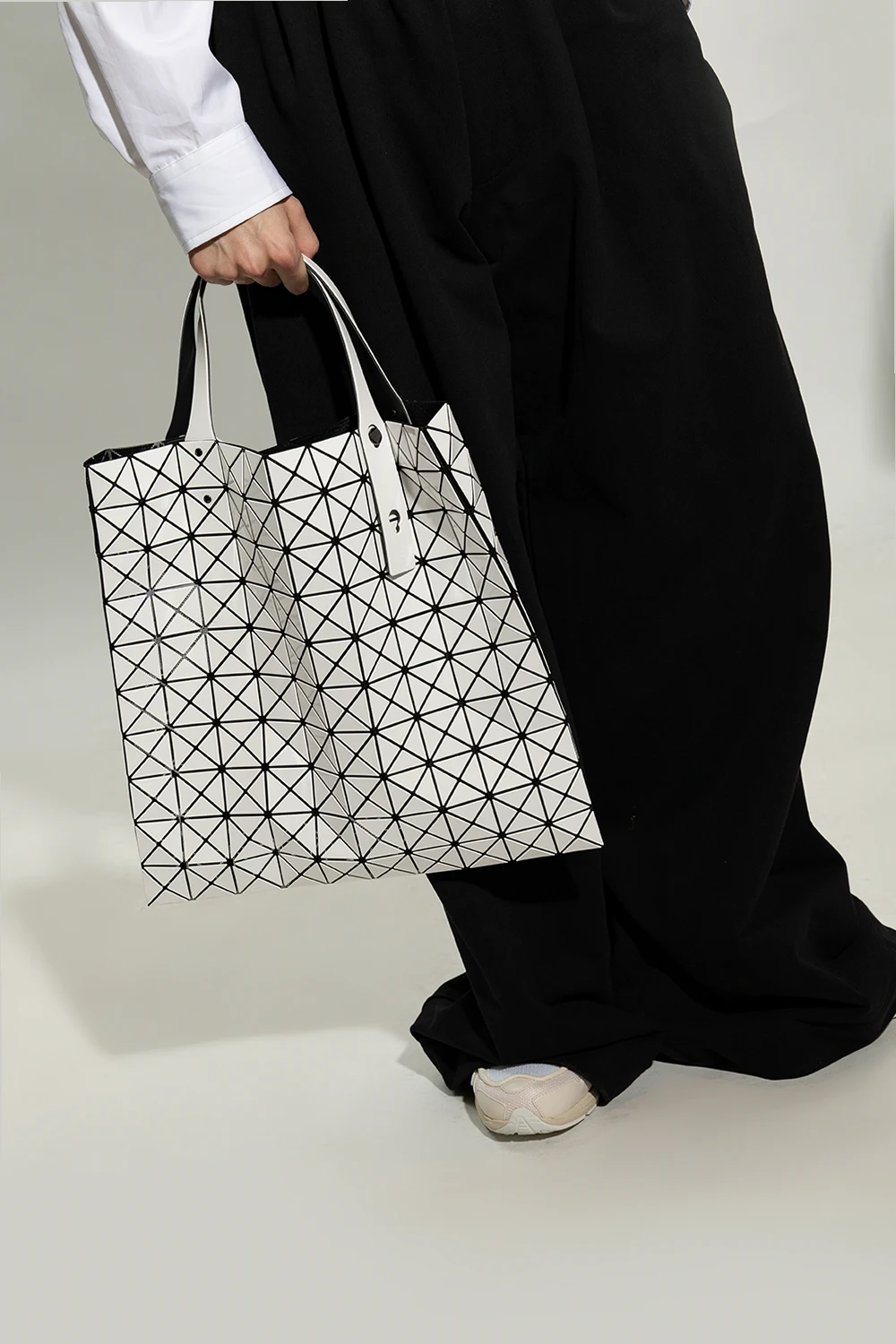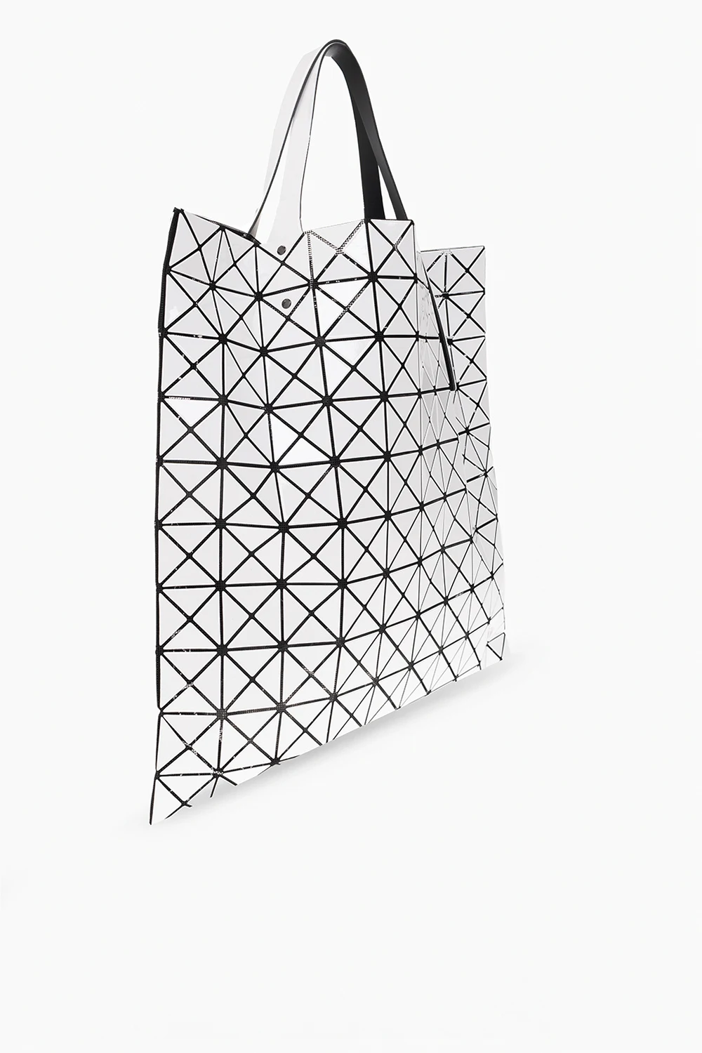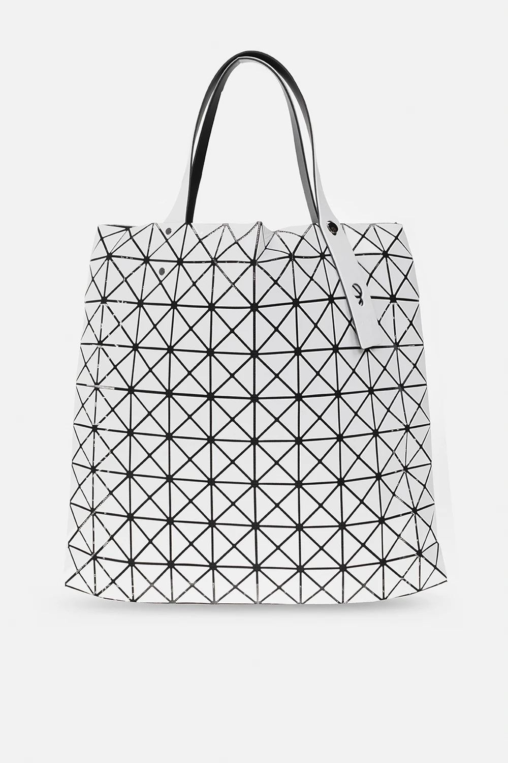 White and black ‘Prism’ shopper bag with a glossy trim from Issey Miyake Bao Bao. Crafted from mesh with a series of applications creating a geometrical pattern, this design features two adjustable shoulder straps and one internal compartment with a zip pocket.