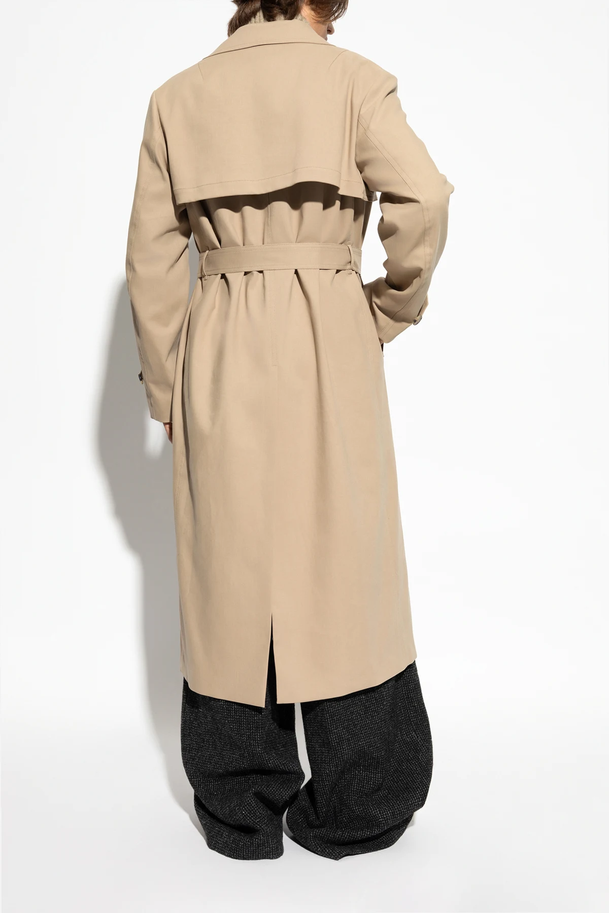 Form und Schnitt zeichnen sich durch einen klassischen, langen Stil aus, der bis unter die Knie reicht. Das zweireihige Design mit Metallknöpfen sowie breiten Revers und Schulterklappen verleiht Struktur und Eleganz. Der Taillengürtel mit Metallschnalle betont perfekt die Silhouette.