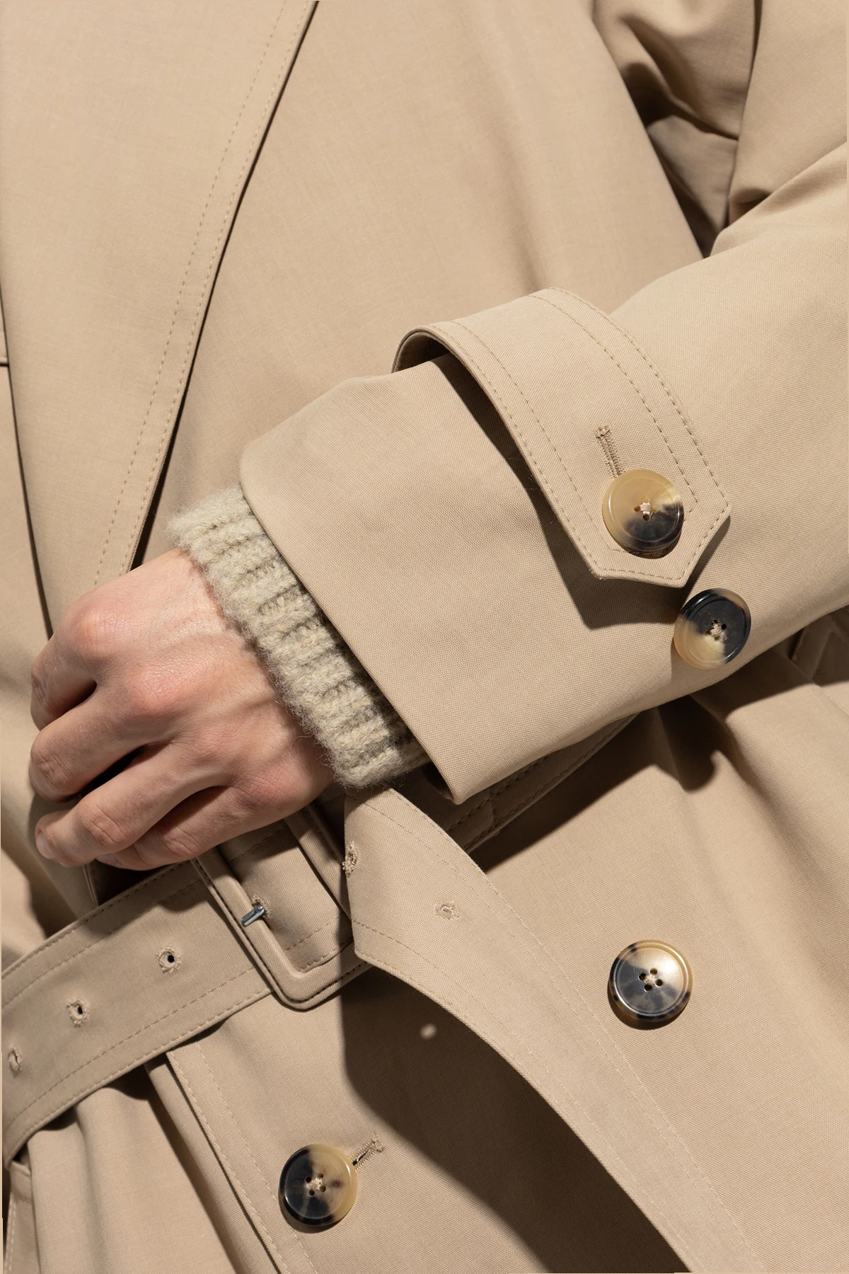 Hergestellt aus hochwertigem beigen Material, vermutlich Baumwolle mit einem Elastananteil, ist der Trenchcoat langlebig und wetterbeständig. Goldene Knöpfe sowie verstellbare Manschetten mit Riemen und Knöpfen sind Details, die den luxuriösen Charakter des Produkts unterstreichen.