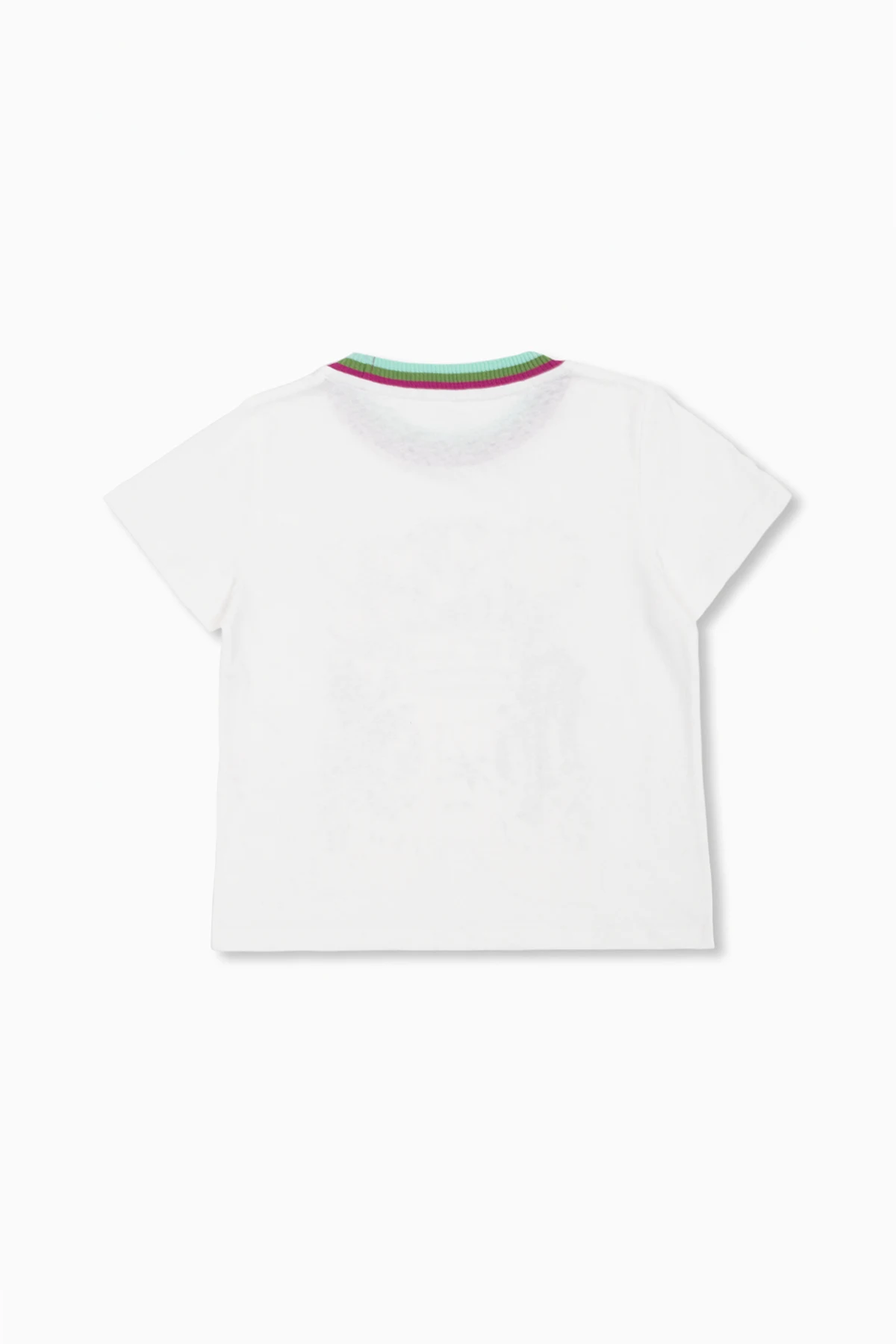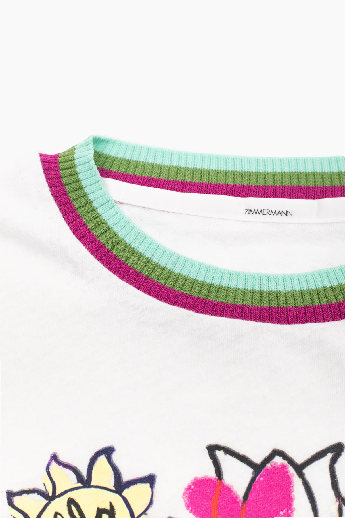 White T-shirt from Zimmermann Kids. Made from a blend of cotton and linen, this short sleeve design features a multicolored print, logo detail and ribbed round neck in blue, green and purple.