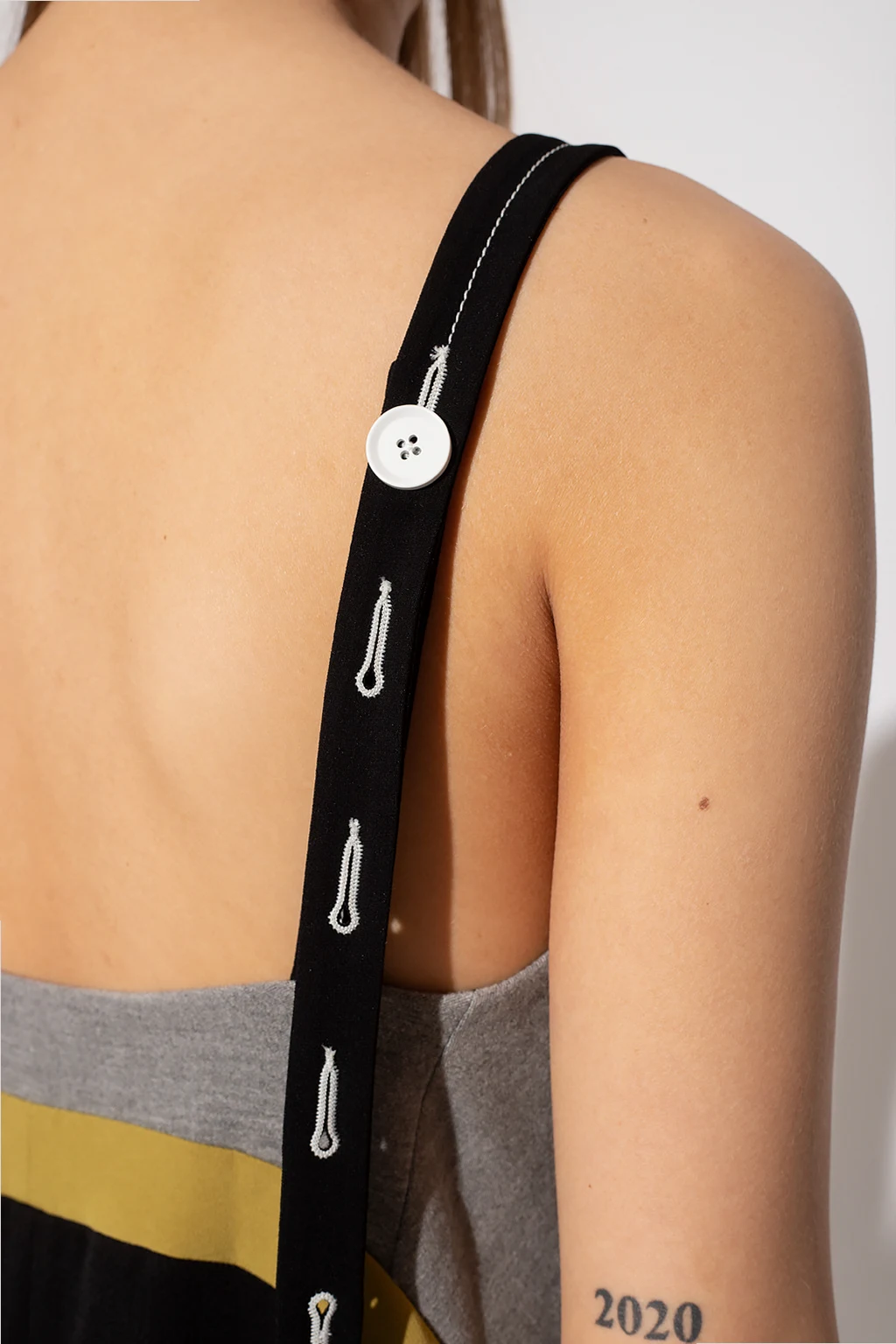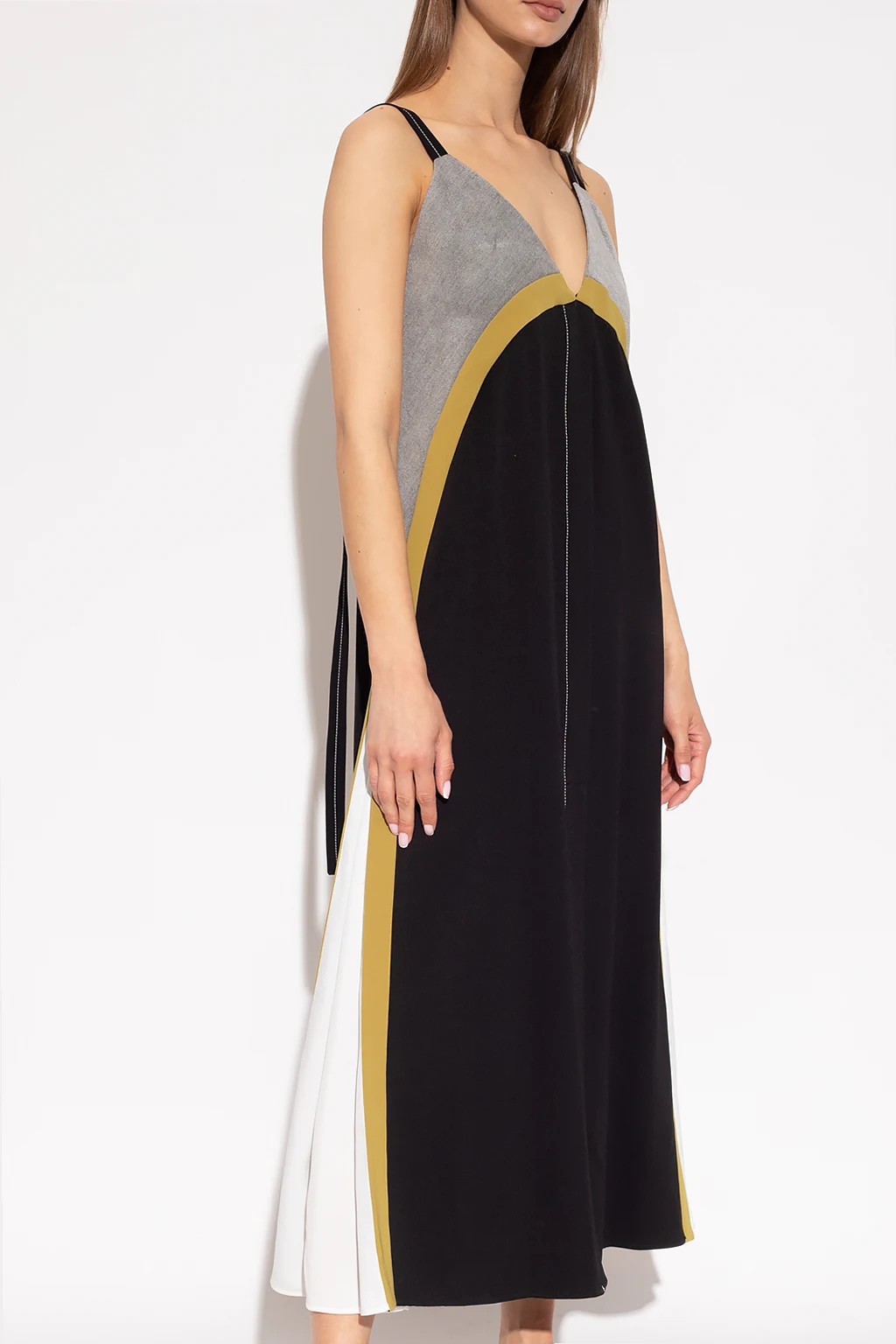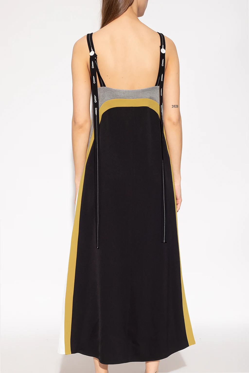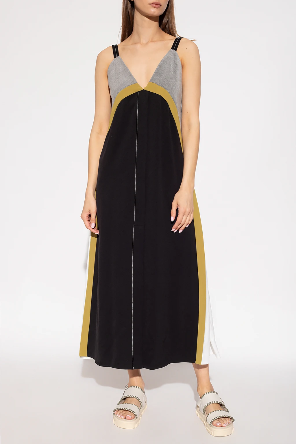 Grey, green and black slip dress from Proenza Schouler. This style features button fastenings with a concealed placket and white trims on the sides.