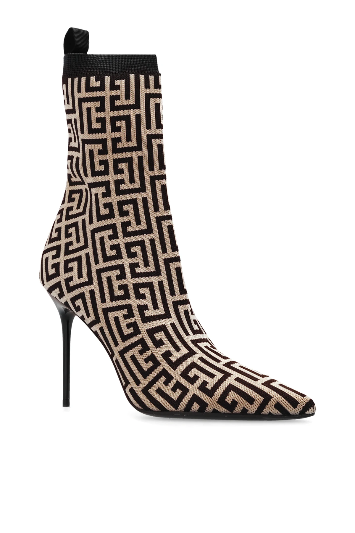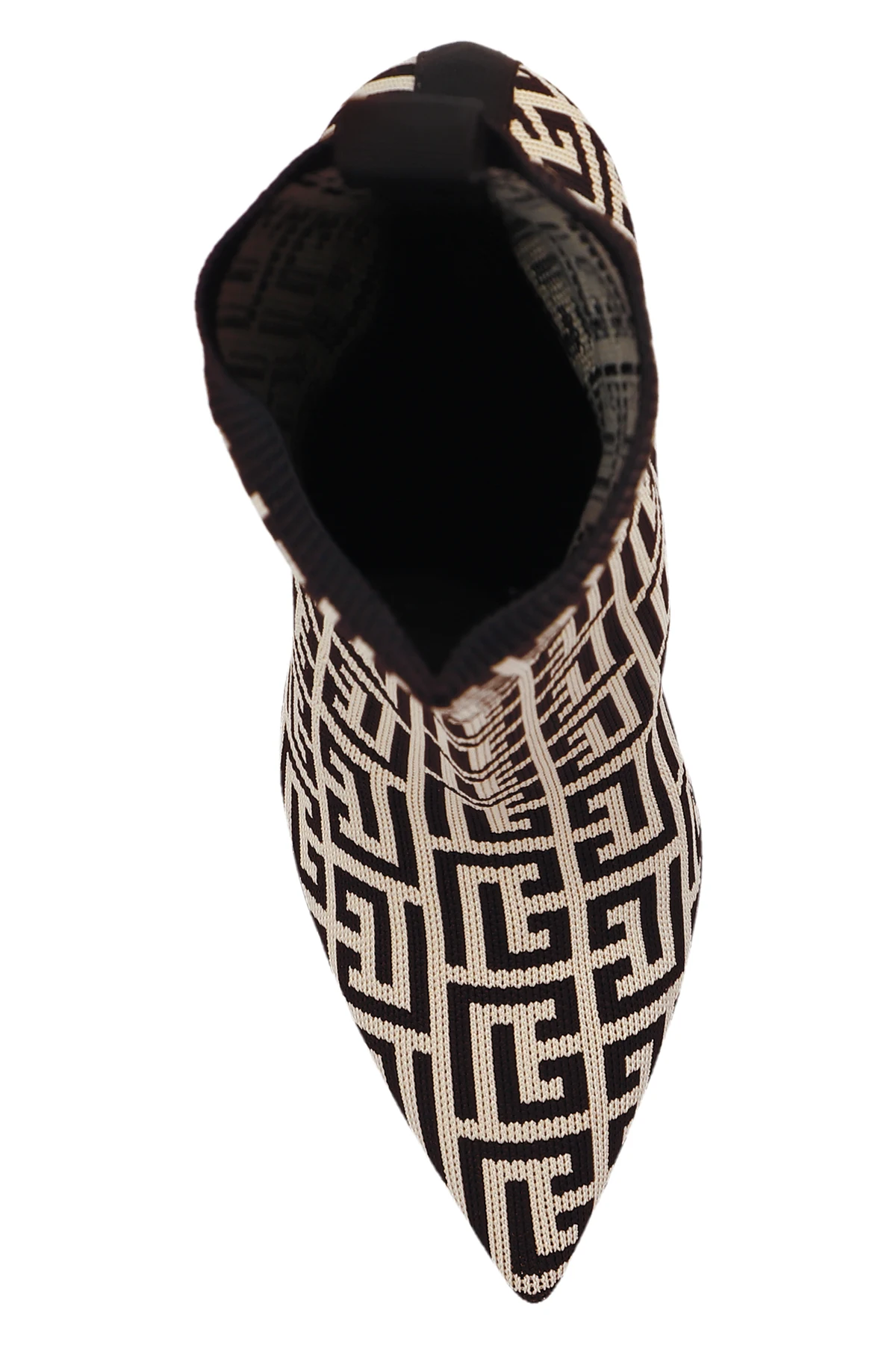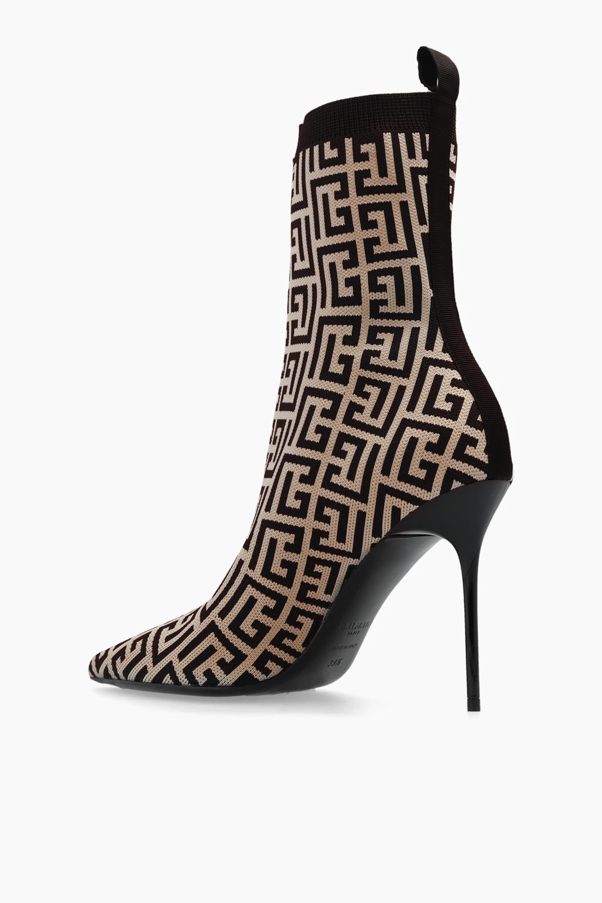 Beige and black ‘Skye’ heeled ankle boots from Balmain. Designed with a slip-on silhouette, this model sits on a black leather sole and showcases a monogrammed fabric upper, a tapered toe and a glossy heel.