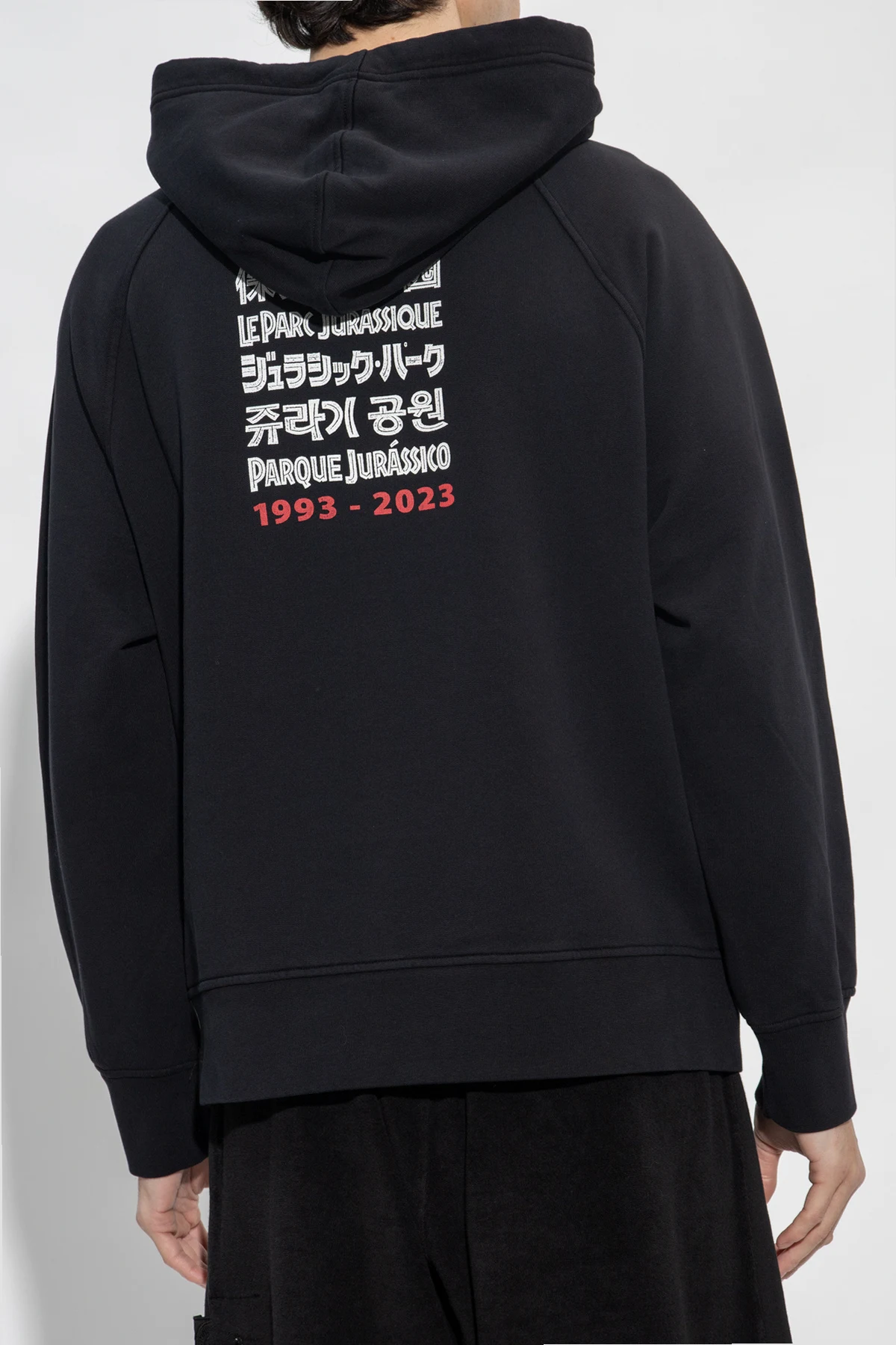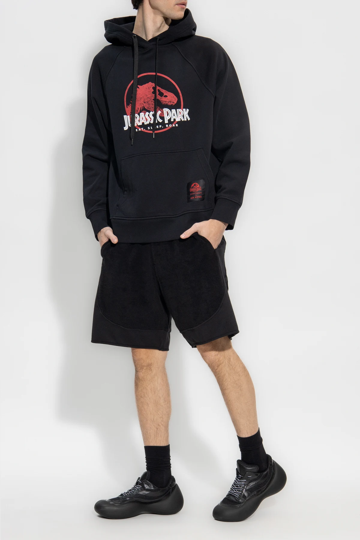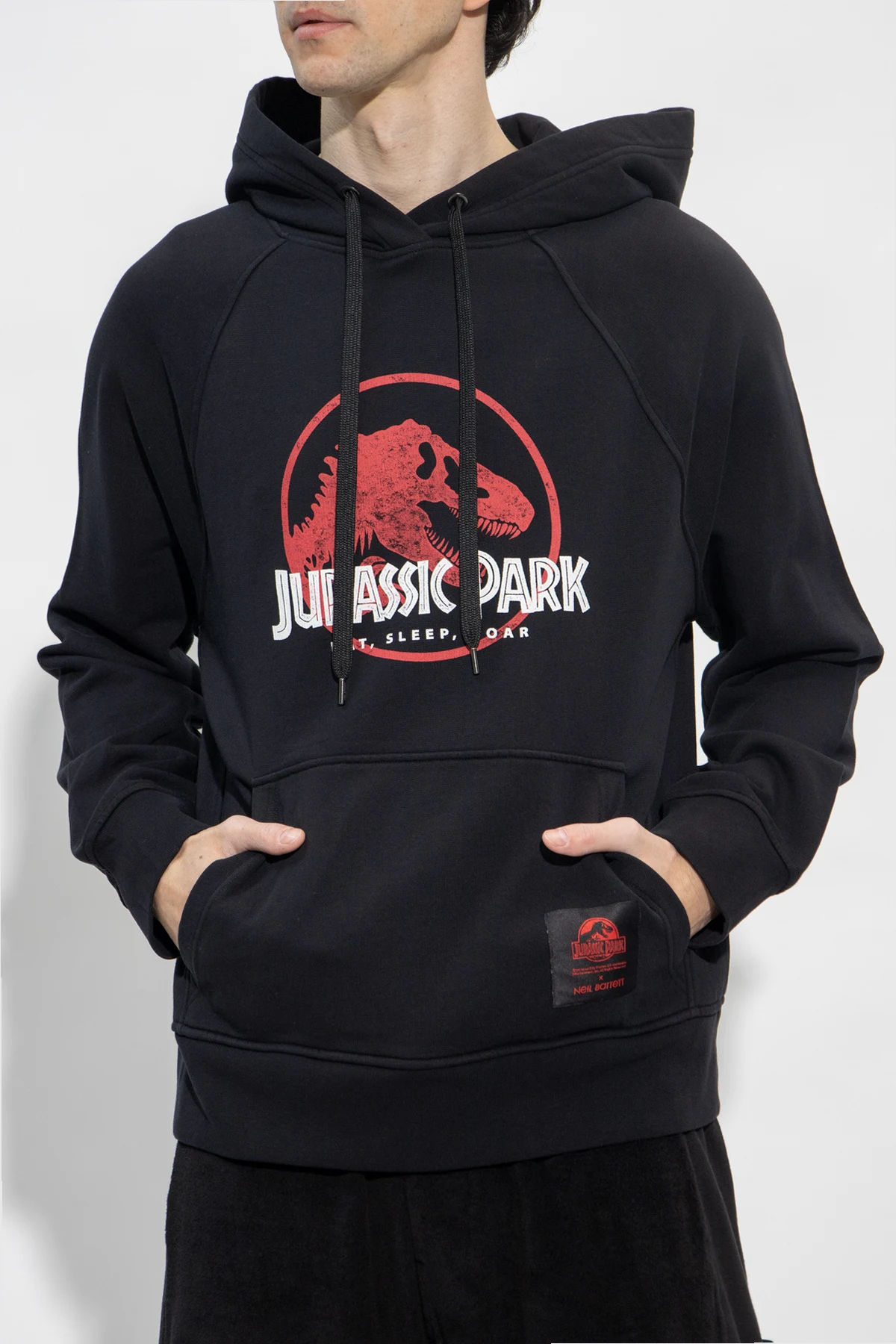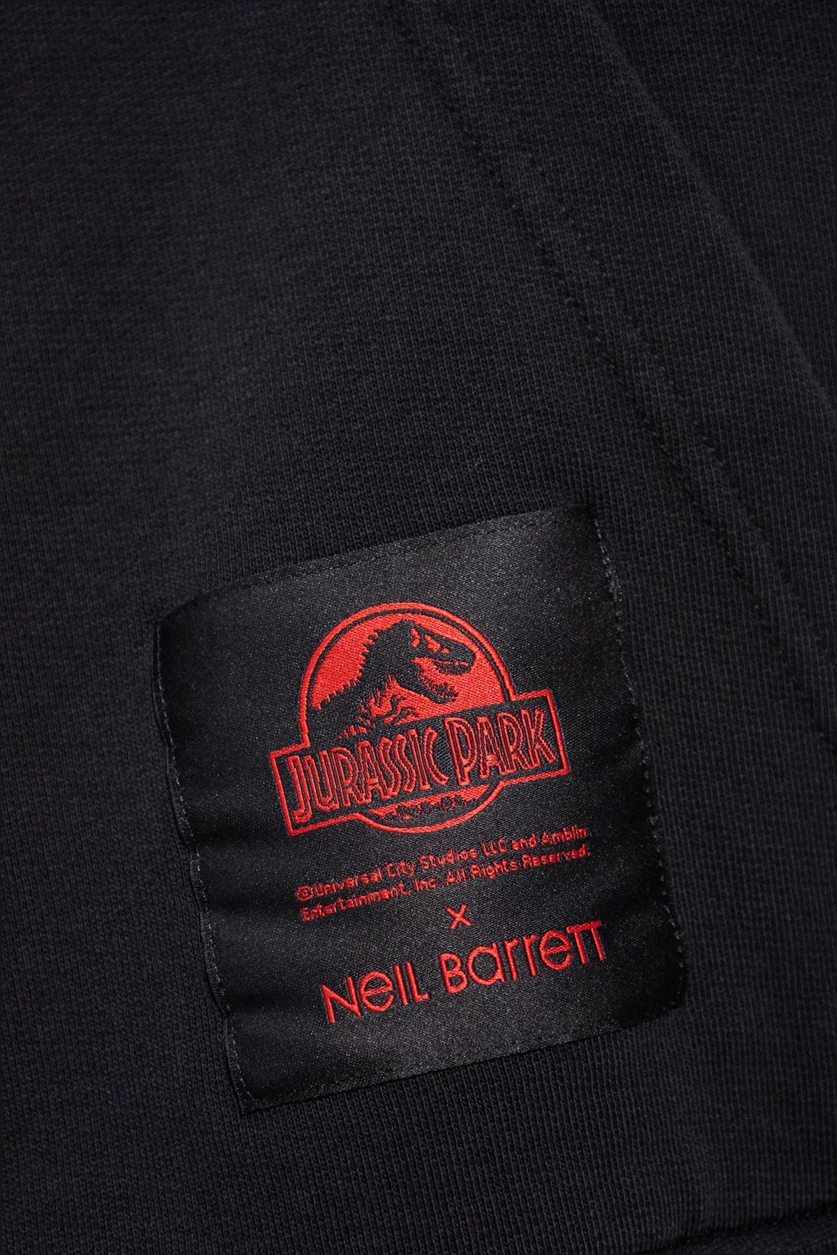 Black hoodie from Neill Barrett x Jurassic Park. Made of cotton, this garment features a drawstring hood, white and red print, logo patch, front pocket and ribbed trims at the hem and cuffs.