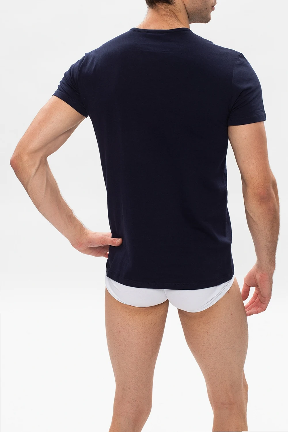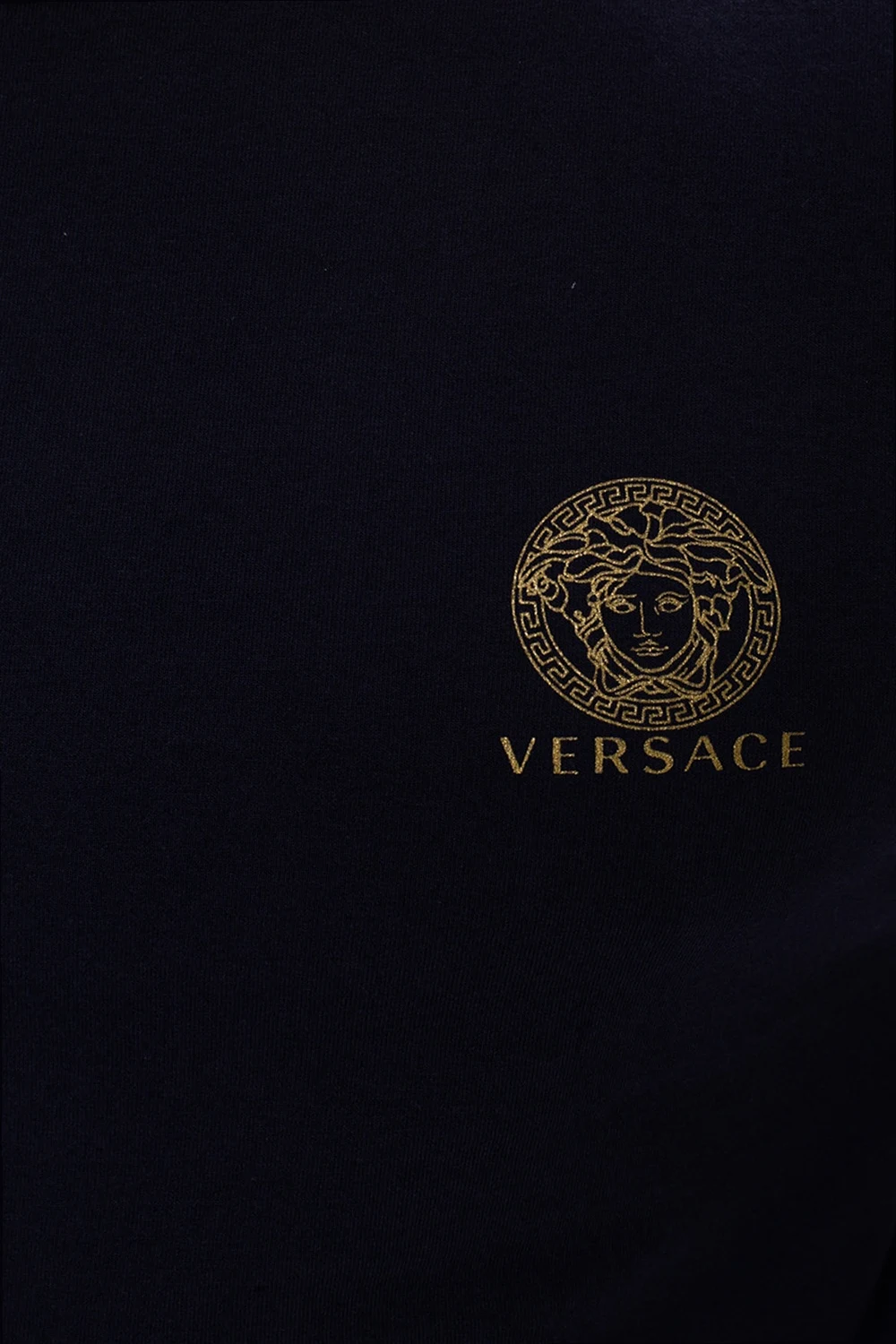 2-pack of white and navy crewneck T-shirts from Versace. Crafted from cotton, this design features a gold-tone logo print.