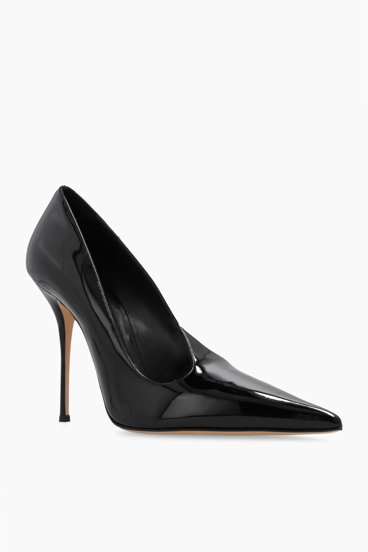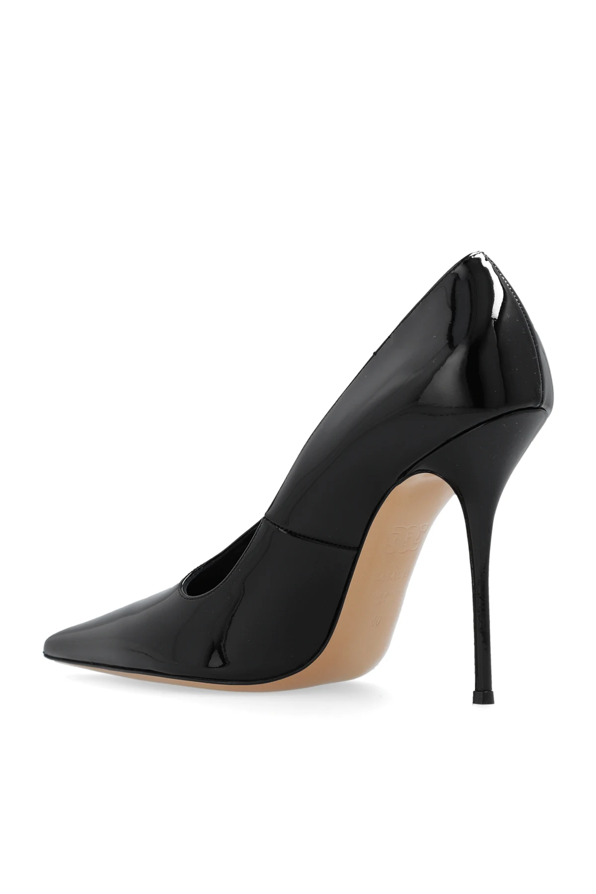 Black stiletto pumps from Casadei. Made of patent leather, this design features decorative cut-outs, a pointed toe and beige leather sole.
