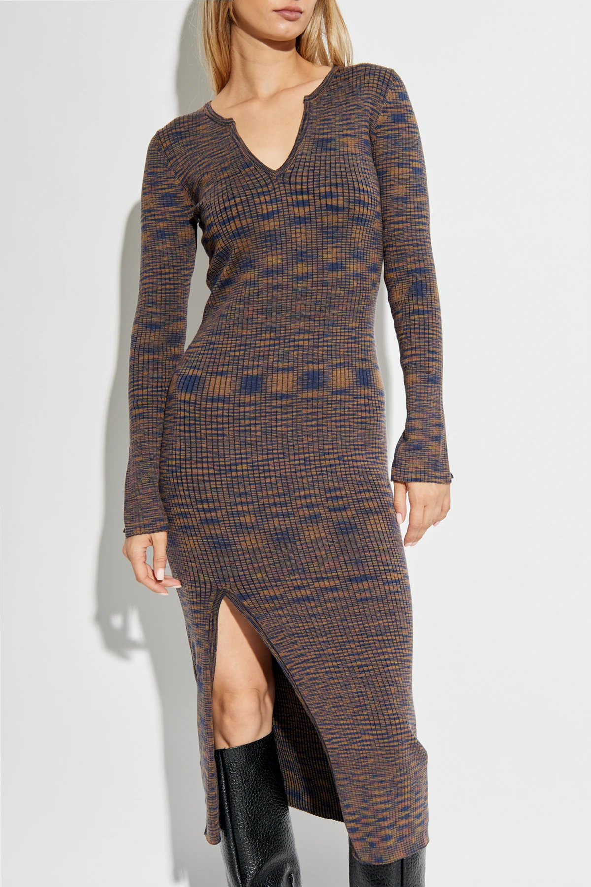 Das Kleid zeichnet sich durch einen taillierten Schnitt aus, der die Silhouette dezent betont. Lange Ärmel und eine Midilänge, die bis zur Mitte der Wade reicht, verleihen ihm Eleganz. Auf der Vorderseite befindet sich ein Schlitz, der nicht nur Stil verleiht, sondern auch Bewegungsfreiheit gewährleistet. Ein V-Ausschnitt fügt dem Kleid einen femininen Charme hinzu.