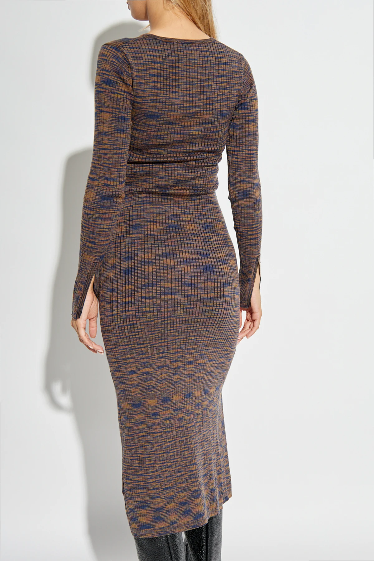 Auf den Fotos sind das detaillierte Strickmuster und die sorgfältige Kantenverarbeitung zu erkennen, was auf die hohe Verarbeitungsqualität hinweist. Das Kleid verbindet Eleganz mit Komfort und sein Design spiegelt den verantwortungsvollen Ansatz der Marke bei der Produktion sowie die Verwendung hochwertiger Materialien wider.