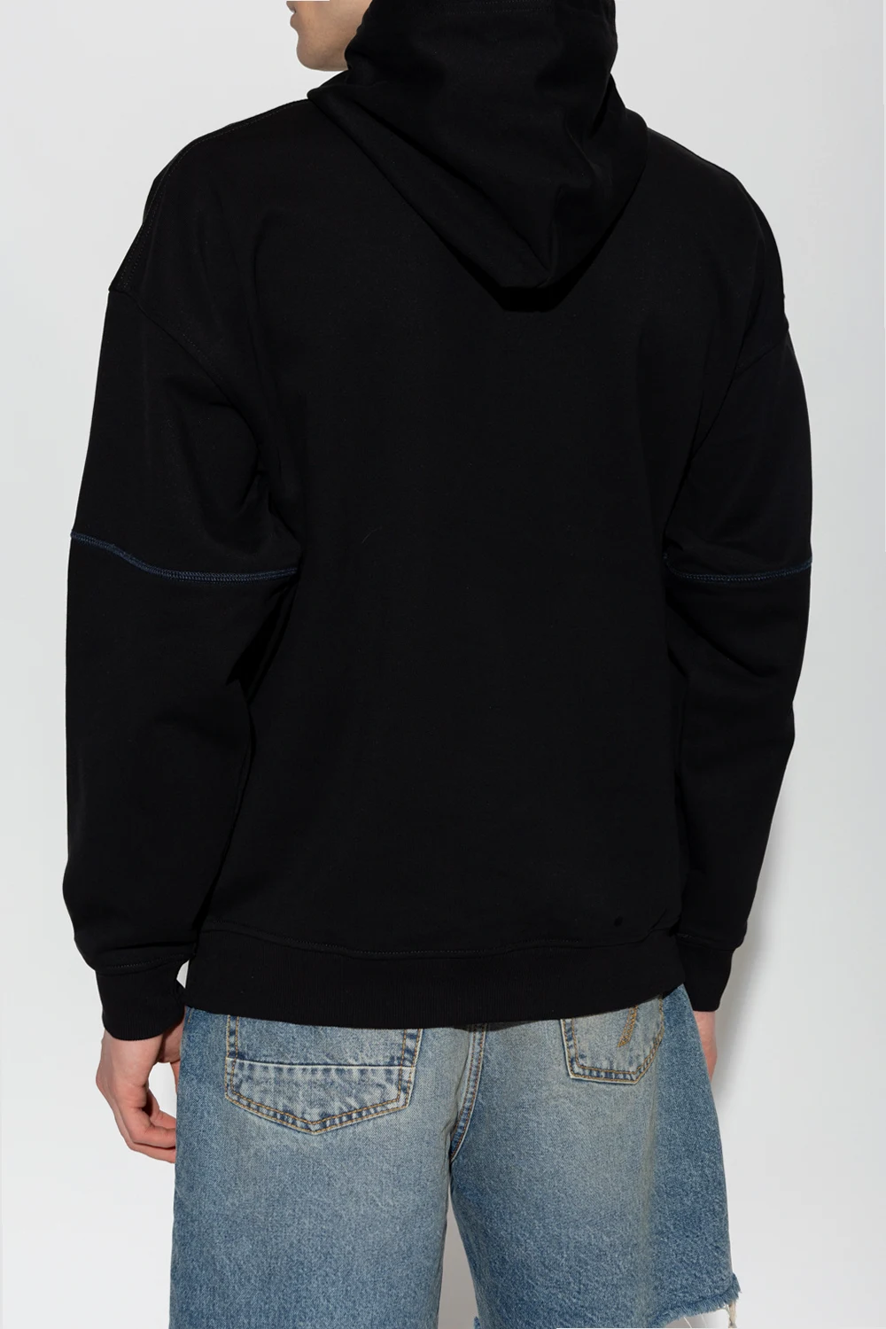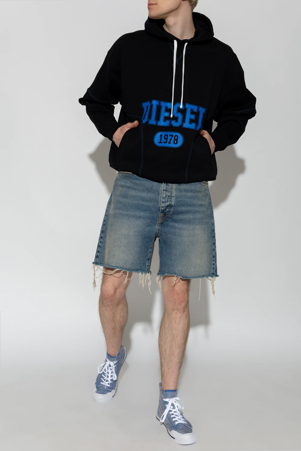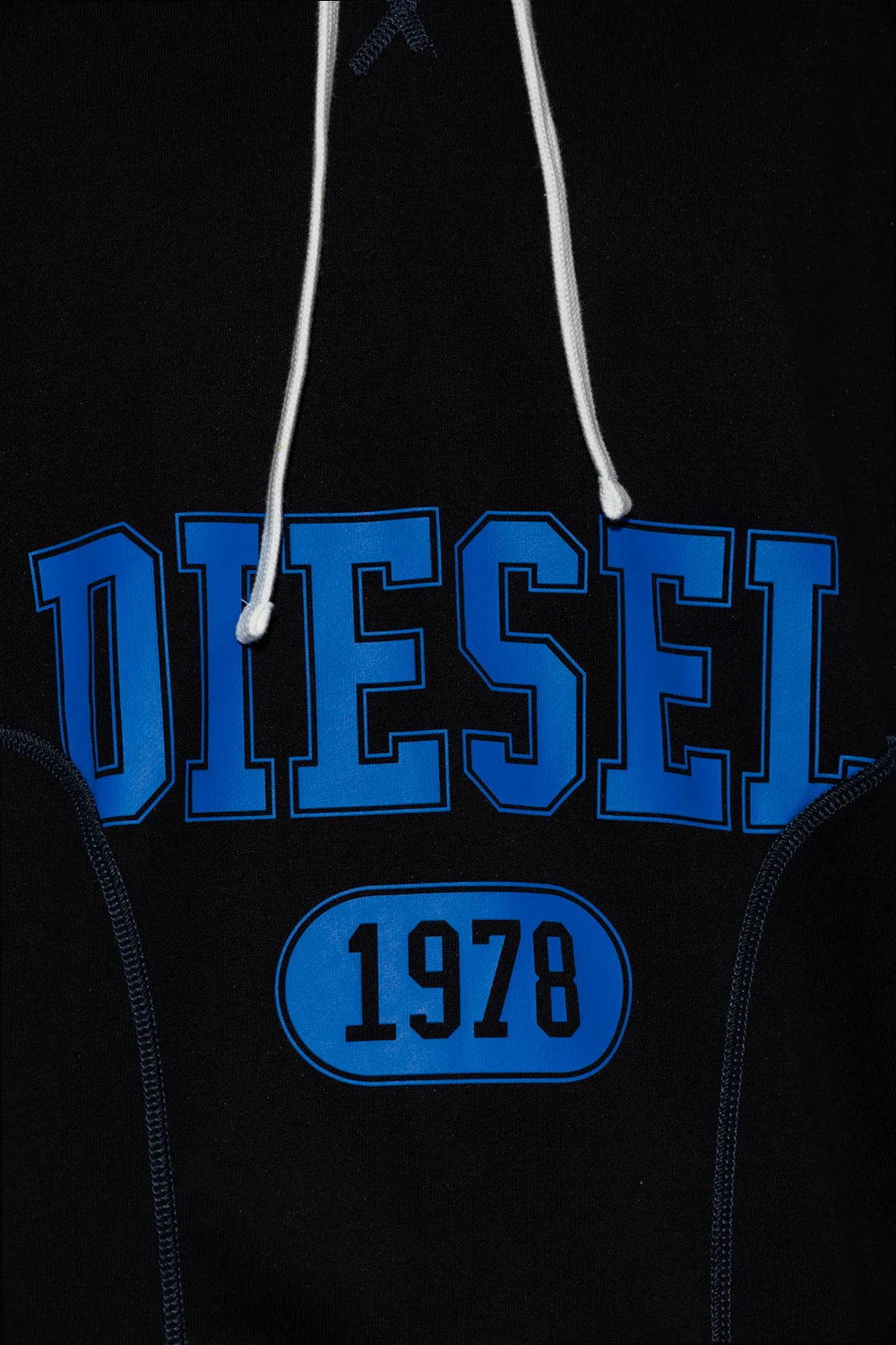 Black 'S-MUSTER' sweatshirt from Diesel. Crafted from cotton, this garment features a blue logo print, two slip pockets, drawstring hood and ribbed trims at the hem and cuffs.