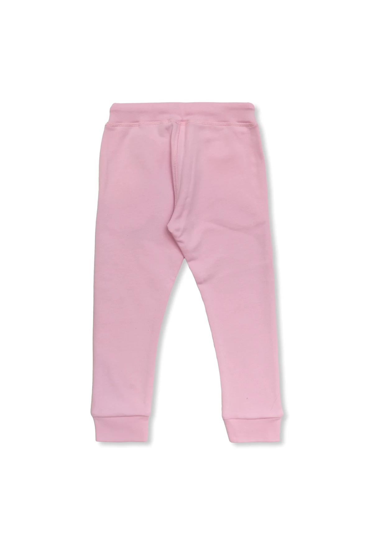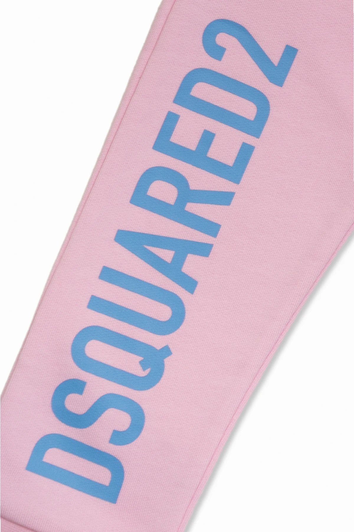 Pink sweatpants from Dsquared2 Kids. Made of cotton, this pair is cinched with drawstrings at the elasticated waistband and showcases a printed blue logo, two slip pockets and ribbed cuffs.