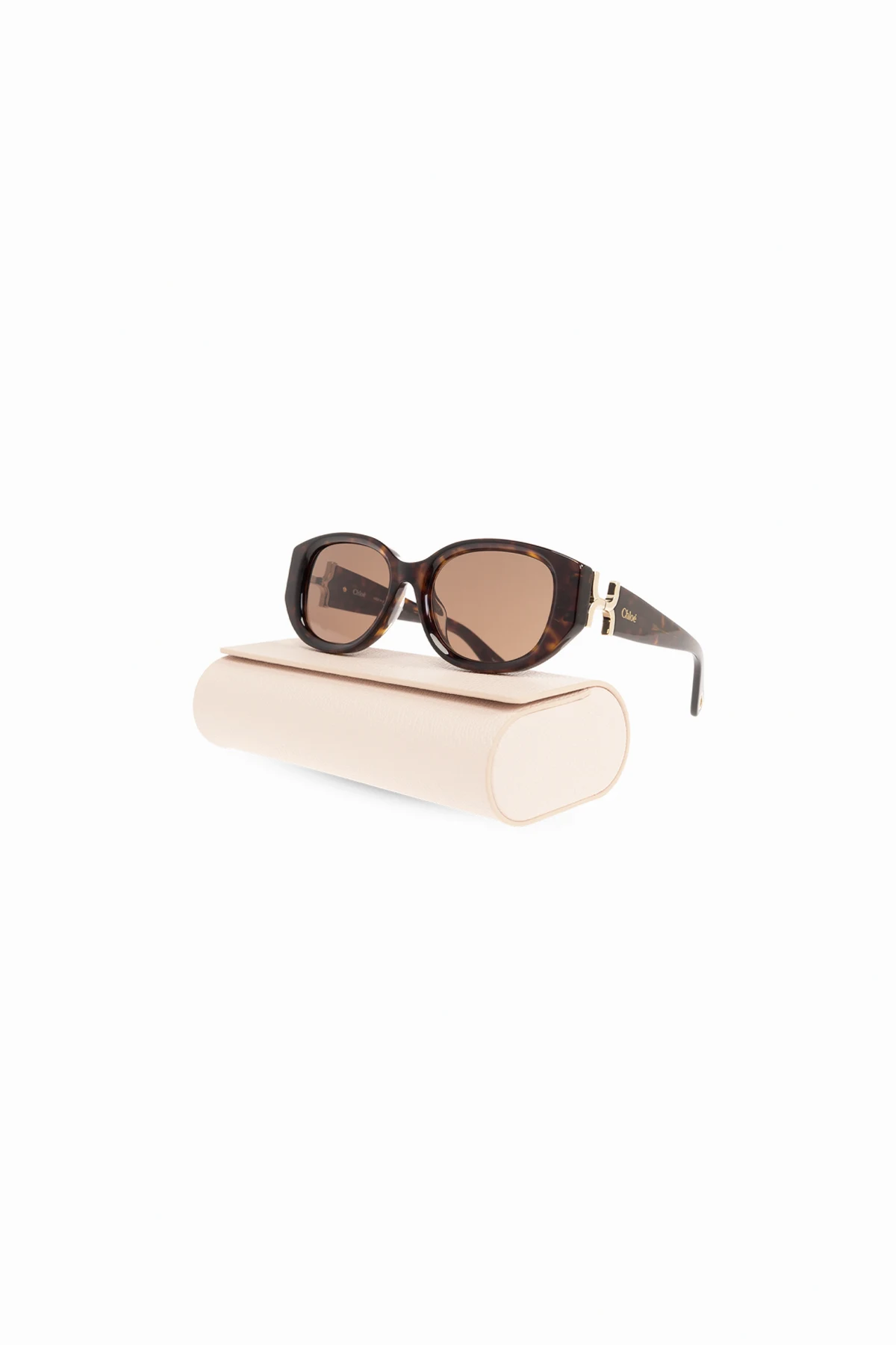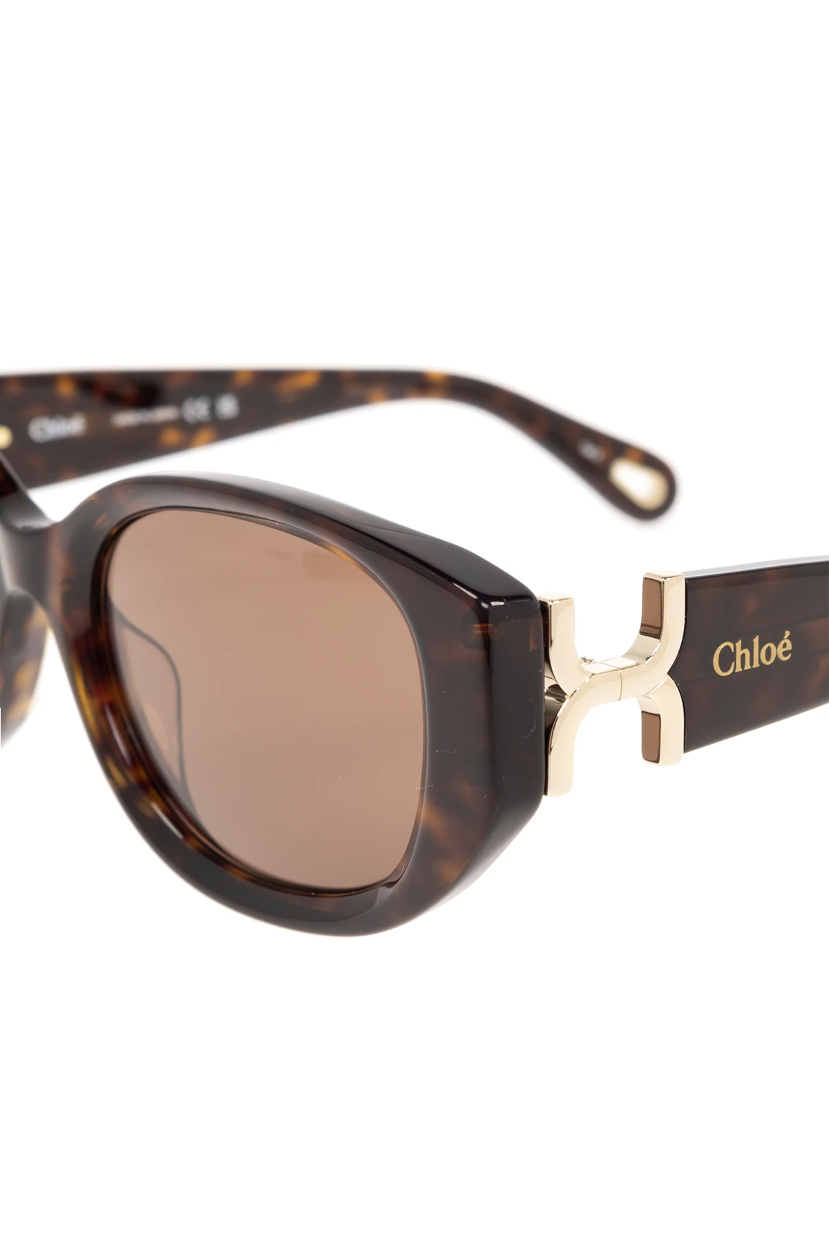 Die Fassungen sind mit einem Schildpattmuster verziert, was ihnen Klasse und Zeitlosigkeit verleiht. Die breiten Bügel, entwickelt für Tragekomfort, sind mit einer goldenen Metallapplikation mit dem Designerlogo versehen, was den exklusiven Charakter der Brille unterstreicht. Die metallenen Details, charakteristisch für Chloé-Designs, verleihen ihnen eine subtile Eleganz.