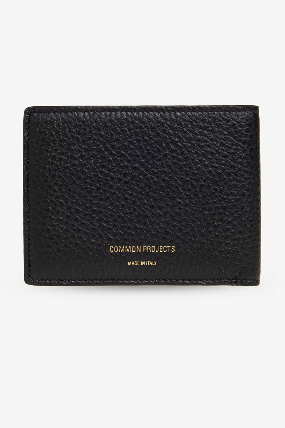 Black bifold wallet from Common Projects. Made of grained leather, this item is decorated with a gold-tone logo print and has a beige lining, one bill compartment and six internal card slots inside.
