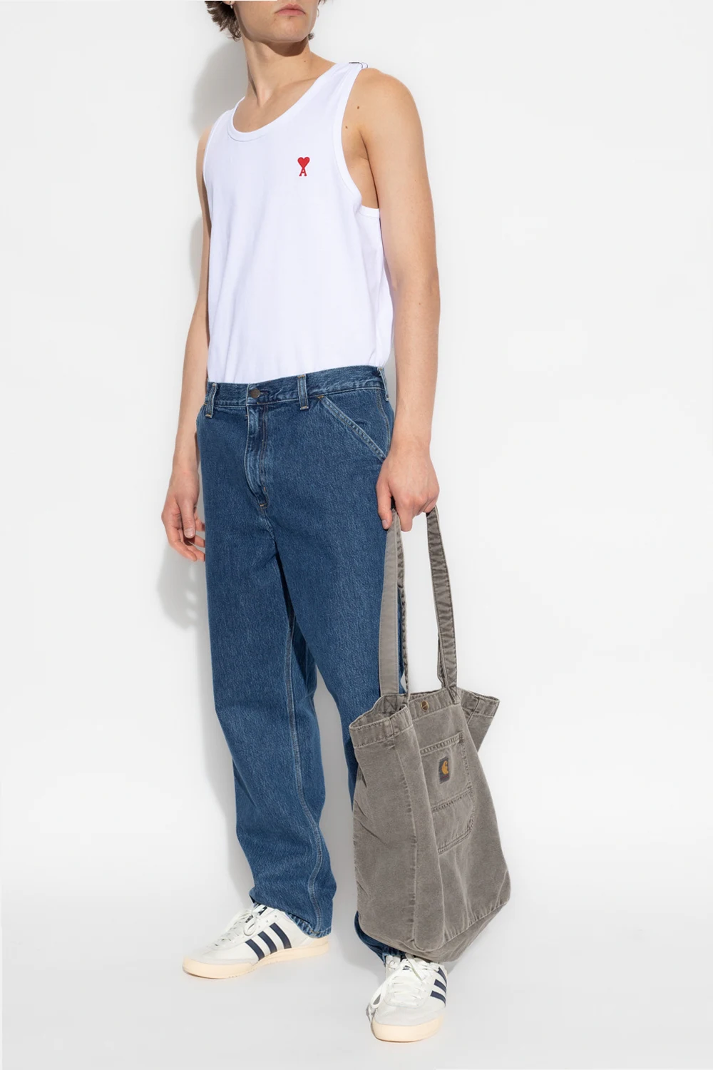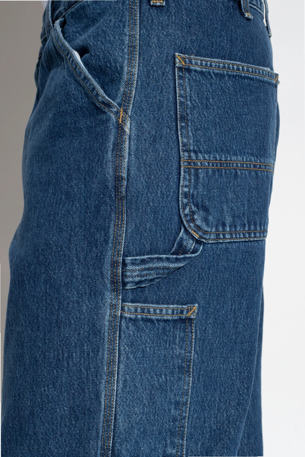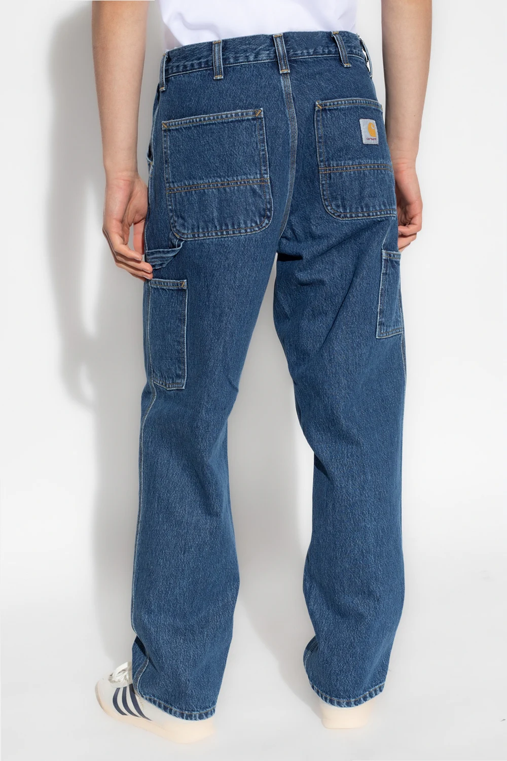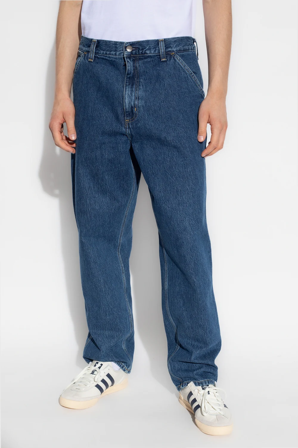 Dark blue ‘Single Knee’ jeans from Carhartt WIP. Falling with straight legs, this pair features a zip fly with a button, seven slip pockets and a logo patch at the back.