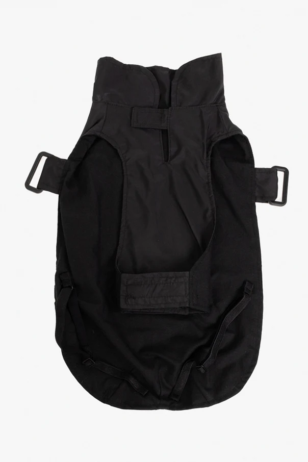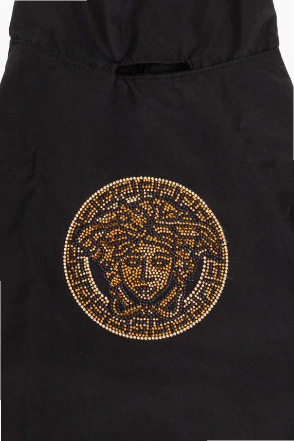 Black pet raincoat from Versace Home. Fastened with velcro straps, this pair showcases the label’s signature Medusa appliqué in black and gold-tone.