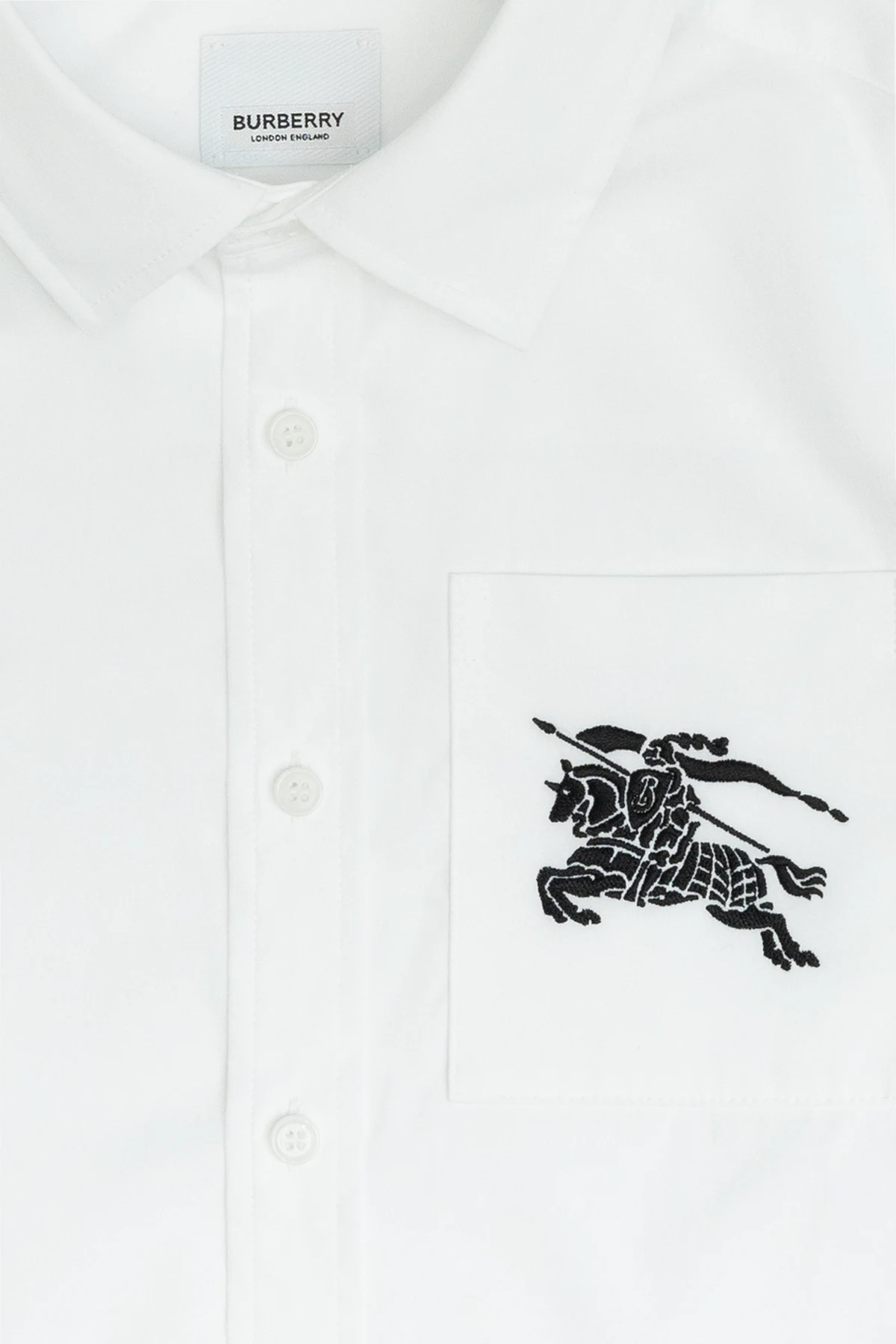 White shirt from Burberry Kids. Made of cotton, this short sleeve design features button fastenings, a black logo patch and slip pocket.