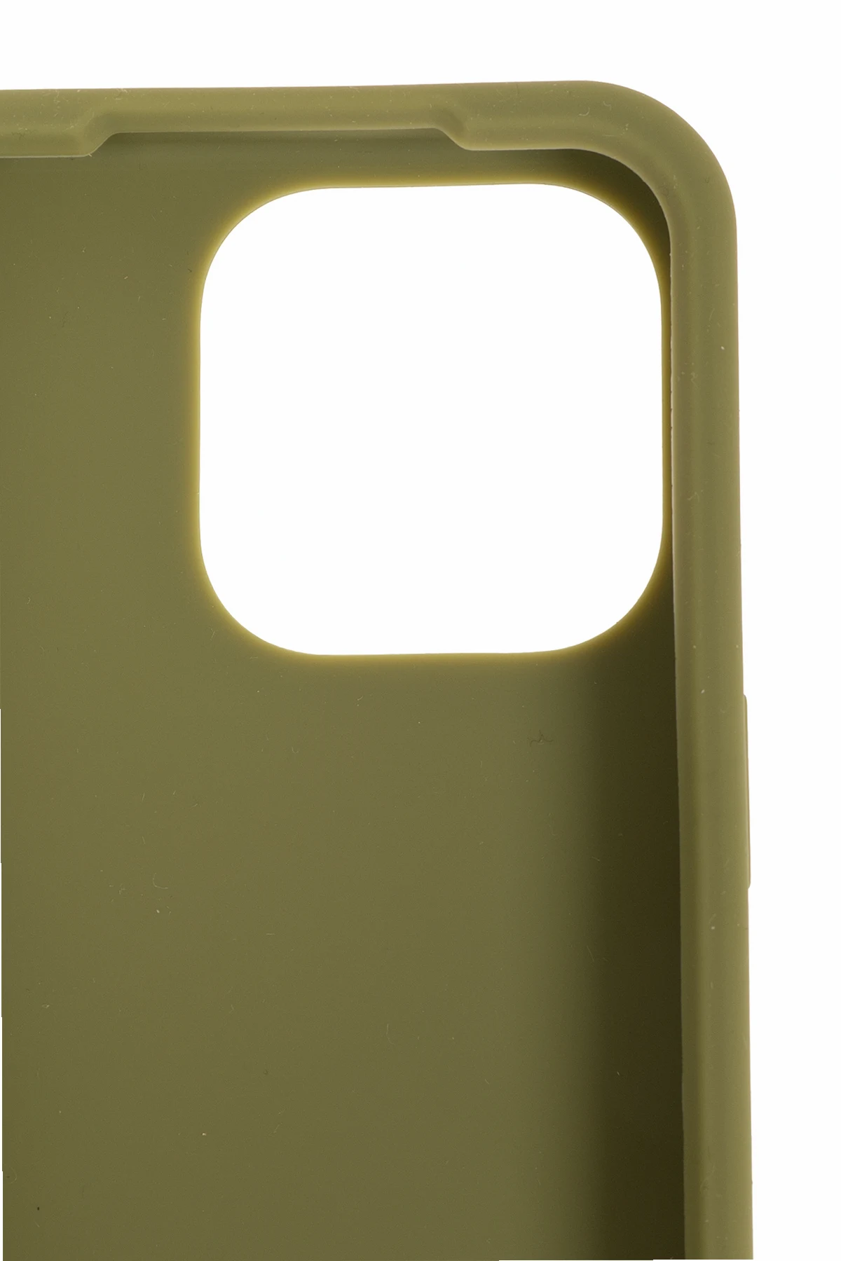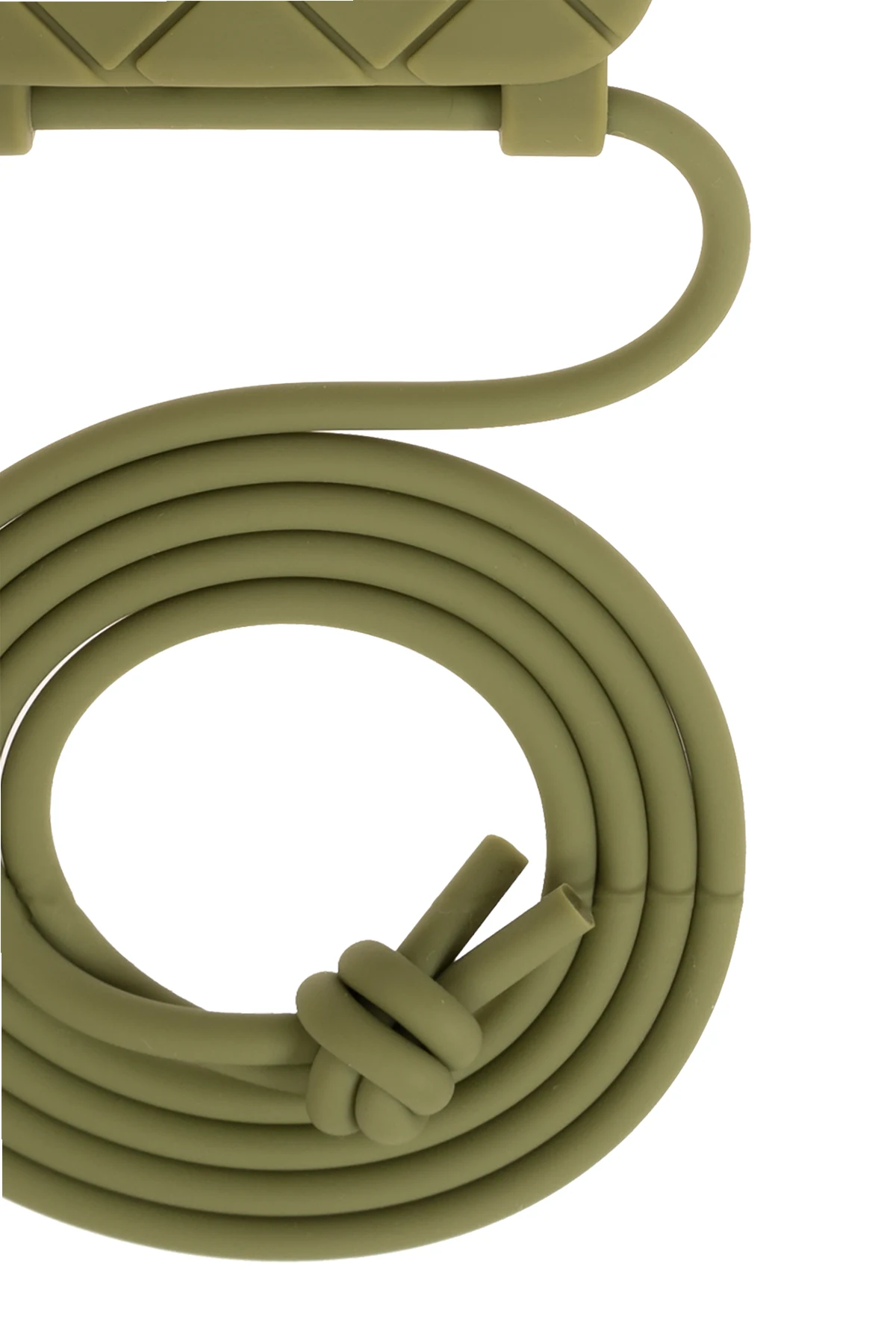 Khaki iPhone 15 Pro case from Bottega Veneta. Made of silicon decorated with the brand’s signature Intreccio pattern.