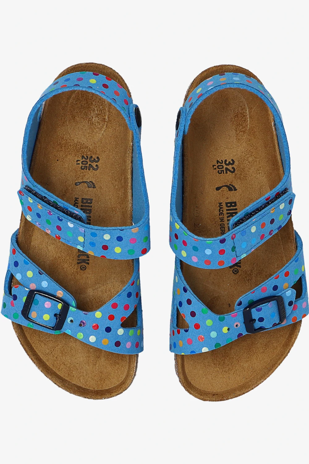 Blue ‘Colorado Rivet’ sandals from Birkenstock Kids. Made with microfibre, this model showcases a colourful polka dot pattern, a velcro closure, adjustable buckle straps, an anatomically shaped latex-cork footbed and a brown sole made of natural cork and navy blue EVA foam.