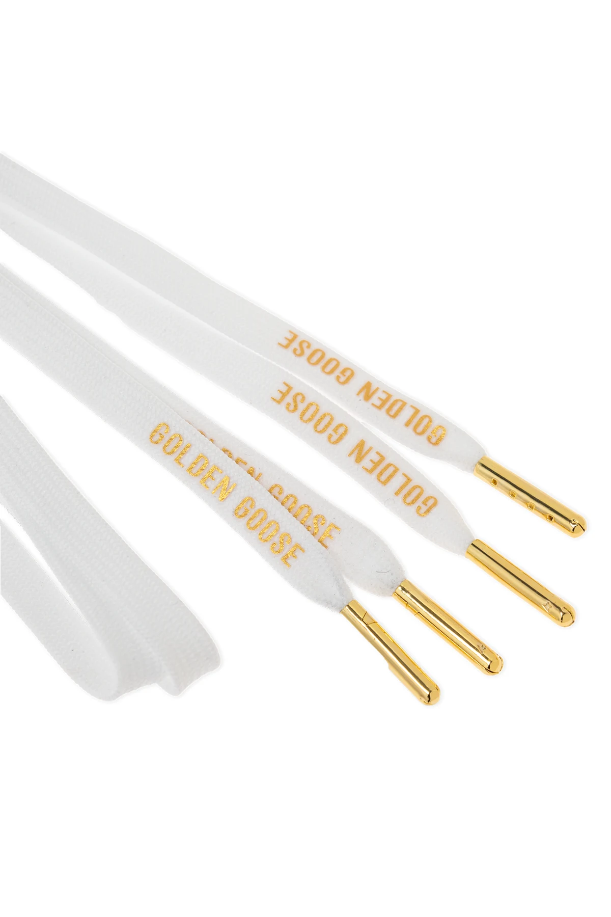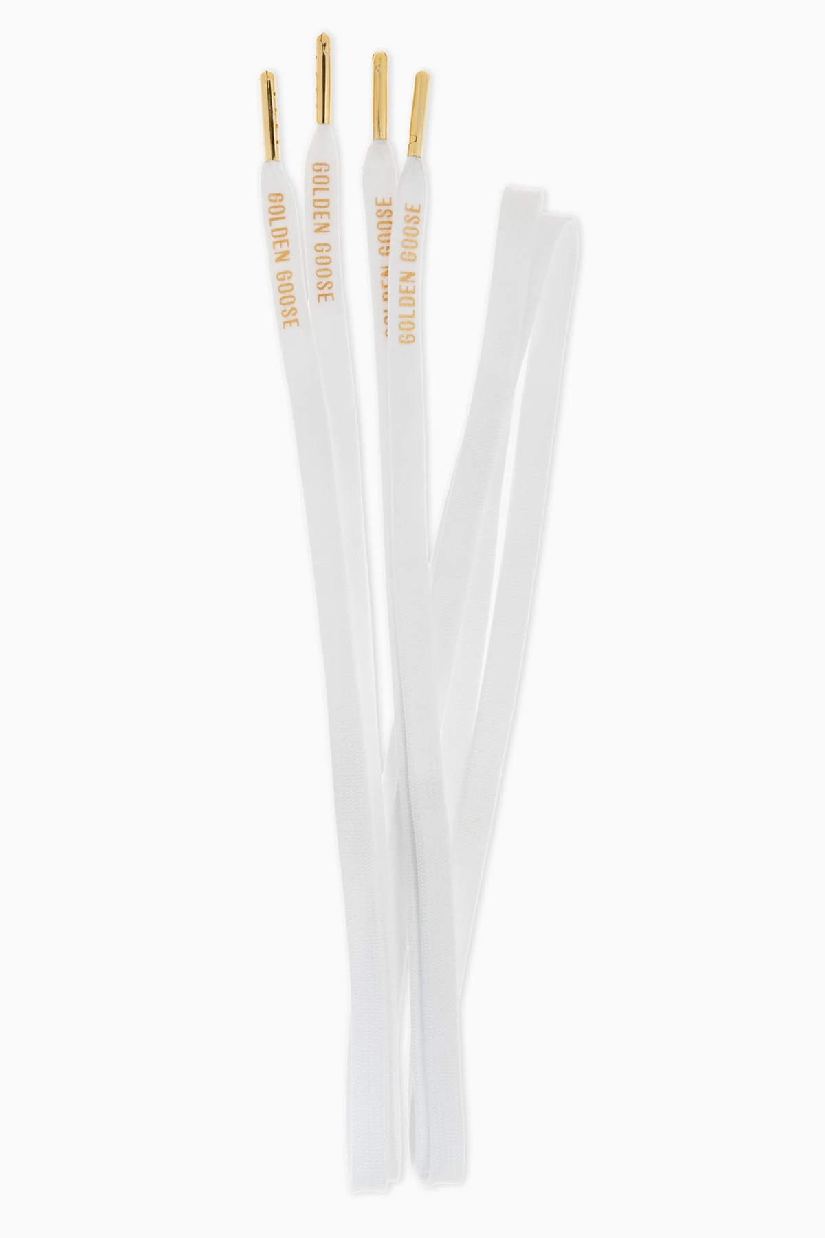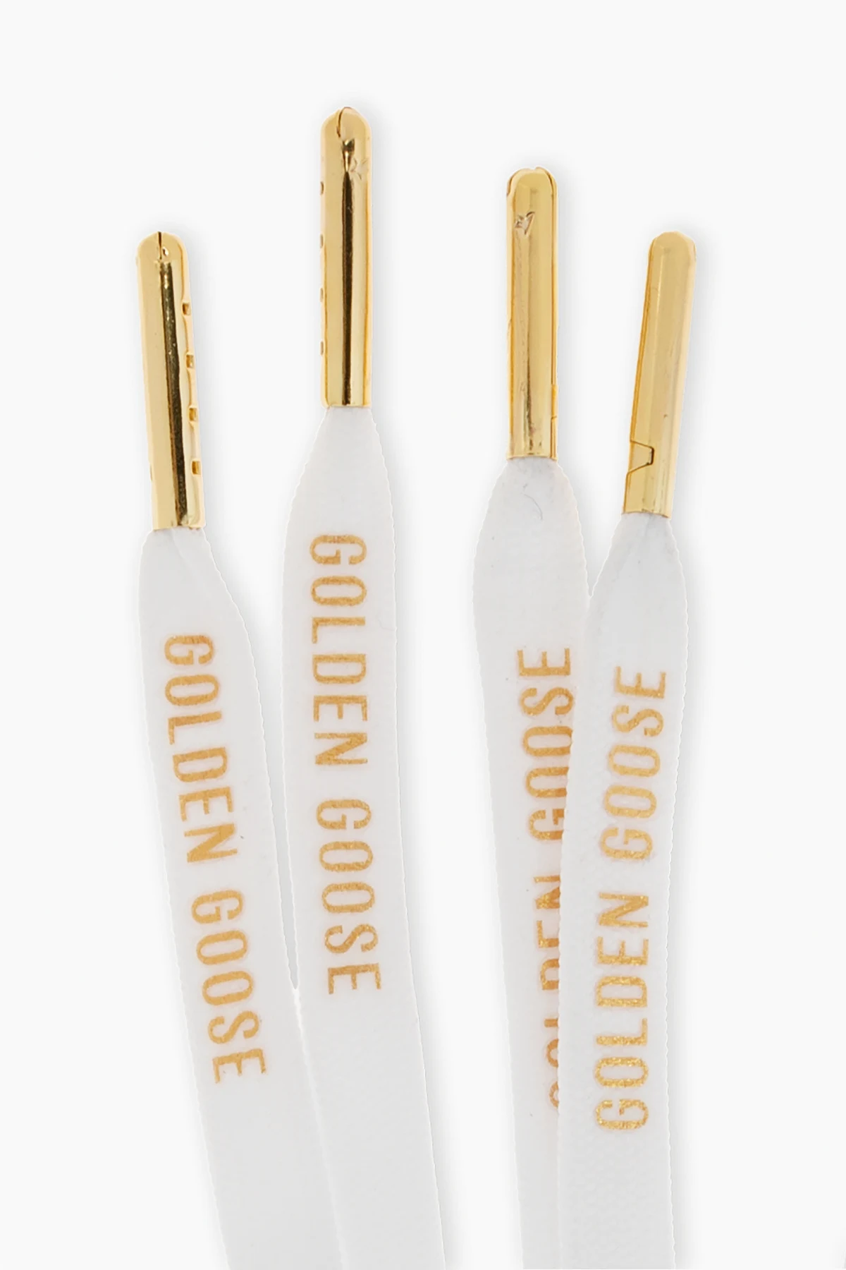 Wir präsentieren Schnürsenkel mit Logo von der exklusiven italienischen Marke Golden Goose , die elegant Eleganz und modernes Design verbinden. Die vorherrschende weiße Farbe, perfekt kontrastiert mit dem goldenen Schriftzug "GOLDEN GOOSE" , macht diese Schnürsenkel zu einem einzigartigen Accessoire.