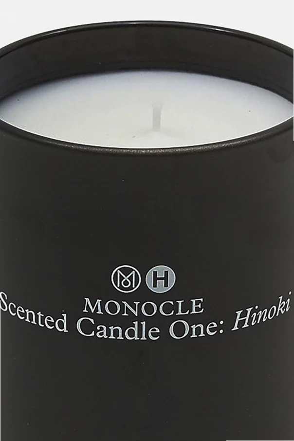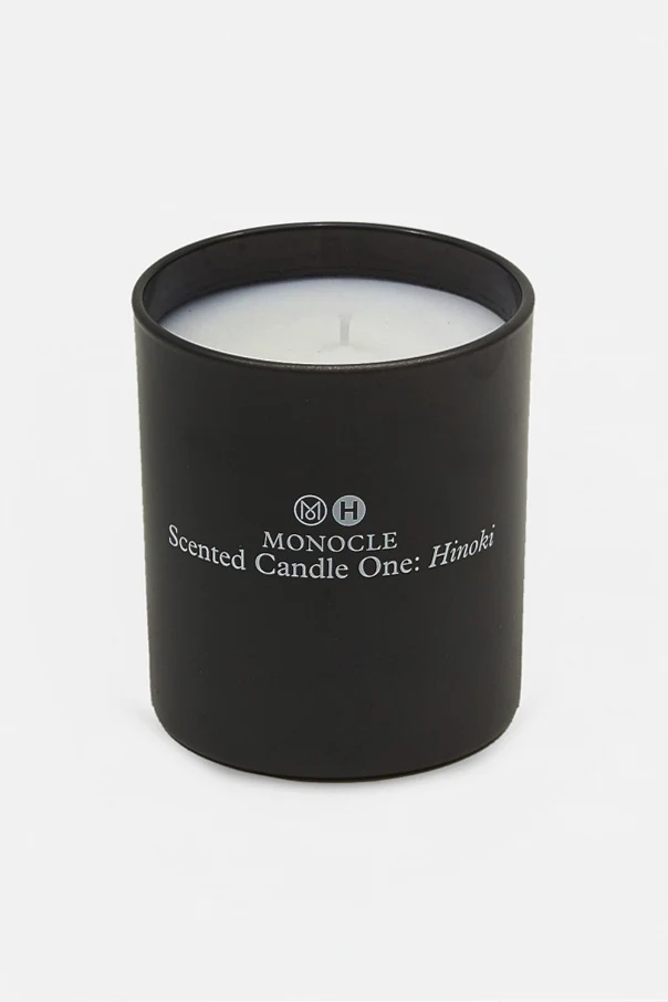 Black ‘Monocle One Hinoki’ scented candle from Comme des Garcons. Encased in a porcelain vessel with a wax logo print, this candle has the following scent notes: cypress, terebenthine, campher, cedar, thyme, pine, georgywood, encens, treemoss, vetiver.