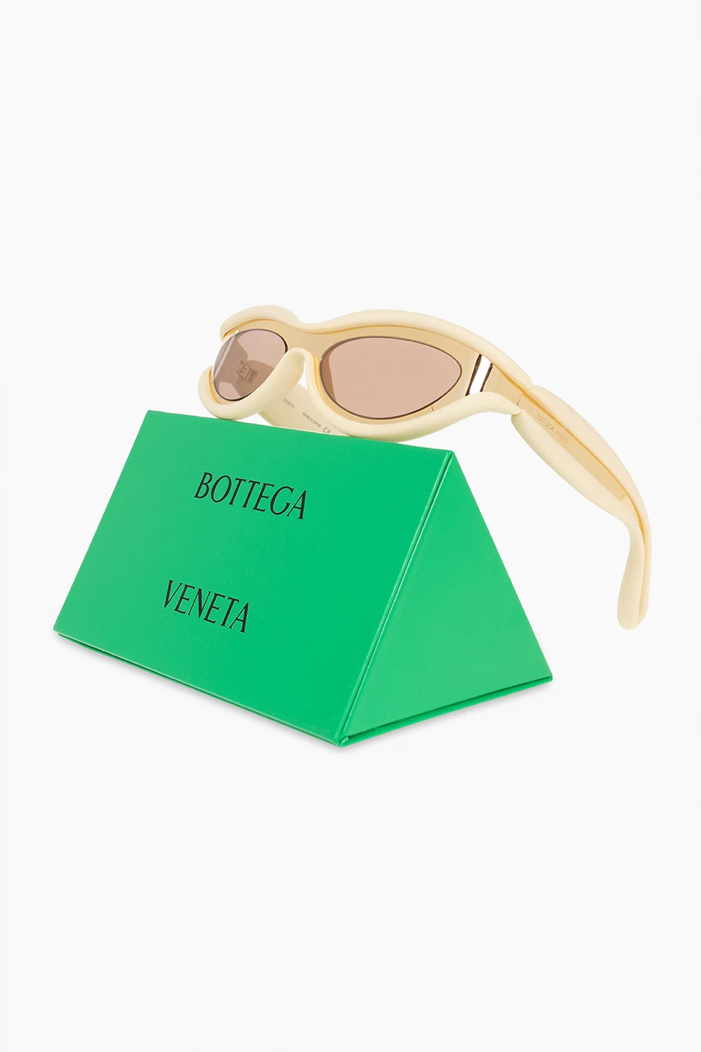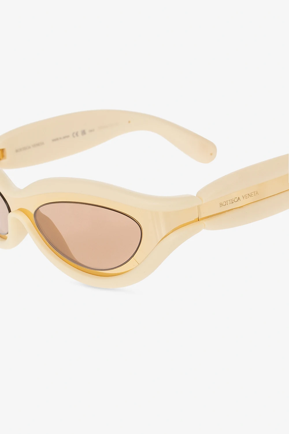 Light yellow and gold-tone ‘Hem’ sunglasses from Bottega Veneta. Crafted from rubber and metal, this model features a mask design with logo detailing and brown lenses with 100% UV protection.