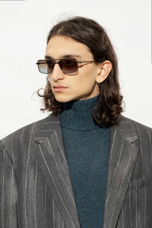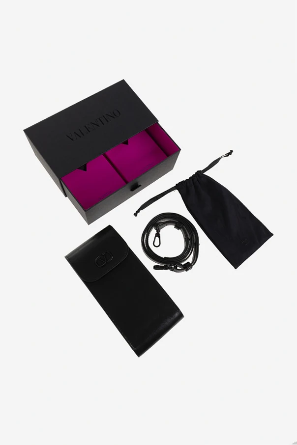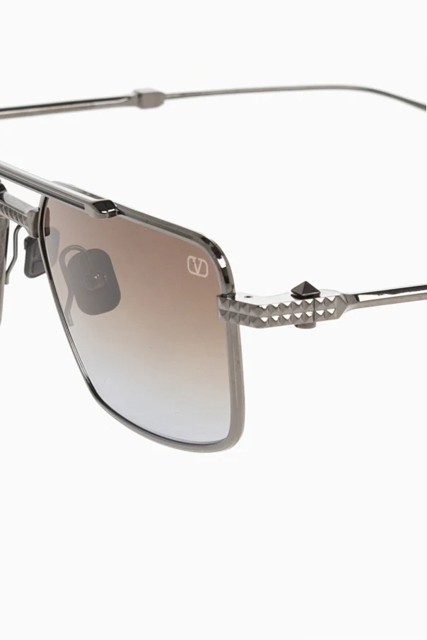 Dark silver-tone sunglasses from Valentino Eyewear. This pair has a custom black rhodium titanium frame, double nose bridge with tridimensional studs line pressed, titanium navy brow bar enamel, custom stud shaped top hinge screw, ceramic logo-embossed nose pads, RFID chip on left bottom temple tip as well as brown and blue gradient lenses with 100% UV protection. Handcrafted in Japan. Comes with a recycled leather case with strap and cleaning cloth.