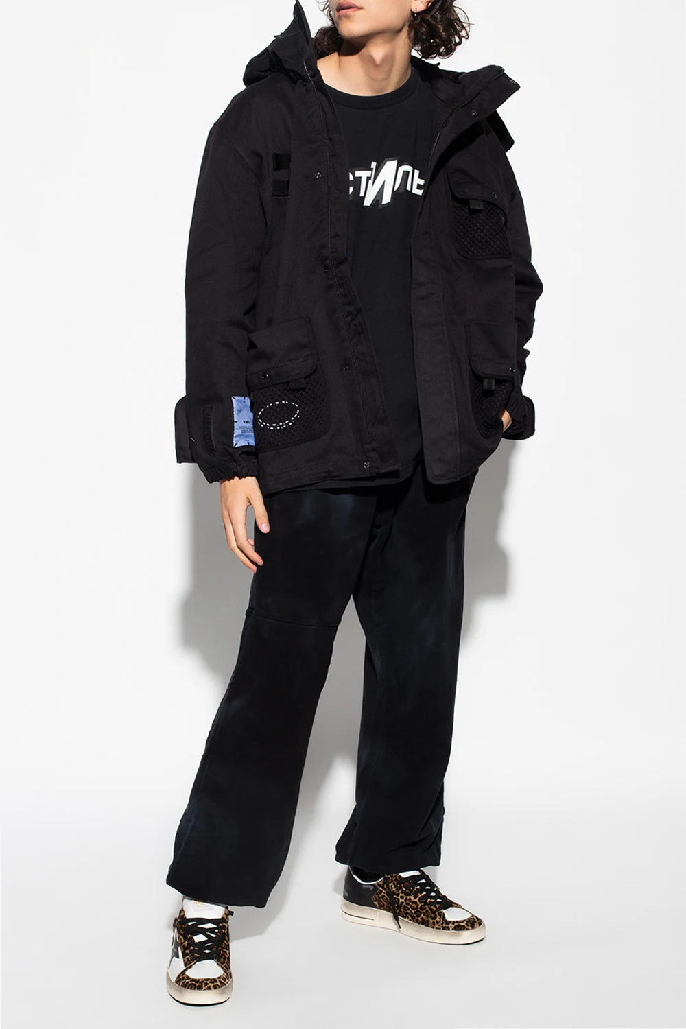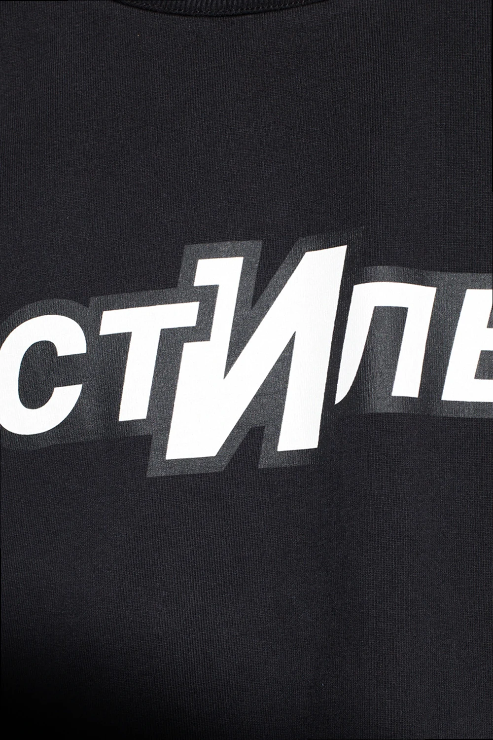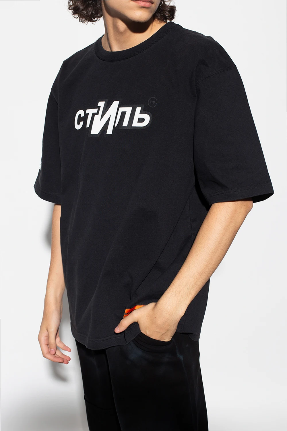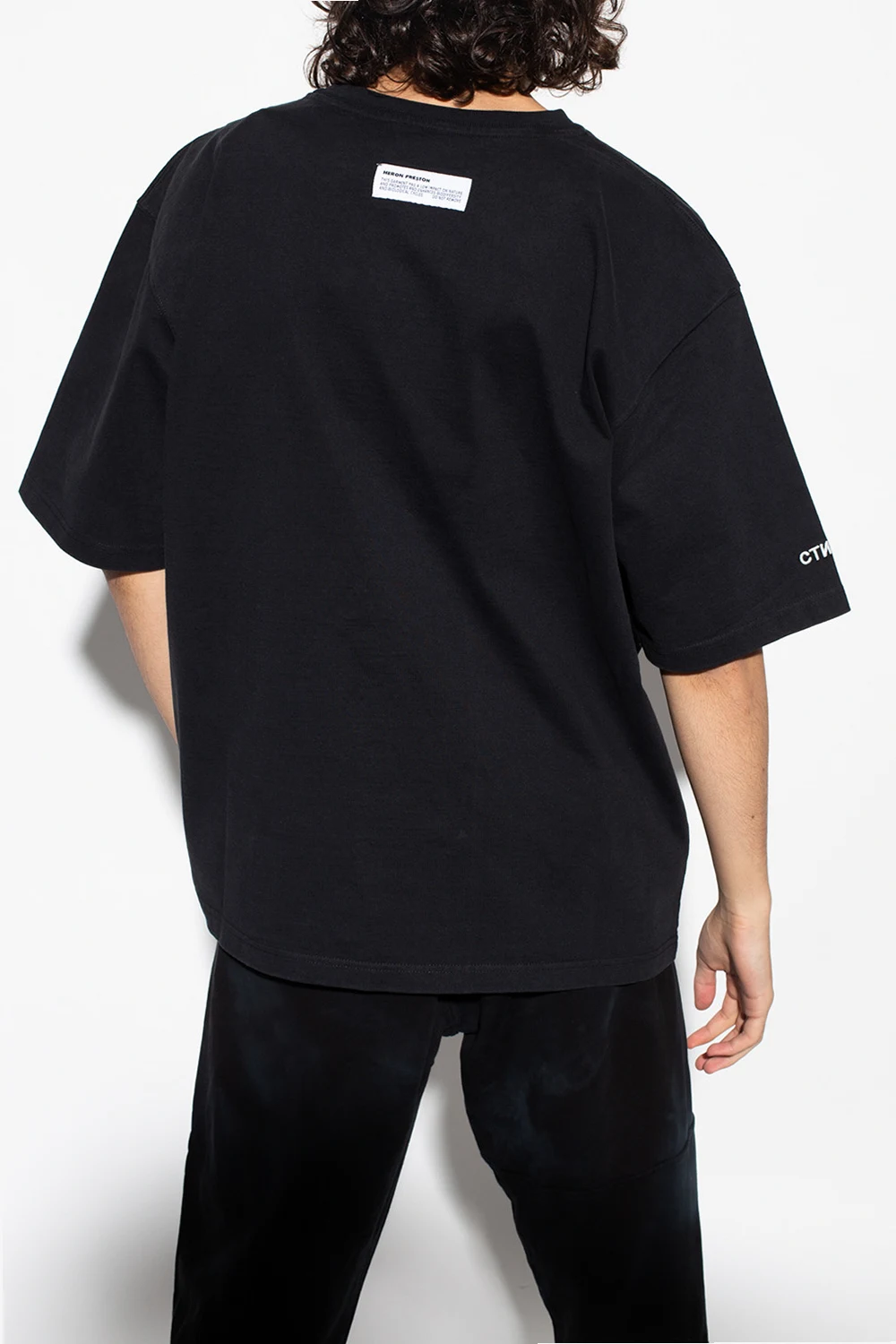 Black T-shirt from Heron Preston. Made of organic cotton, this oversize design features a white and black print, patches, white logo embroidery on one sleeve and a ribbed crewneck.