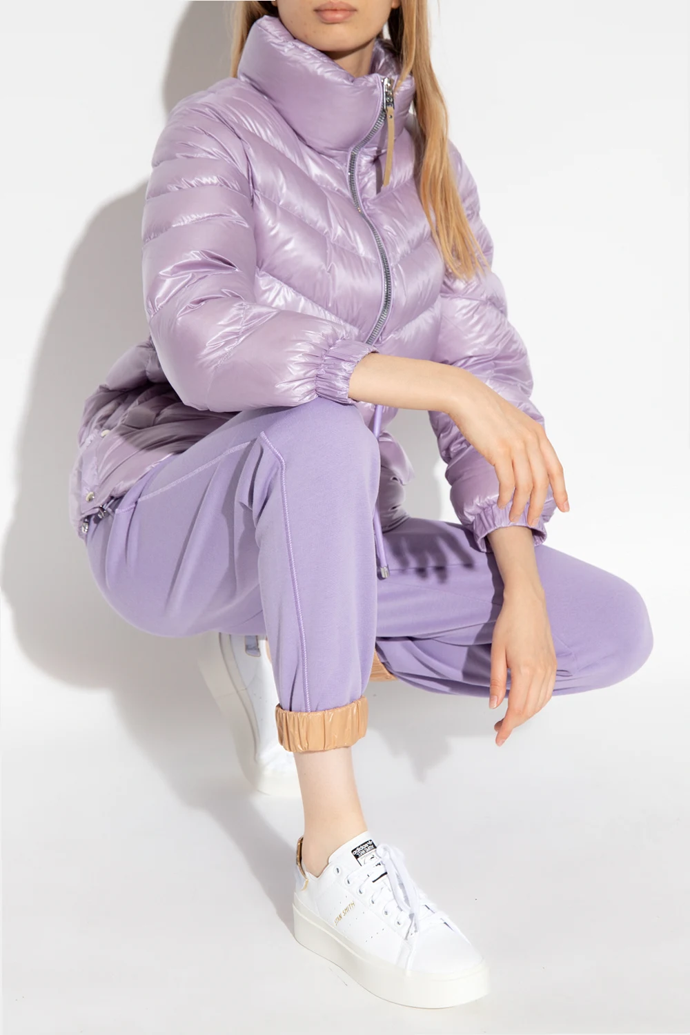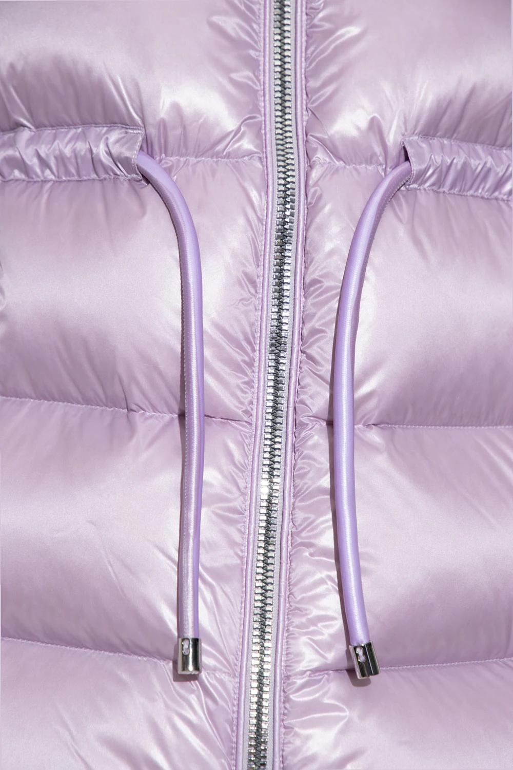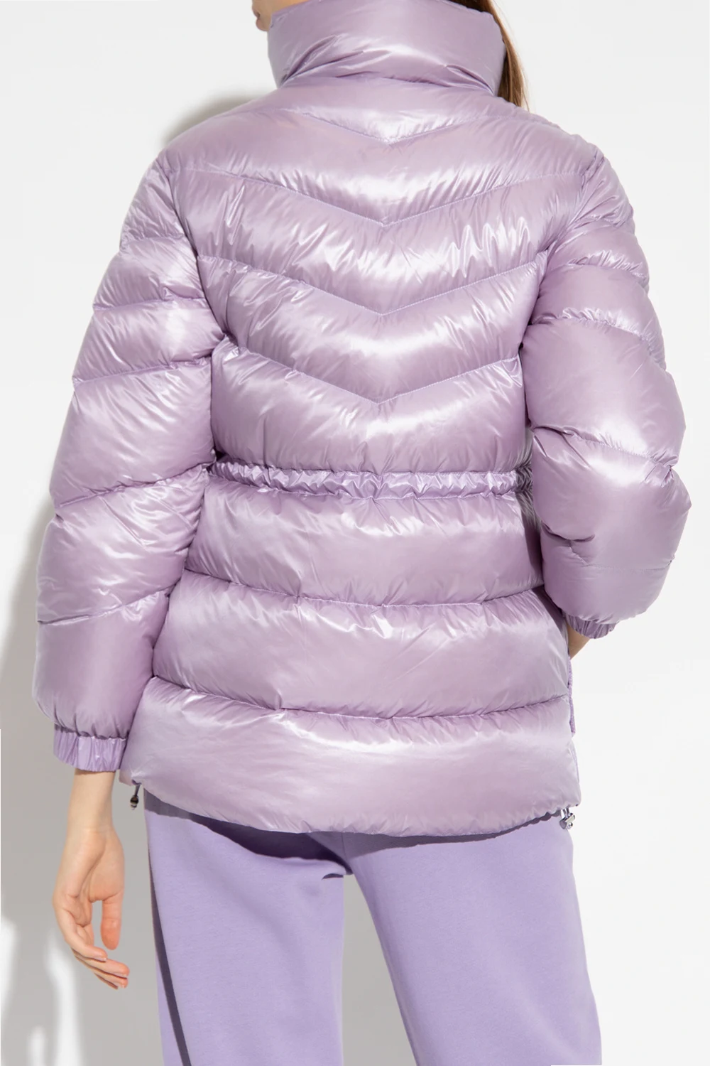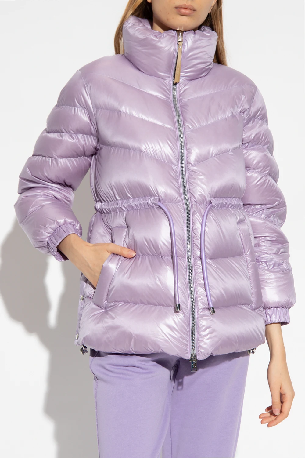 Purple puffer jacket with a standing collar from Woolrich. Fastened with a two-way zipper, this style features a waist-cinching drawstring belt, two snap-fastened pockets and long sleeves with elasticated cuffs.