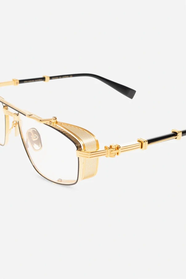 Black and gold-tone ‘Brigade V’ optical glasses from Balmain. This pair features vintage style elements, black titanium side shields, double bridge, adjustable nose pads and logo on the temples. Comes with a case.