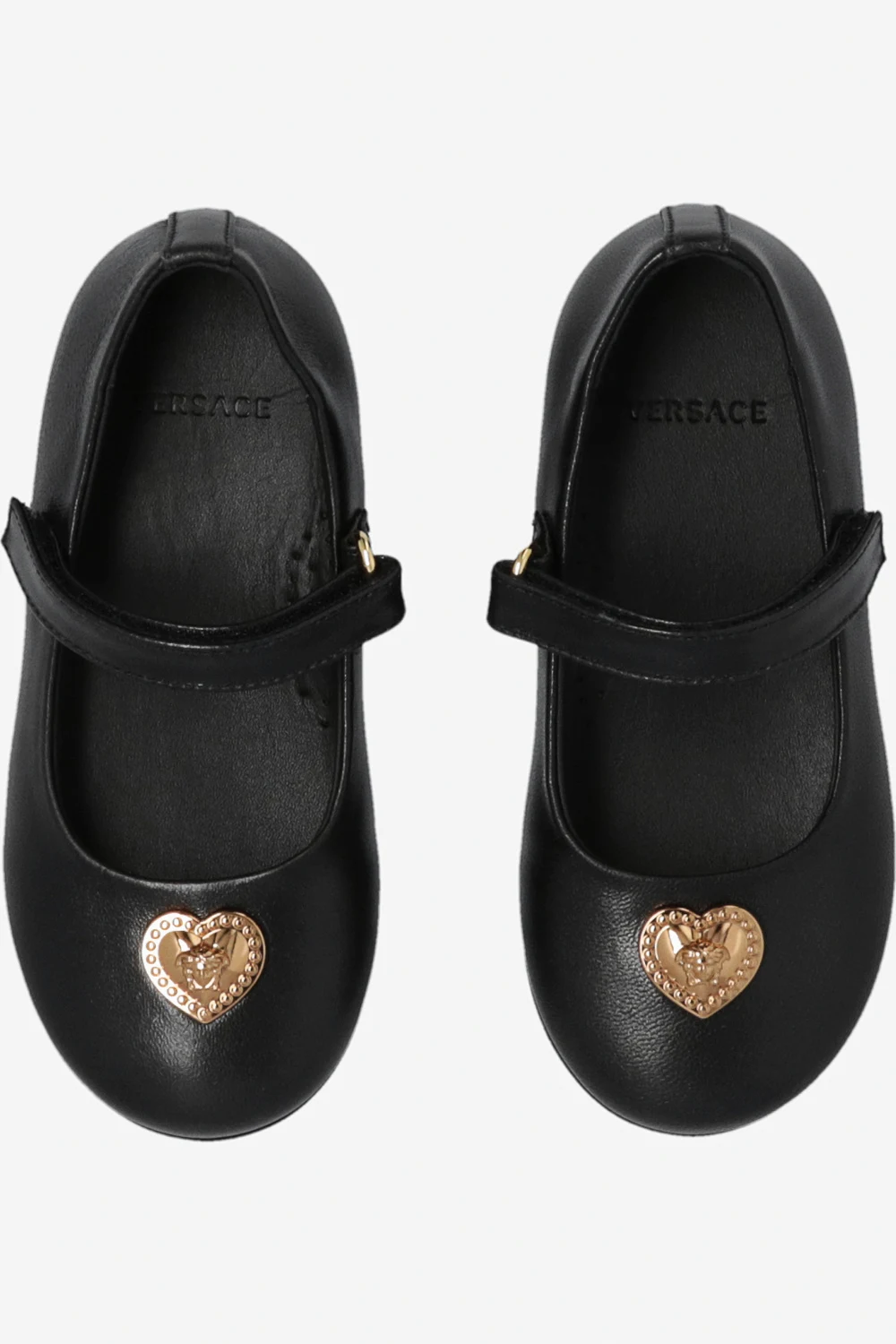 Black ballet flats from Versace Kids. Made of leather, this model sits on a black rubber sole and showcases the brand's signature Medusa hardware on the front and a velcro closure.