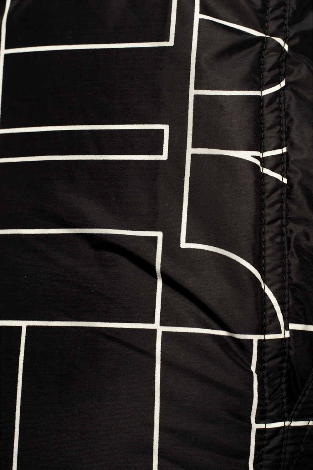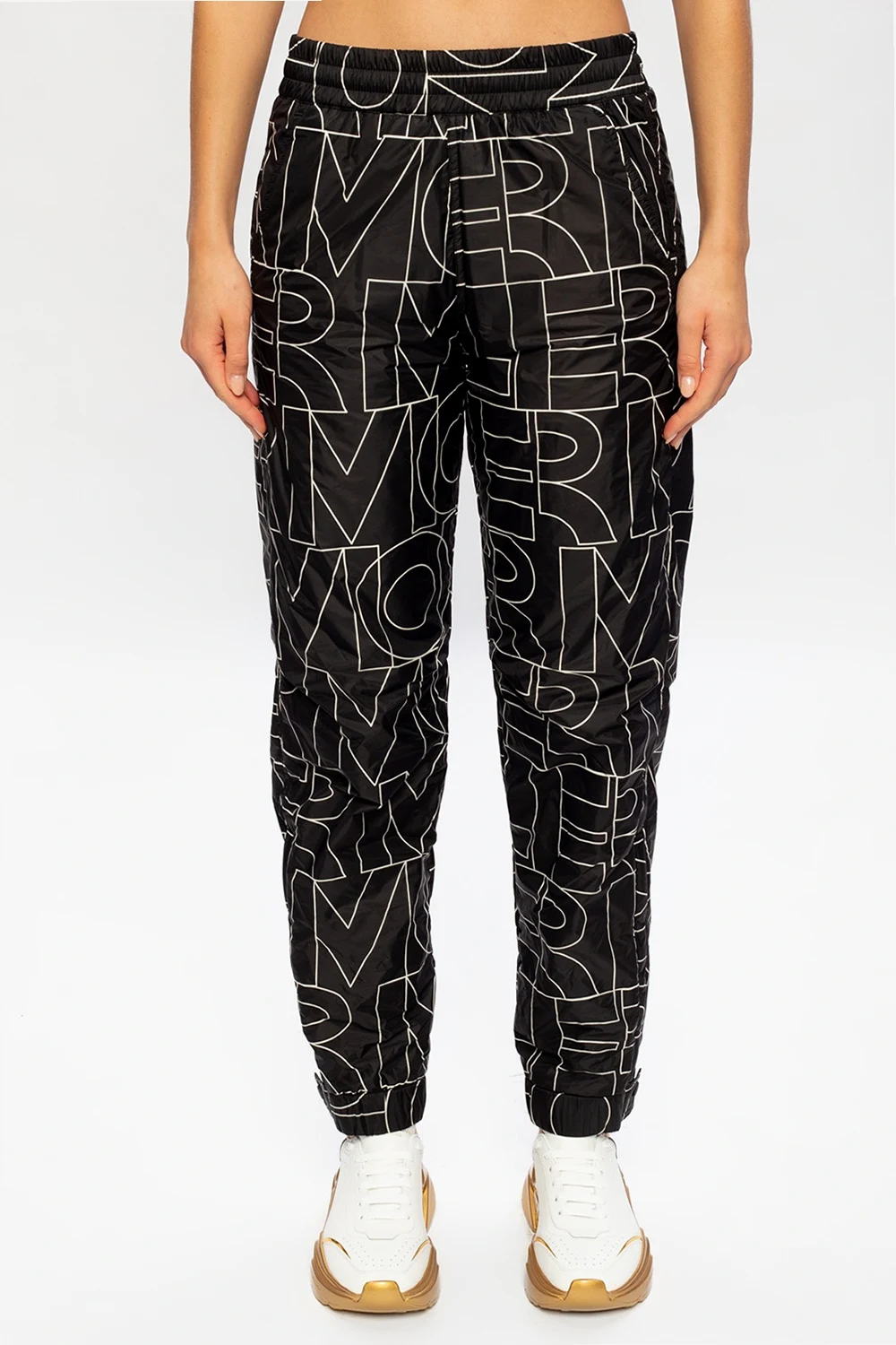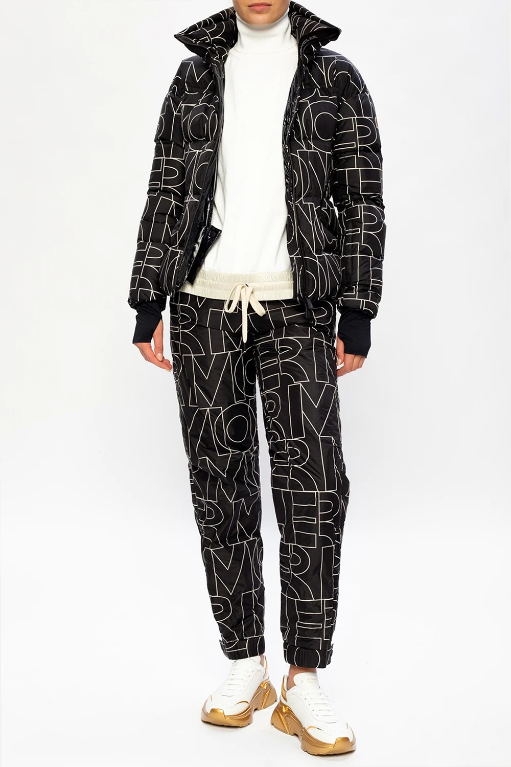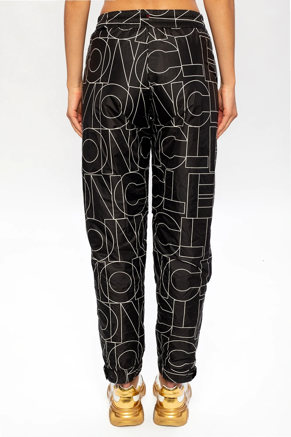 Black trousers from Moncler Grenoble. Tied with drawstrings, this design features a printed logo pattern in white and two slip pockets as well as zip and snap fasteners at the legs.