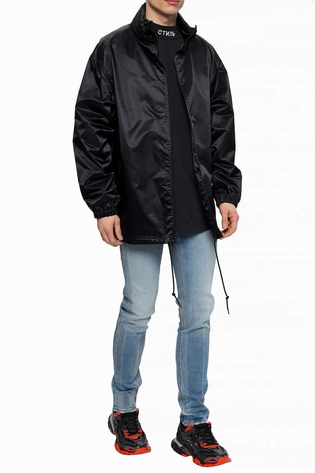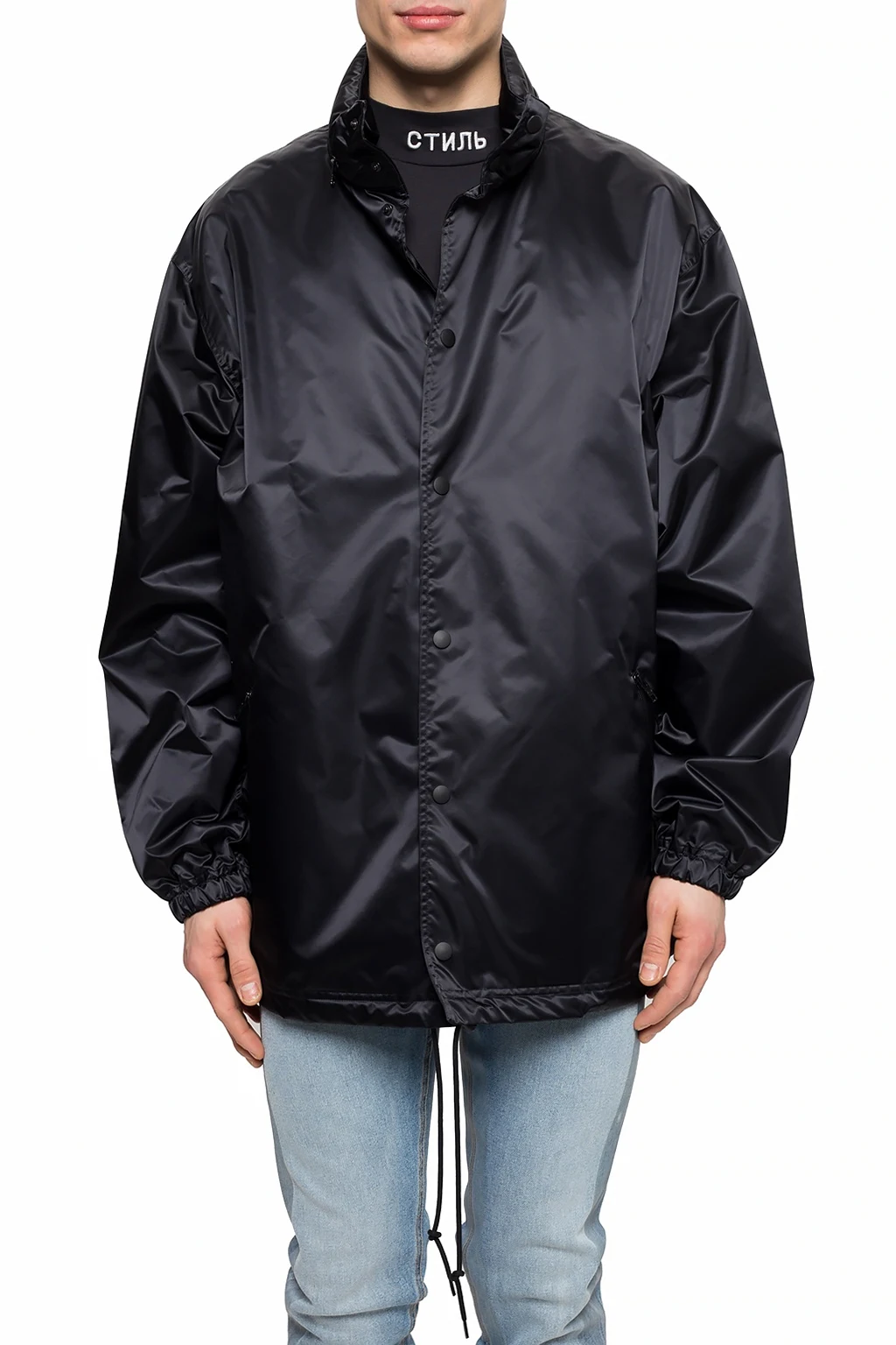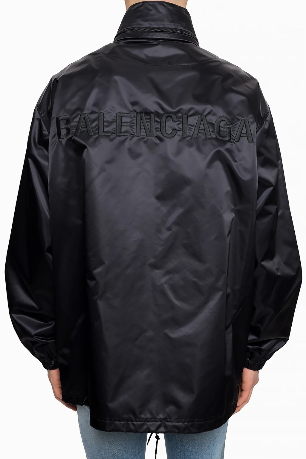 Black coat with a band collar from Balenciaga. Snap fastenings. Hood concealed in the collar. Features two zip pockets. Elasticated cuffs. Drawstring bottom hem.