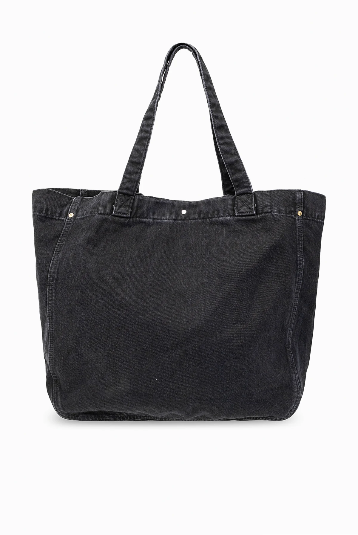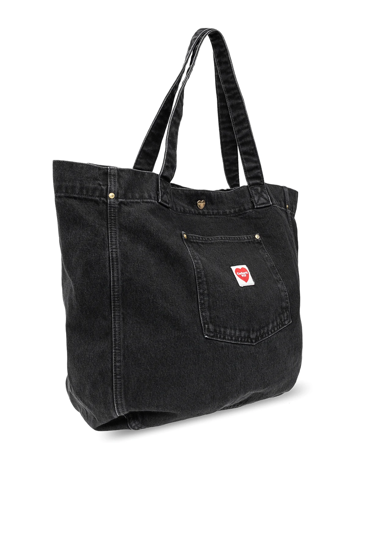 Dark grey ‘Natt’ shopper bag from Carhartt WIP. Crafted from cotton, this design showcases a white and red logo patch, one slip pocket, gold-tone metal hardware and one internal compartment with a zip pocket.