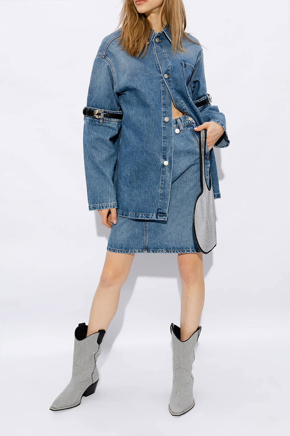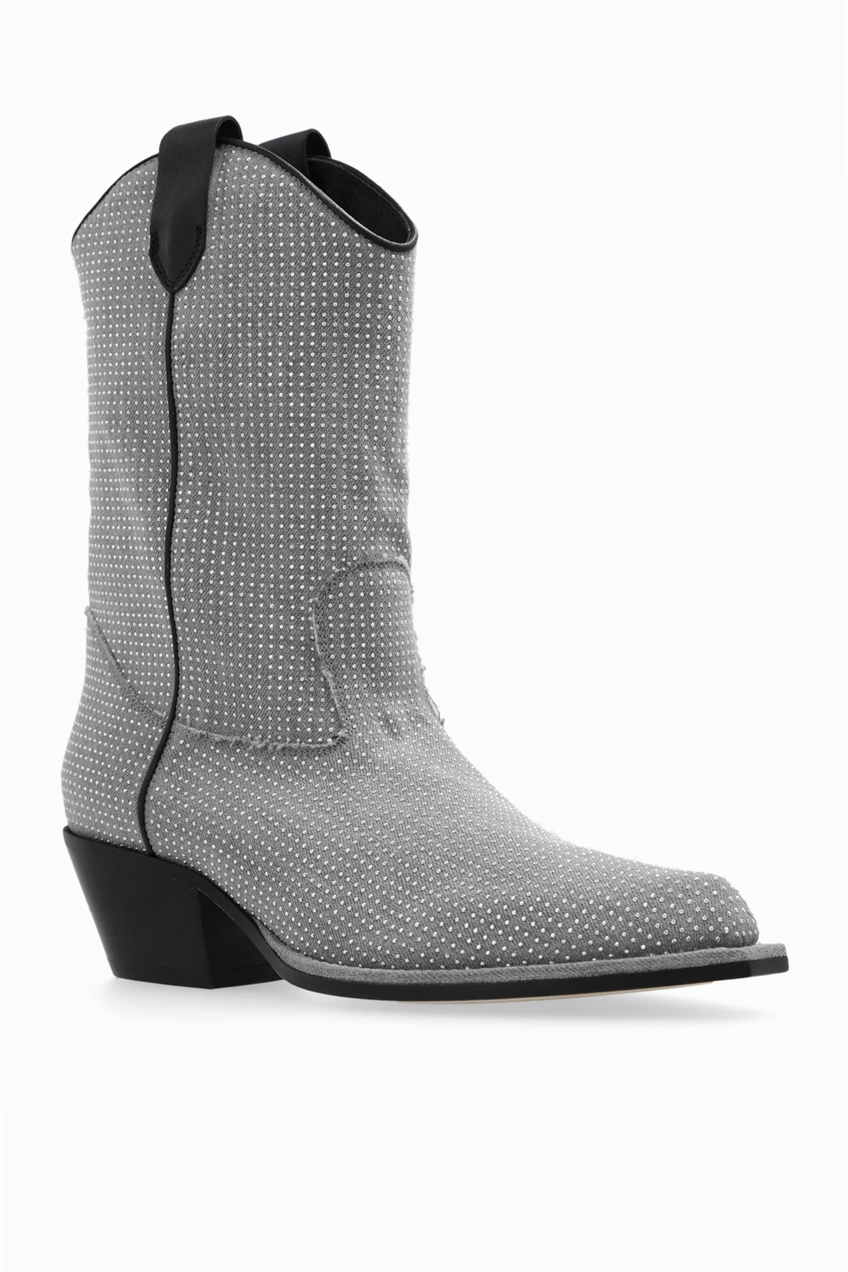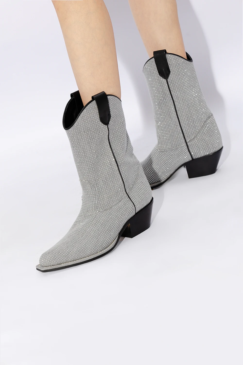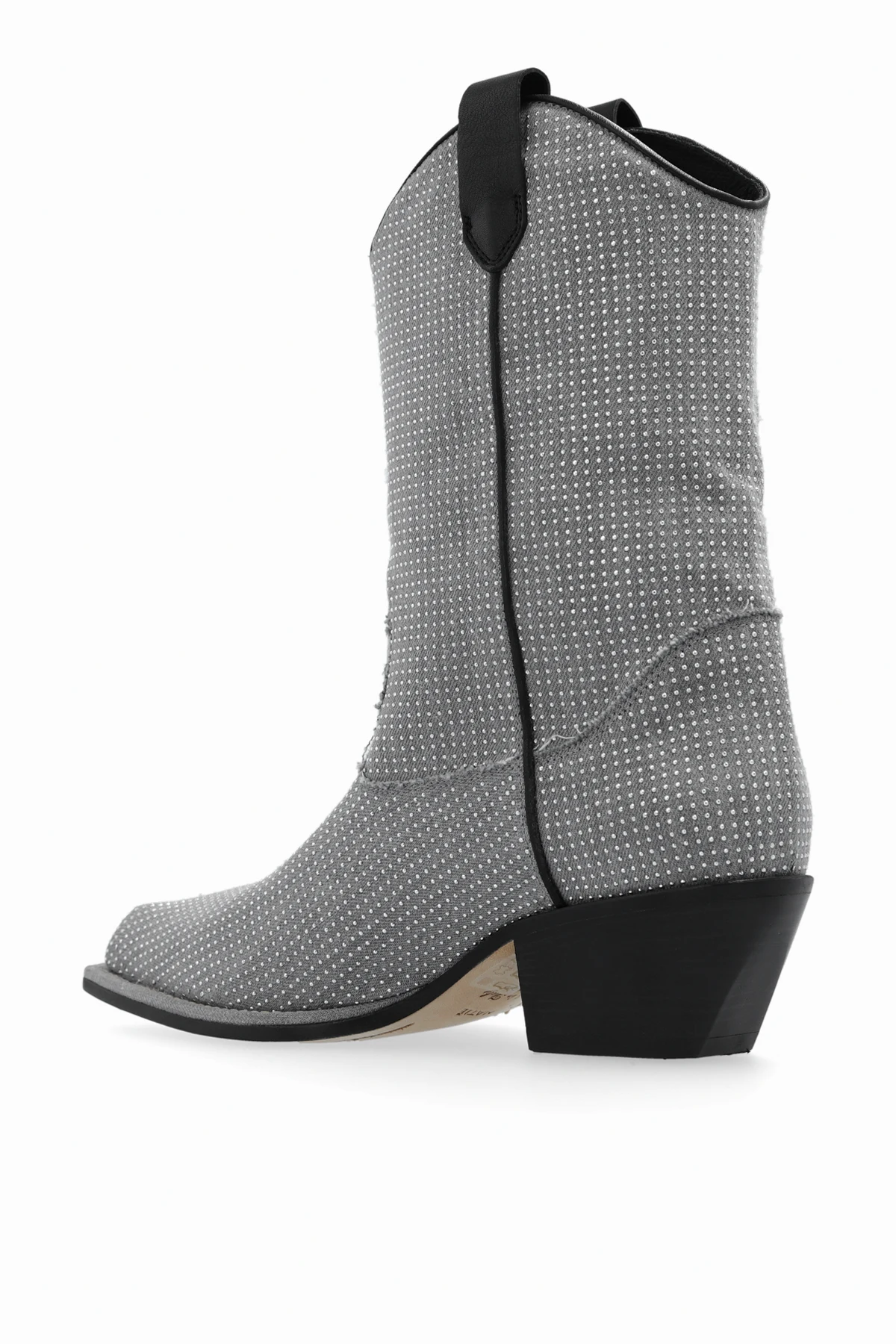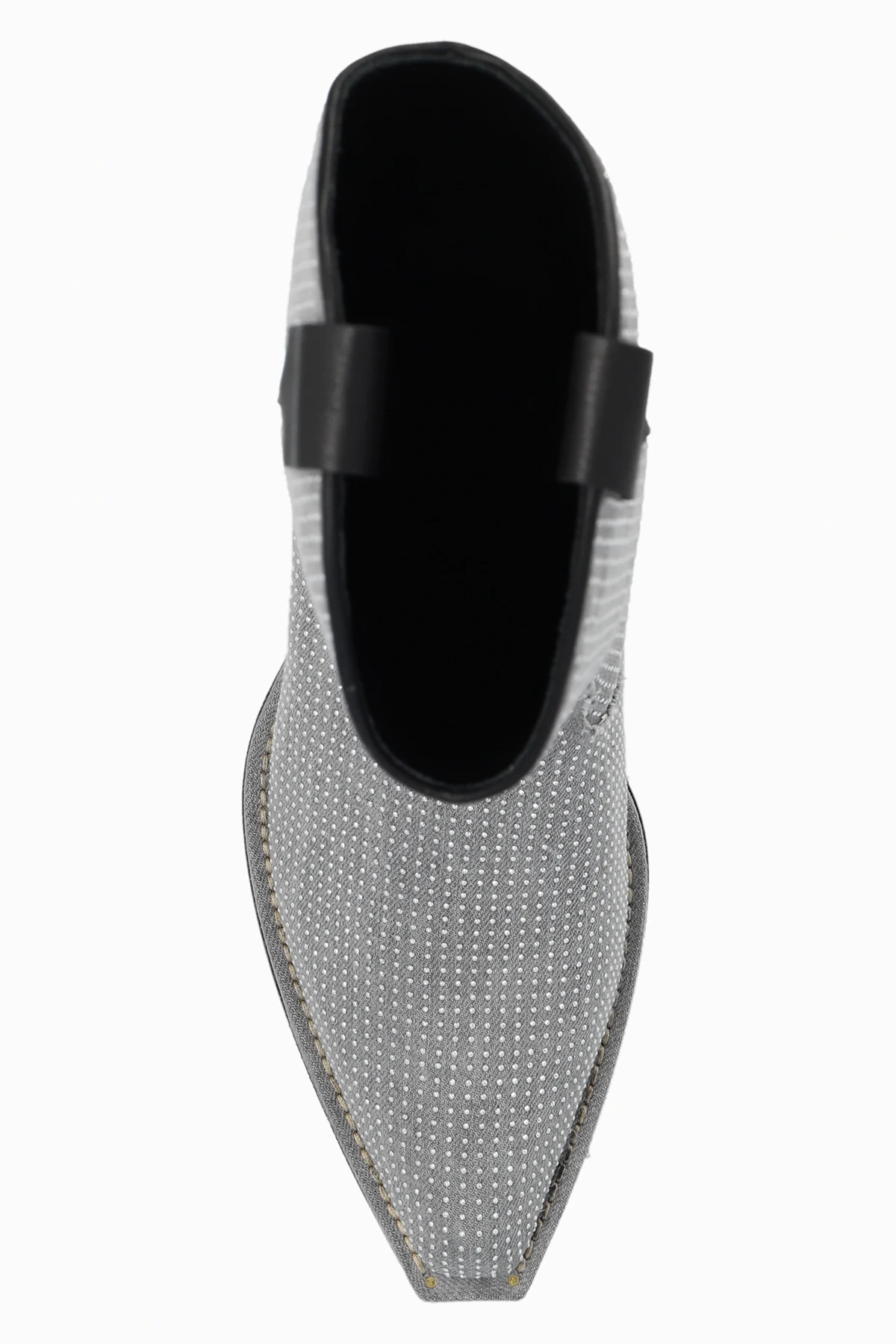Light grey heeled ankle boots from Vic Matie. Made of denim with a vintage effect and sequins, this slip-on pair features black leather trims, a pointed toe, black heel and light beige leather sole.