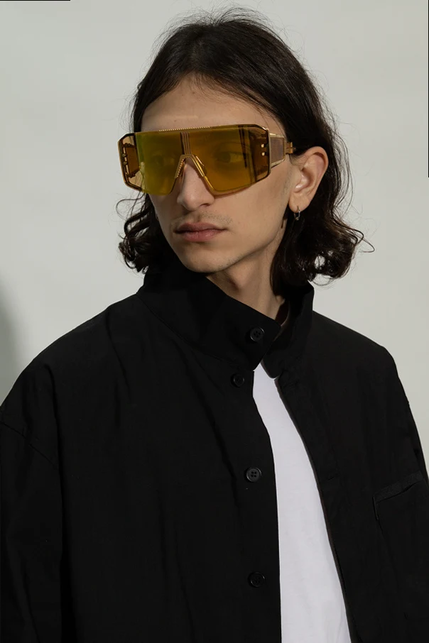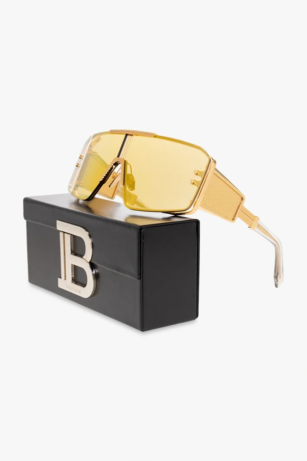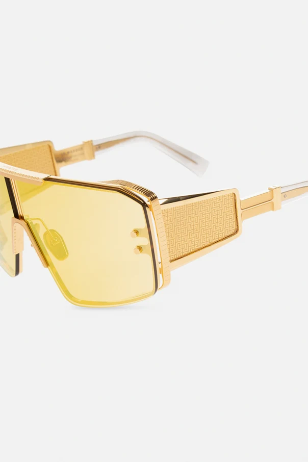 Gold-tone ‘Le Masque’ sunglasses from Balmain. This design features a mask frame with an cut-out insert at the bride and adjustable nose pads, wide temples with transparent details, monogram and black tips as well as yellow anti-glare lenses with 100% UV protection.