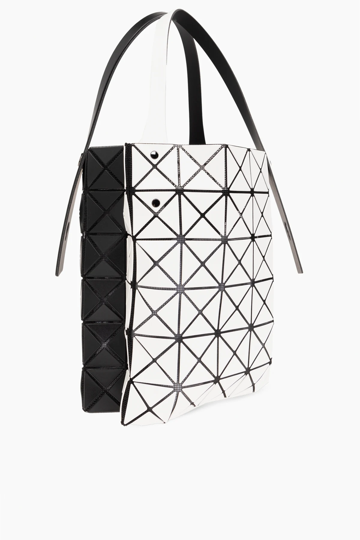 Wir präsentieren Ihnen die exquisite Handtasche ‘Duo’ von der renommierten Marke Bao Bao Issey Miyake , die die Quintessenz innovativen Designs und Funktionalität darstellt. Diese exklusive Tasche, verfeinert in jedem Zentimeter, wurde aus strapazierfähigem Polyvinylchlorid und Polyester gefertigt, während ihre Oberfläche mit gummierten Applikationen bedeckt ist, die ein geometrisches, dreidimensionales Muster mit mattem Finish kreieren. Die Dominanz von Weiß, unterbrochen durch schwarze Linien, verleiht dem Produkt einen einzigartigen, futuristischen Charakter.
