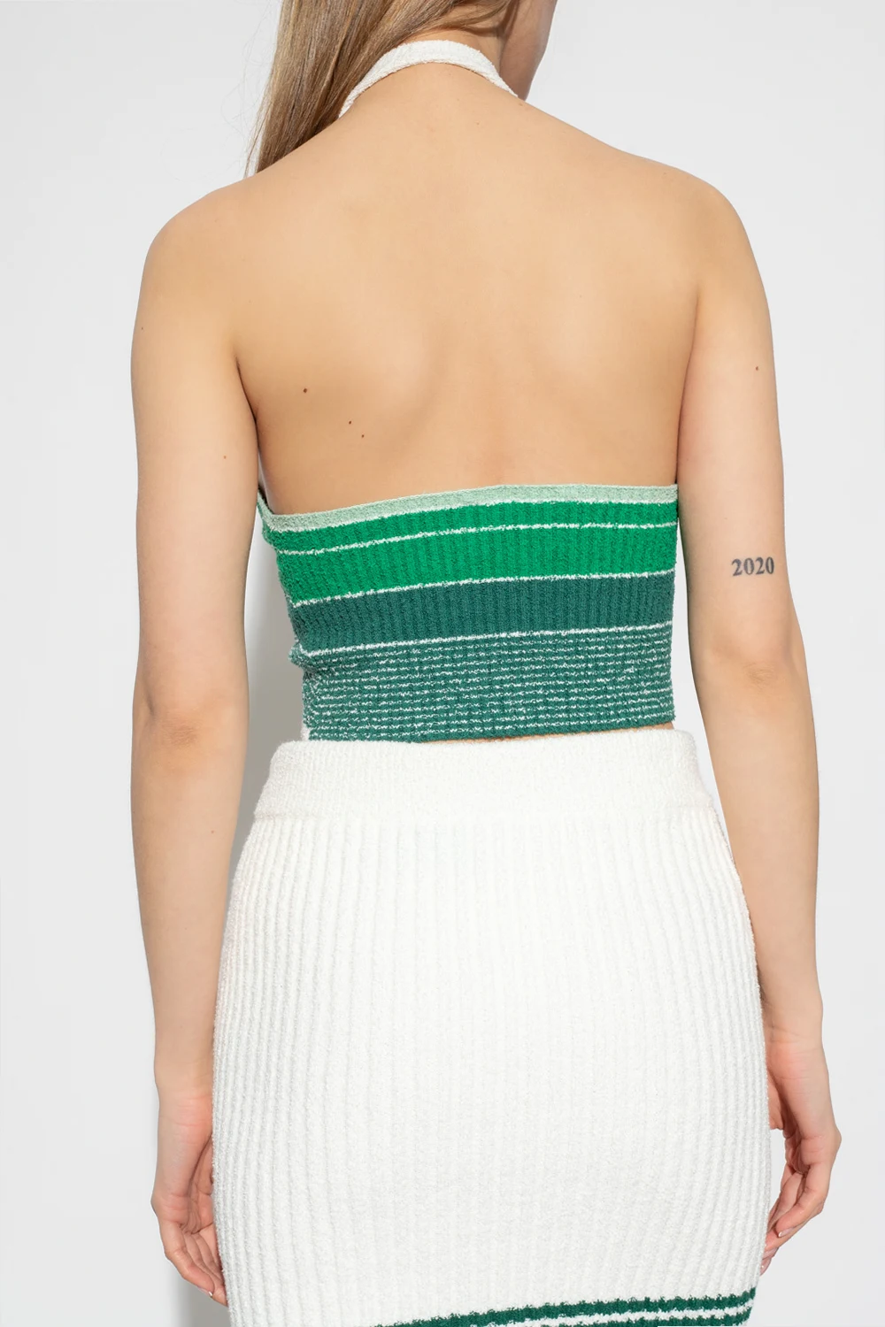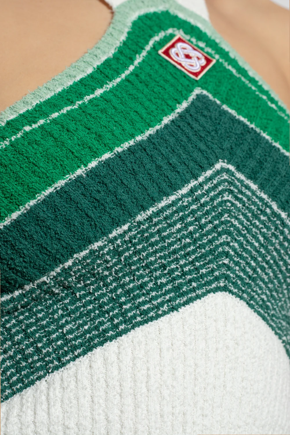 Green and white tank top from Casablanca. Crafted in ribbed terry cotton, this style features a halter neck, a red and cream logo patch and an elasticated bottom hem.