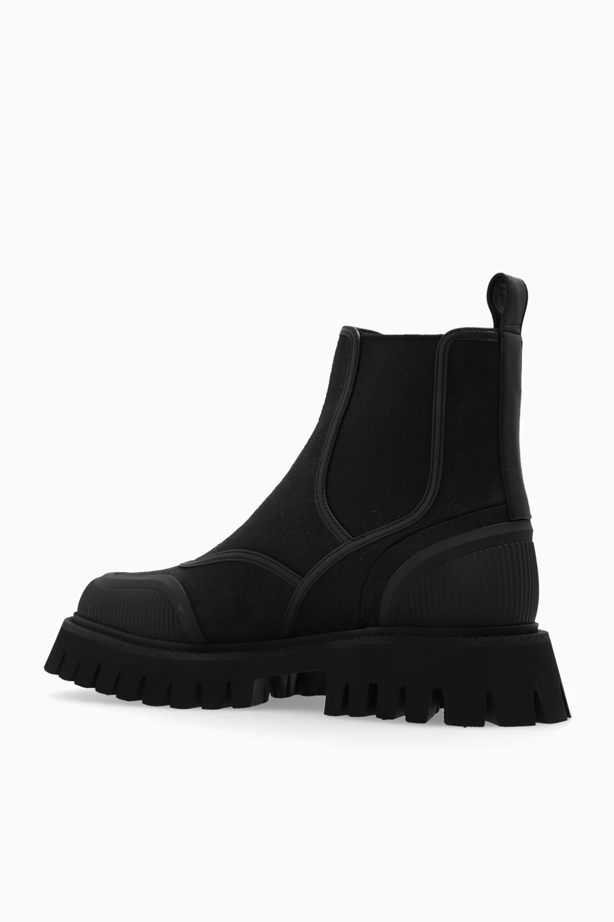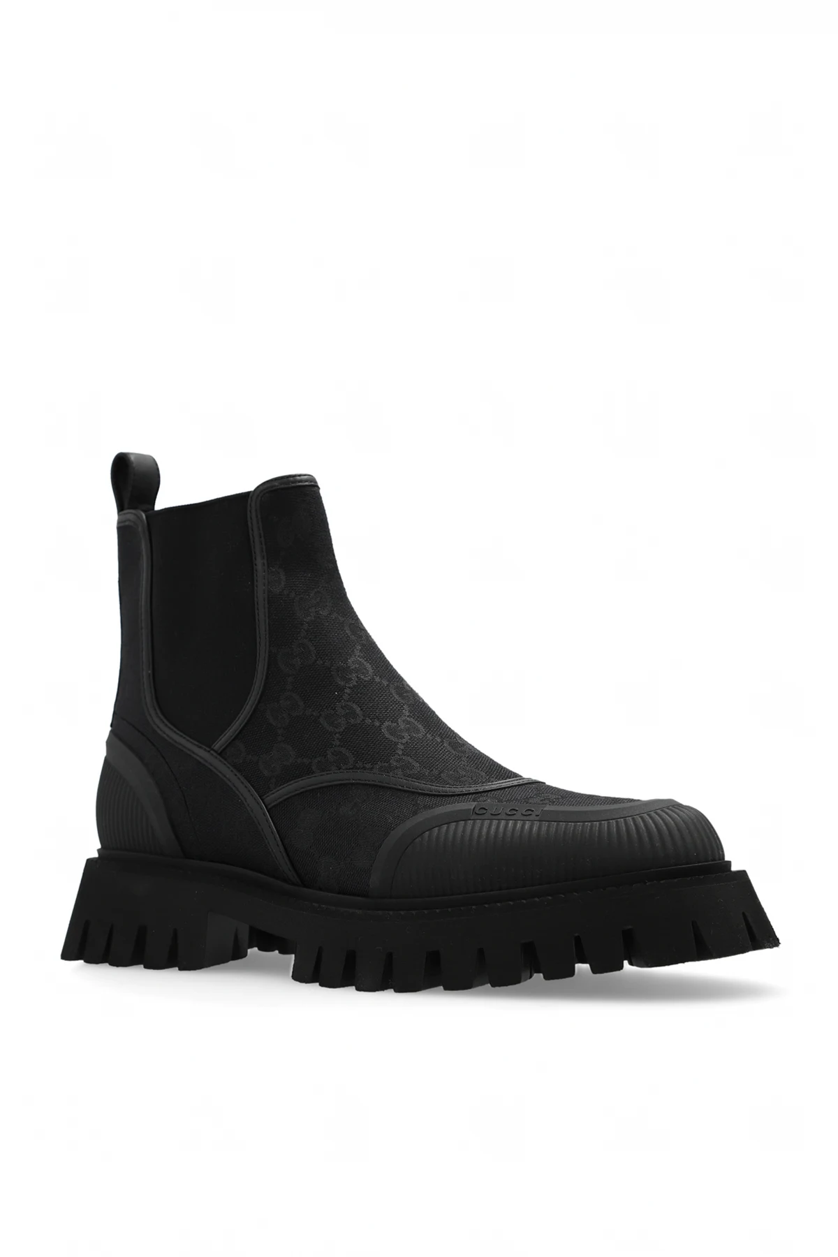 Black ankle boots from Gucci. Made from monogrammed fabric with a slip-on silhouette, this model sits on a black rubber sole and features elastic panels on the sides.