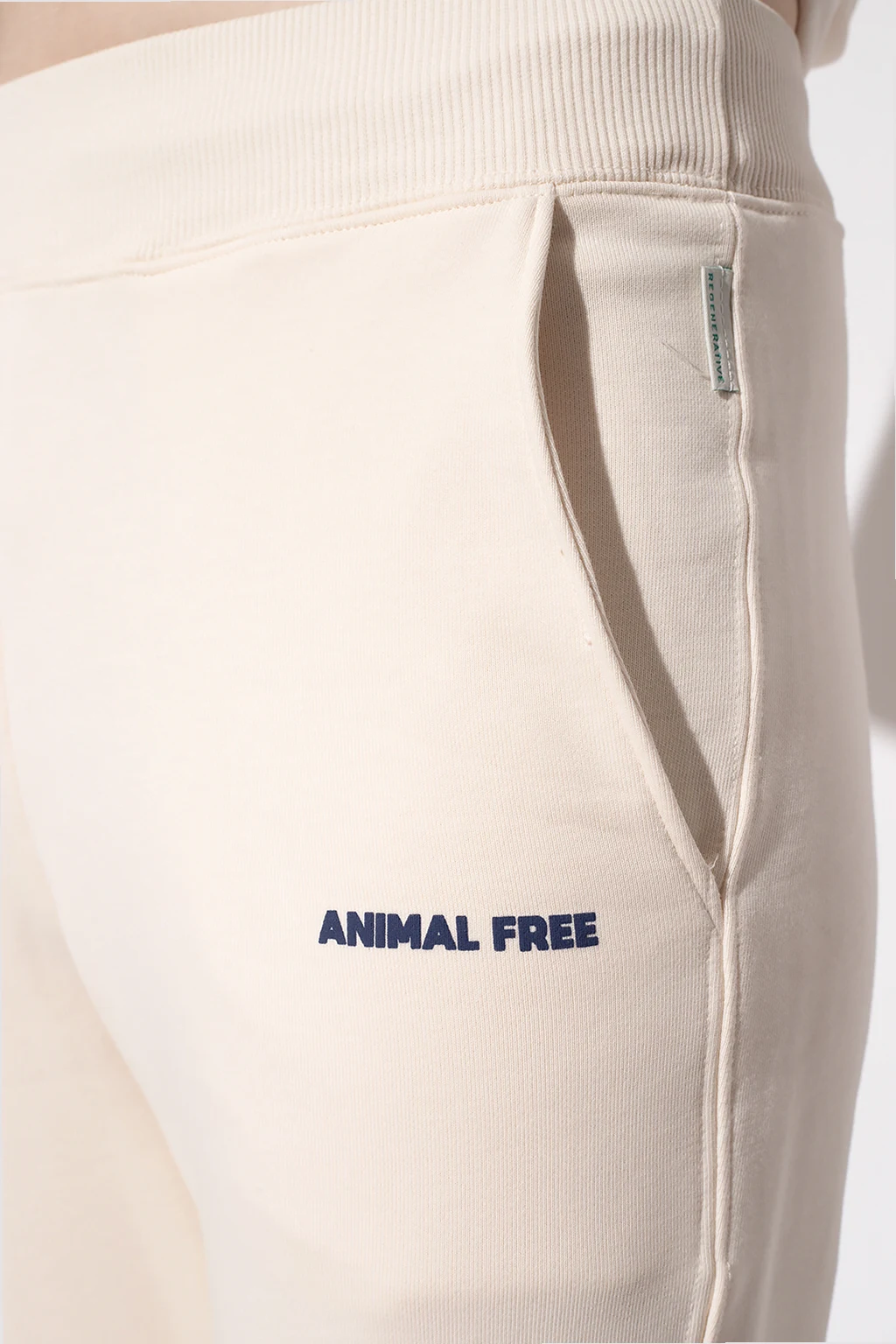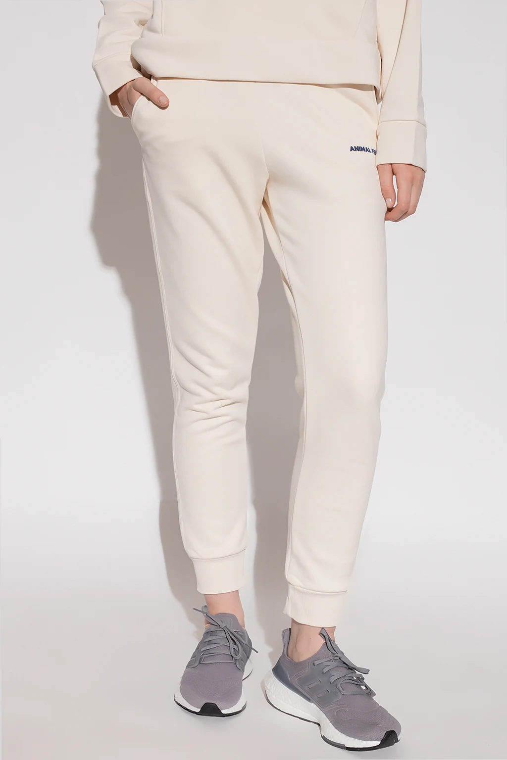 Cream ‘Robby’ sweatpants from Save The Duck. Crafted from a blend of organic cotton and recycled materials, this pair features an elastic waistband with drawstrings, ‘Animal Free’ lettering print, navy logo at the back, two front pockets, one back pocket and ribbed cuffs.