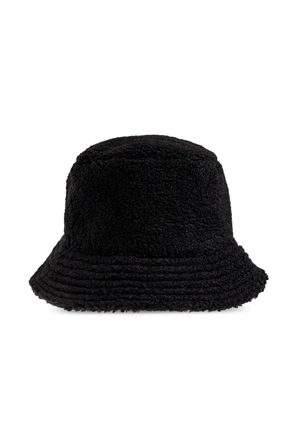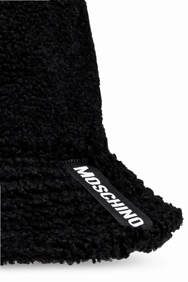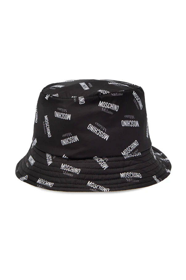Black hat from Moschino. Spun from synthetic yarns, this piece of headwear showcases white logo for the brand recognition.