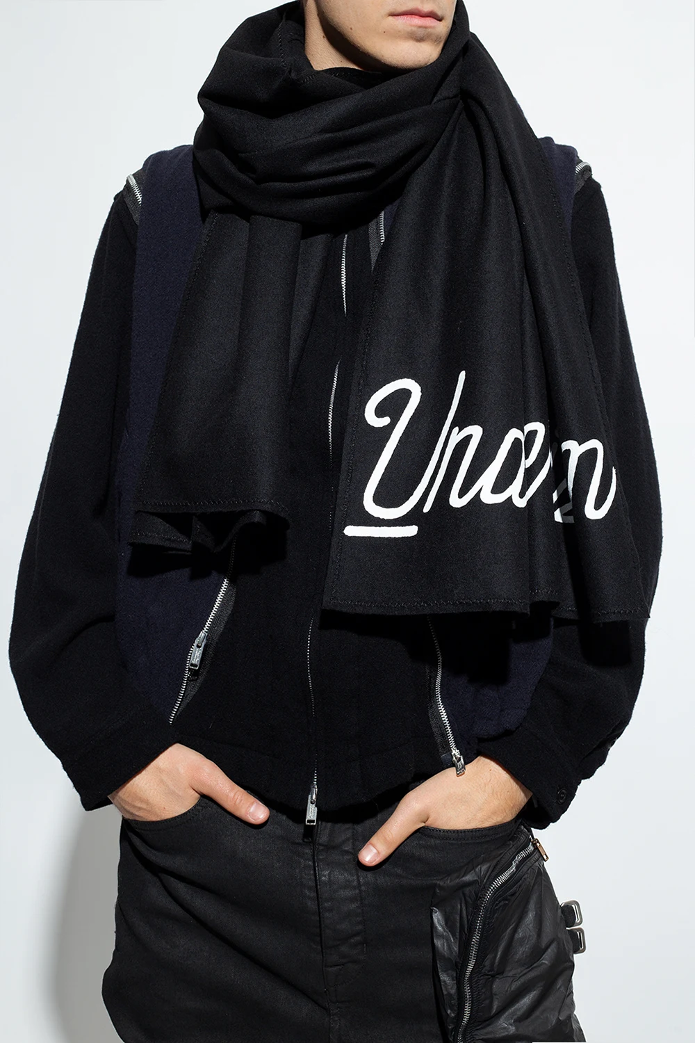 Black scarf from Undercover. Made of wool, this item showcases a white graphic motif with the brand's logo.