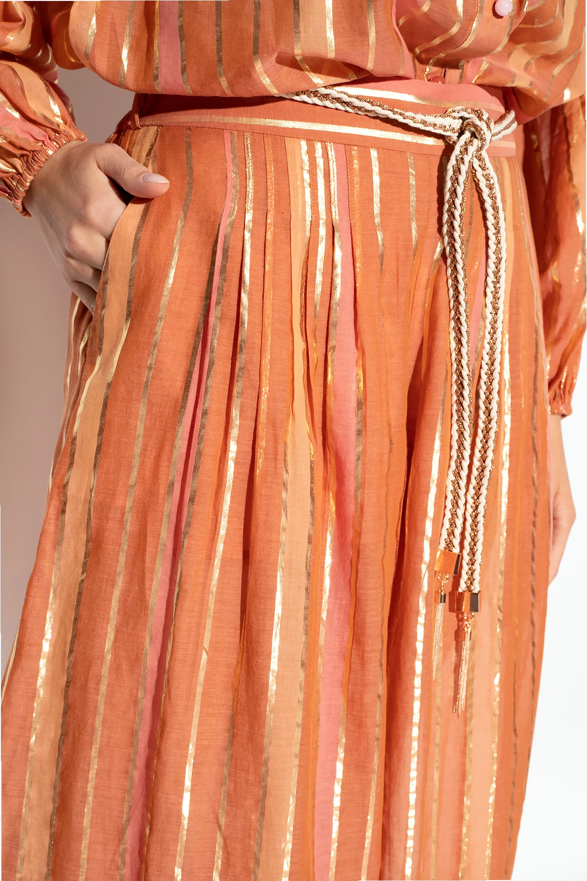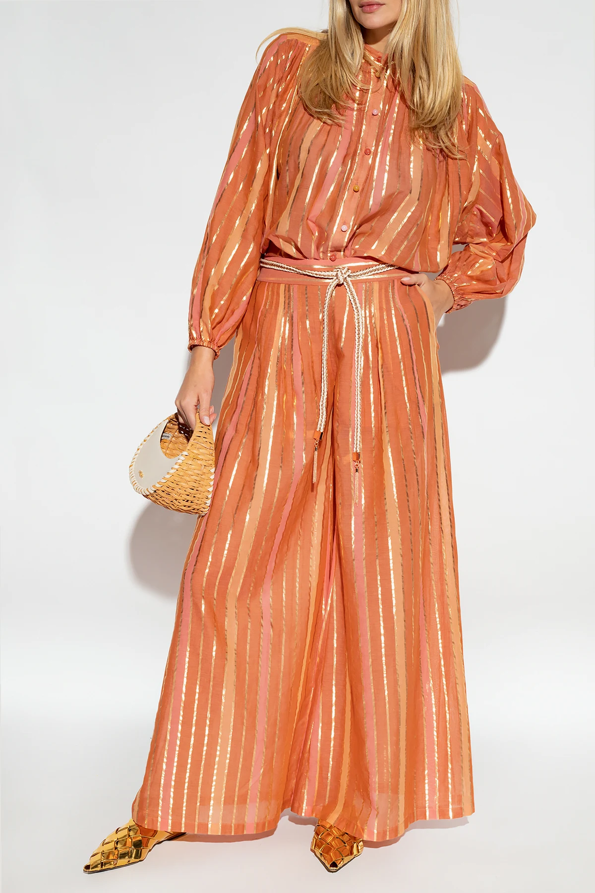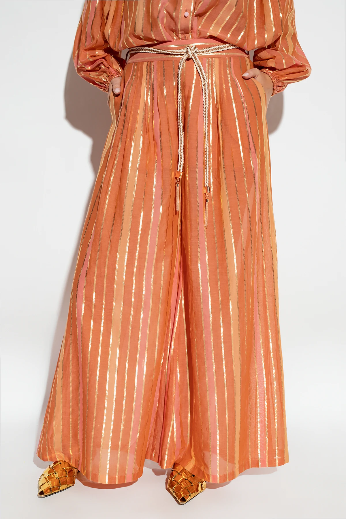 Orange, pink and brown loose-fitting trousers from Zimmermann. Made of cotton, this pair features an elastic waistband, woven belt with fringes, stripe pattern inlaid with gold-tone lurex threads, two slip pockets and wide legs with decorative pleats on the front.