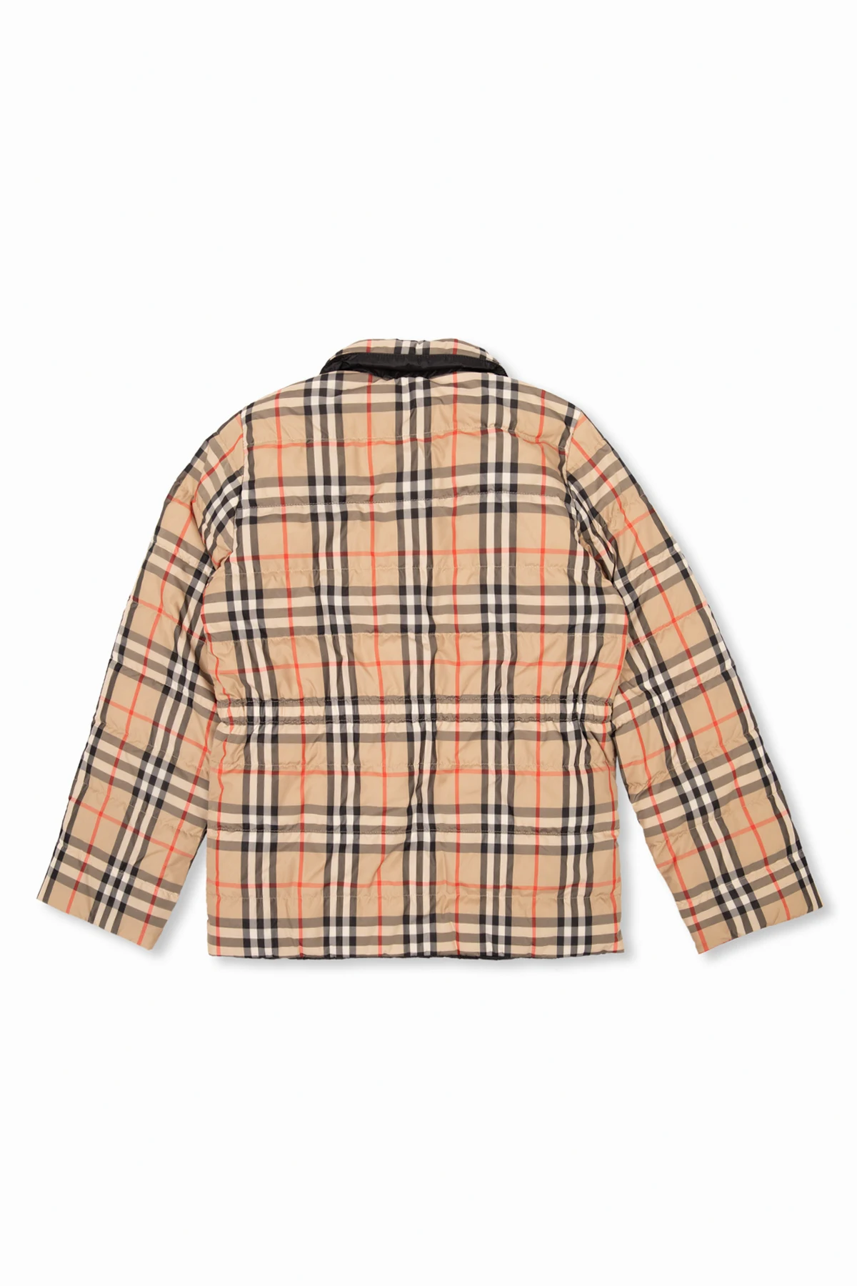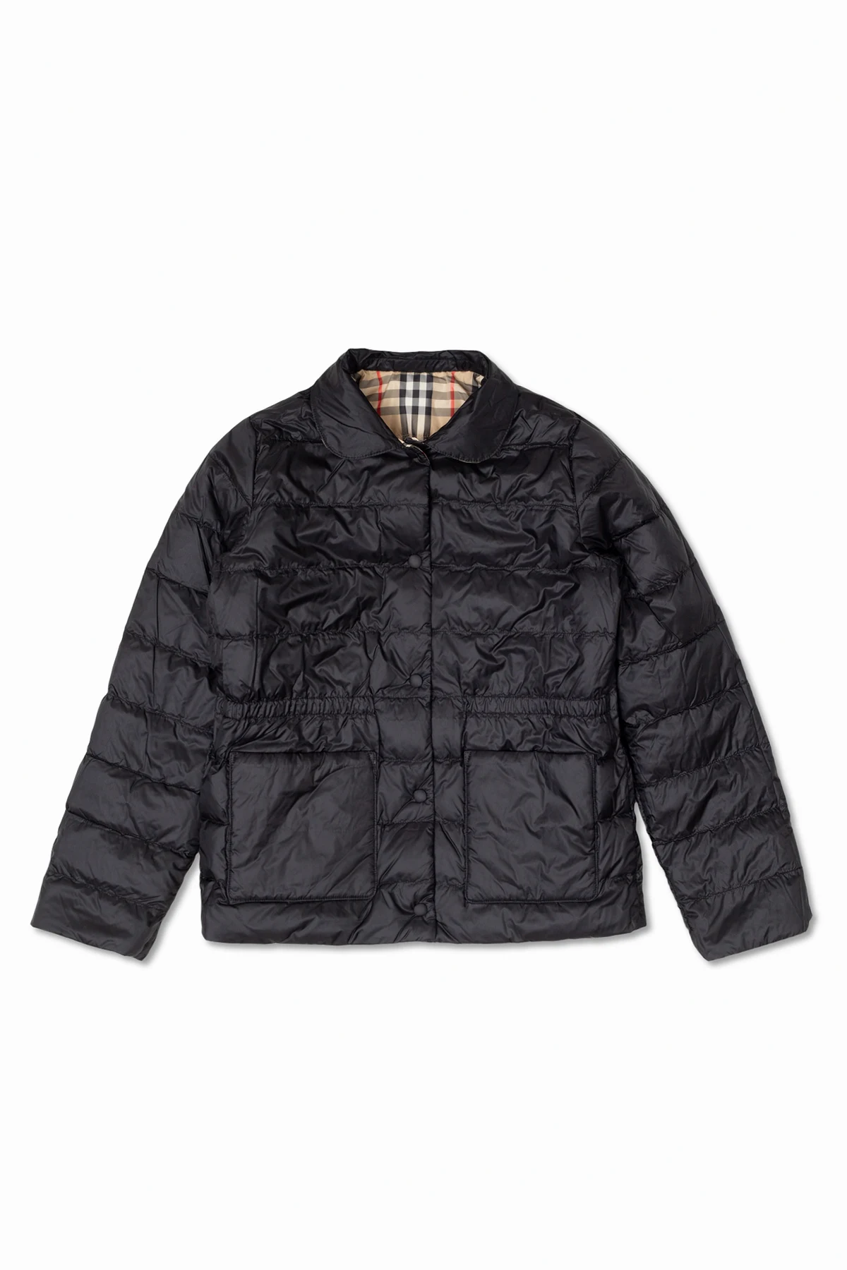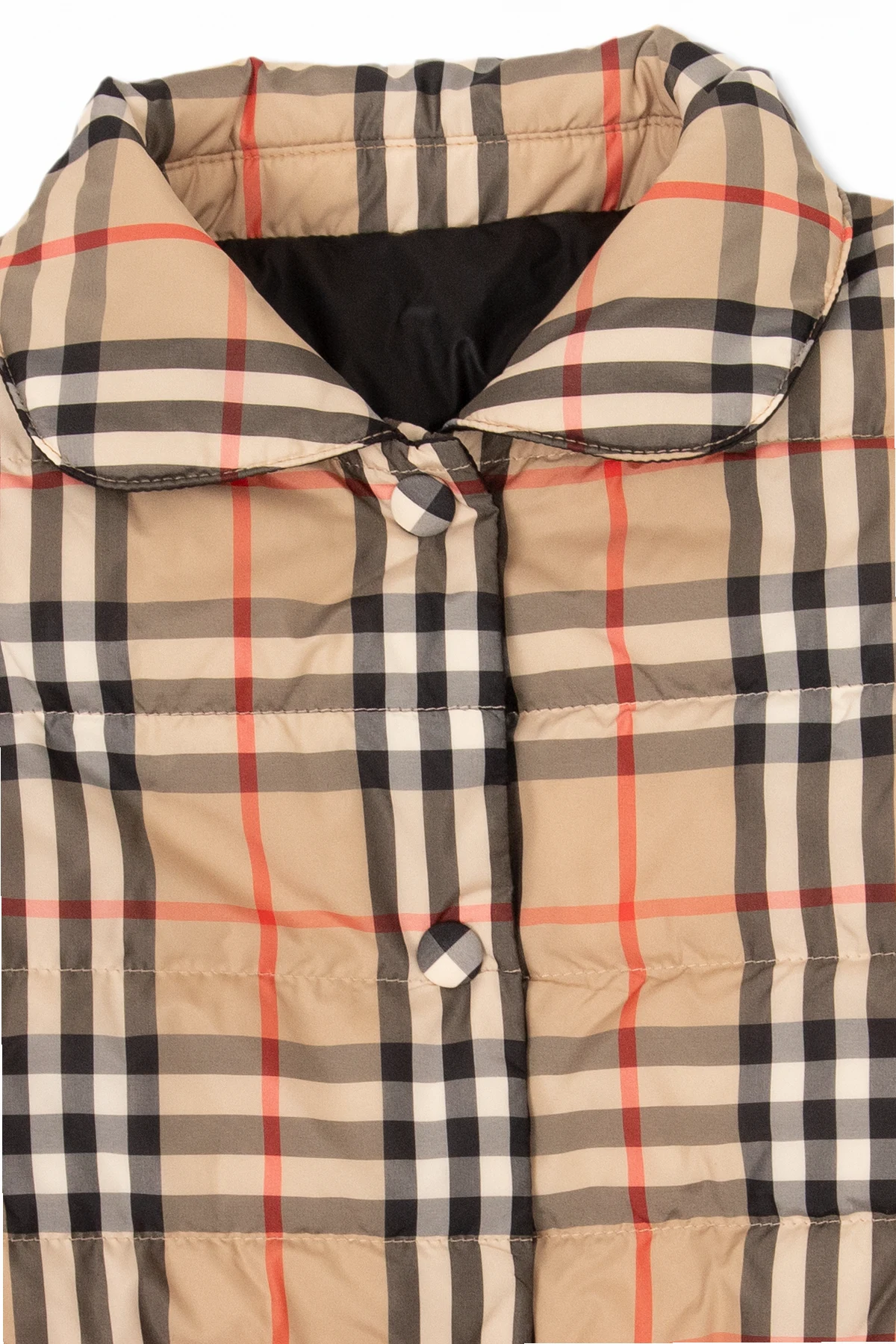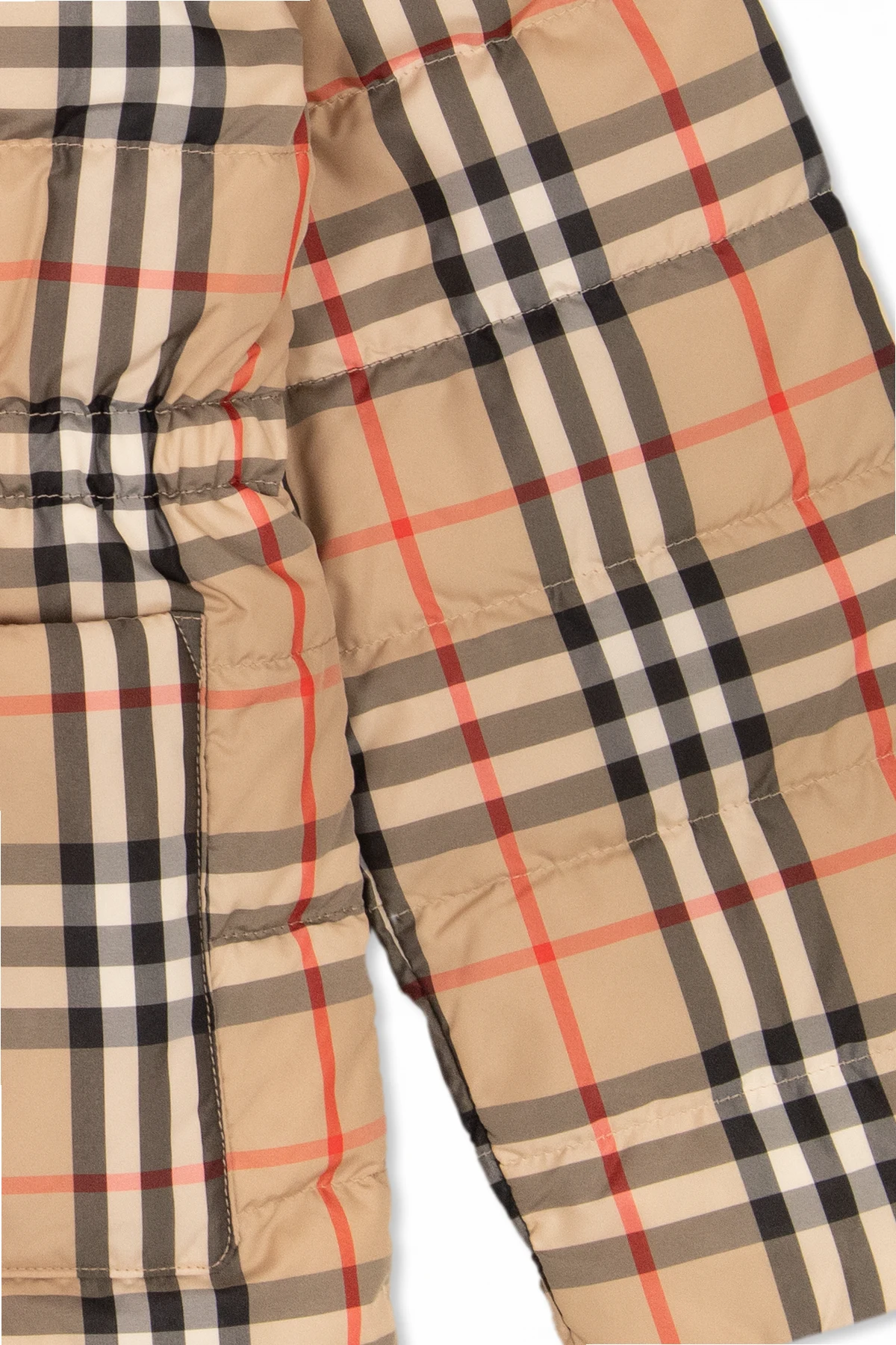 Beige and black ‘Oaklee’ reversible jacket from Burberry Kids. Filled with goose down, this style fastens with snaps and showcases a collared neckline, long sleeves, two slip pockets, quilted detailing and the brand's signature check pattern on one side.