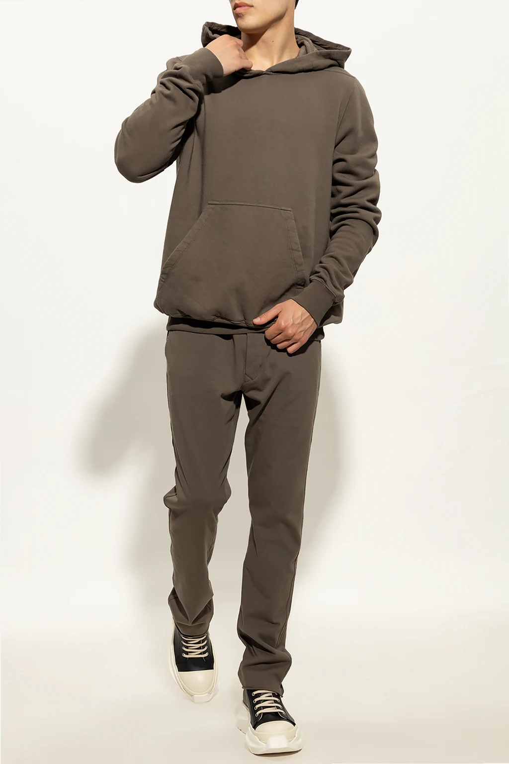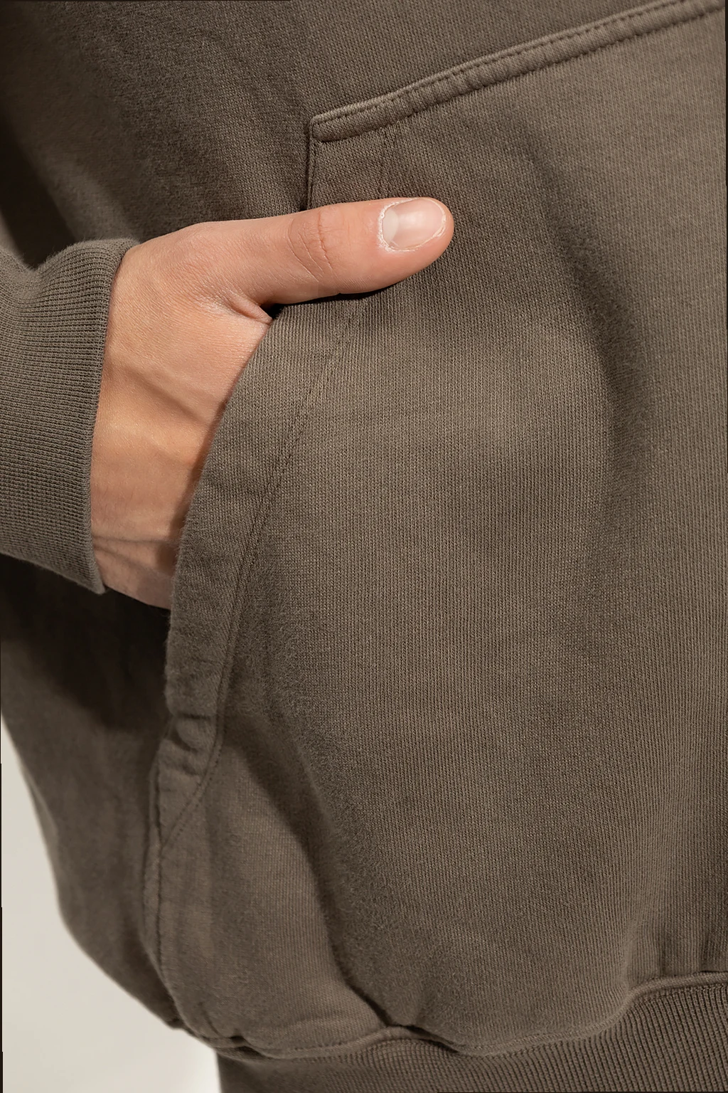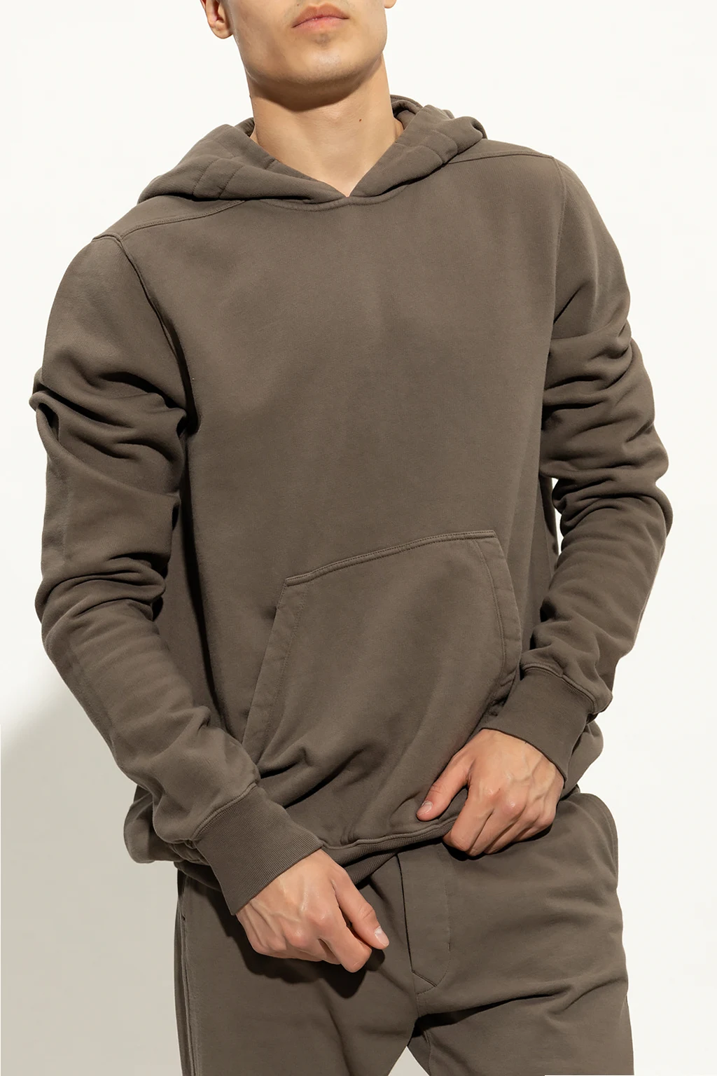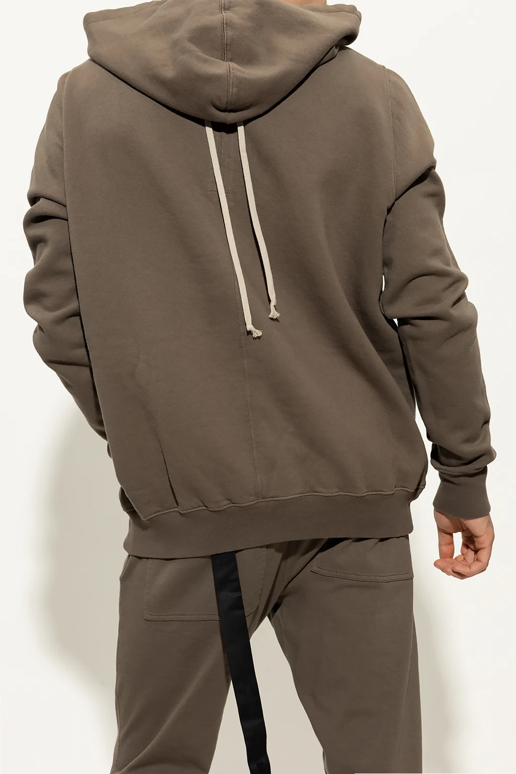 Greyish brown hoodie from Rick Owens DRKSHDW. Made of cotton, this garment is complete with a drawstring hood, slip pocket and ribbed trims at the hem and cuffs.