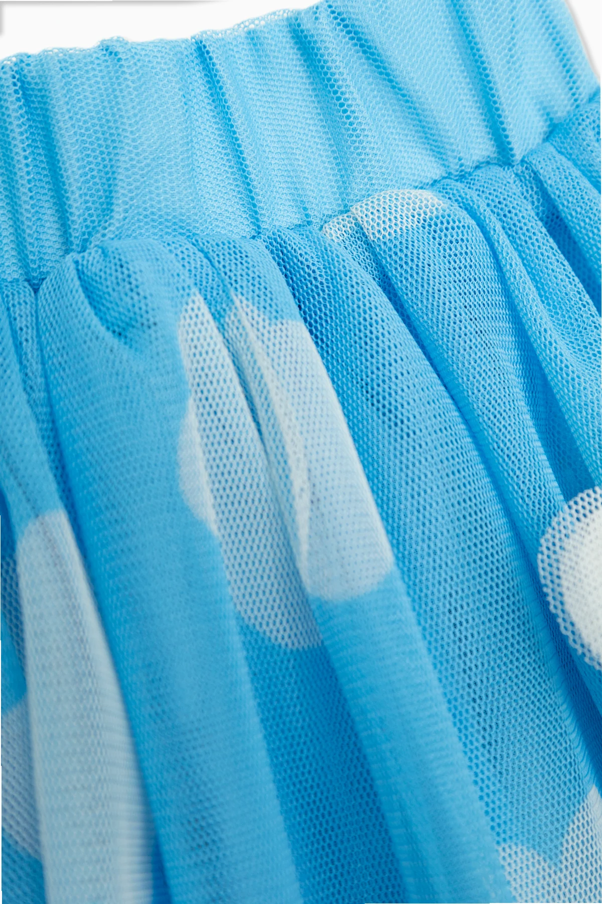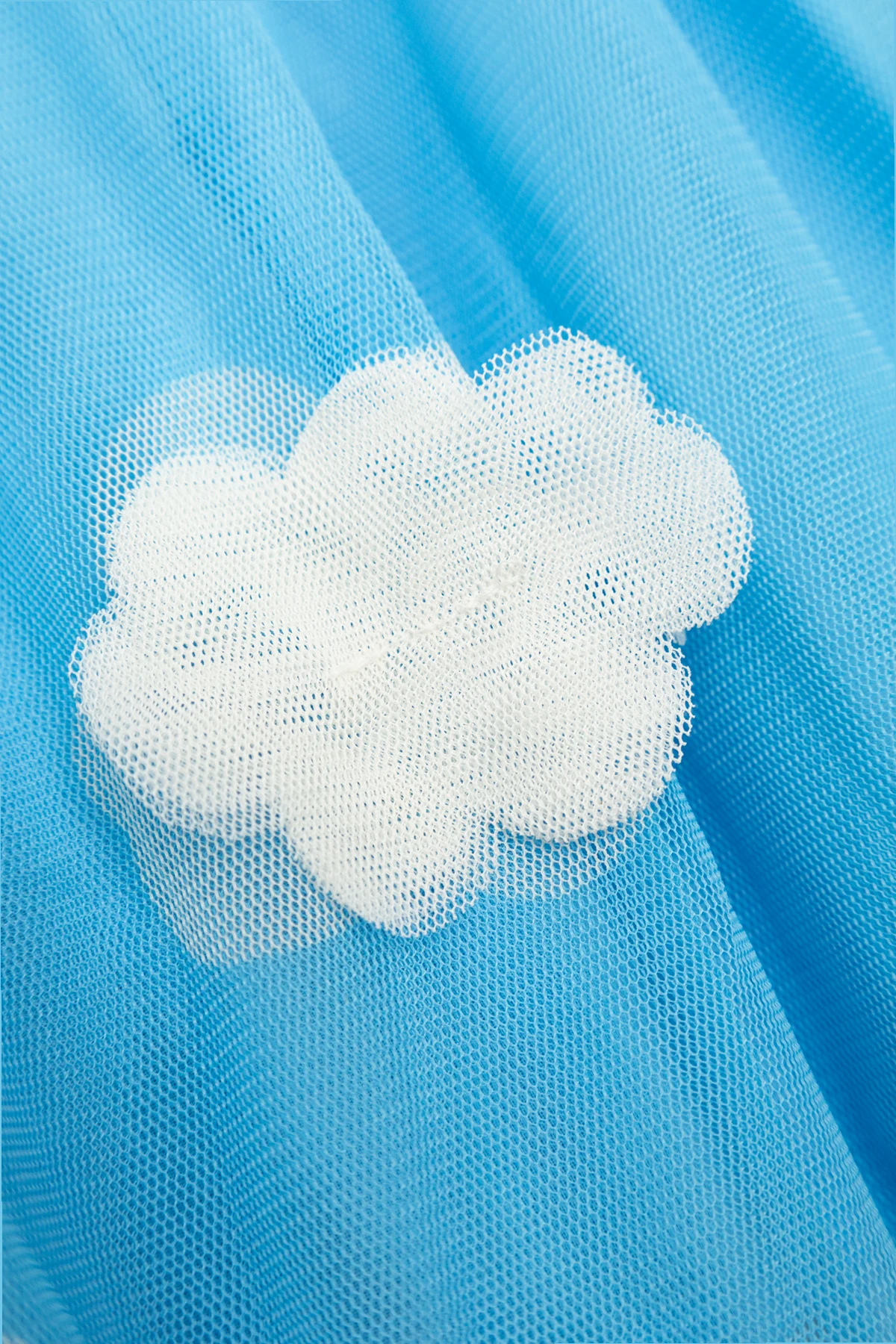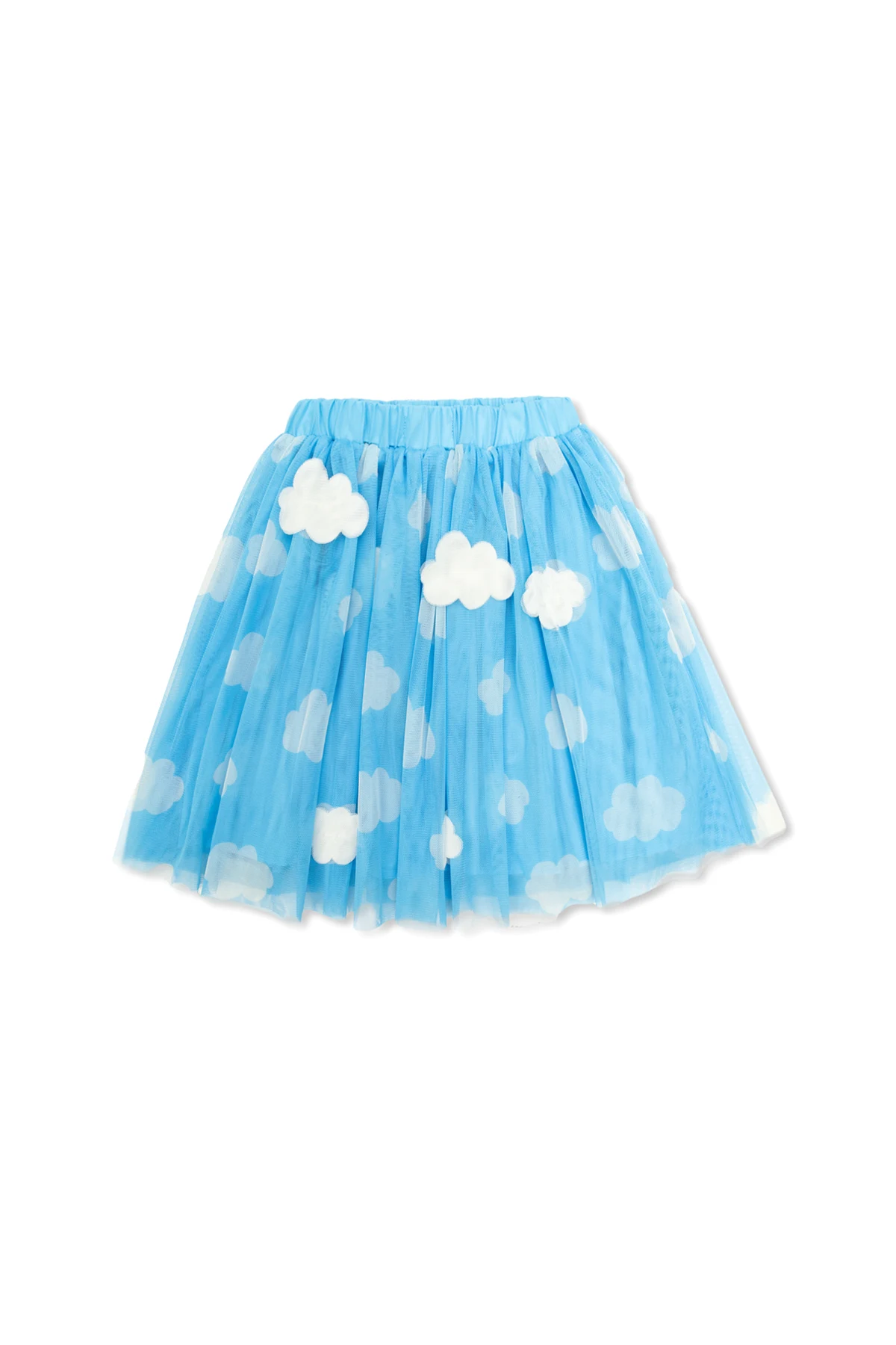 Die dominierende Farbe ist Blau , und die gesamte Oberfläche des Rocks ist mit zarten, weißen Wolken verziert, die ihm Leichtigkeit verleihen. Hergestellt aus hochwertigem Tüll , besticht der Rock durch seine halbtransparente Struktur, unter der sich ein sorgfältig gearbeitetes Futter verbirgt.