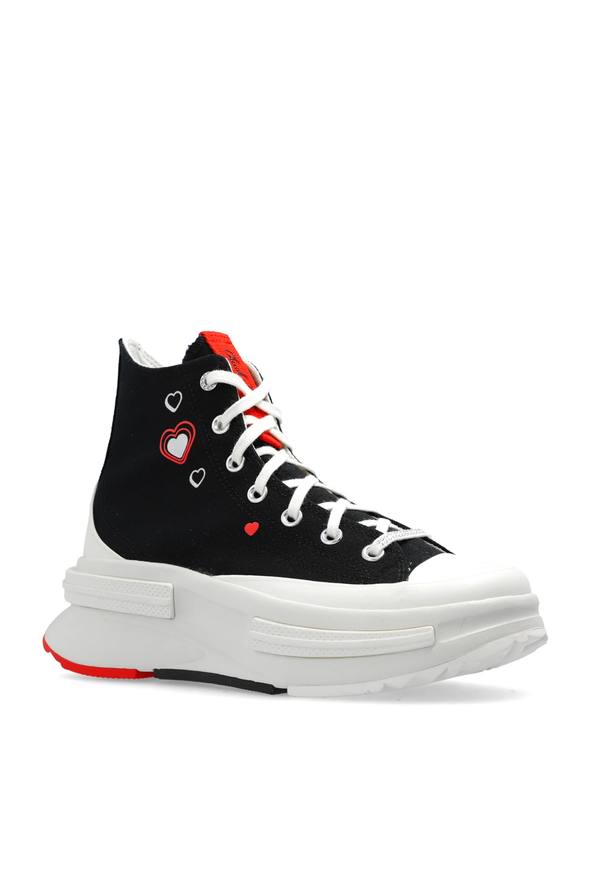 Black ‘Run Star Legacy CX Platform Y2K Heart’ high-top sneakers from Converse. Crafted from canvas, this lace-up pair features a heart print, logo patch on the side, shoelaces with a metal crystal-embellished detail and a rubber sole in white, black and red.